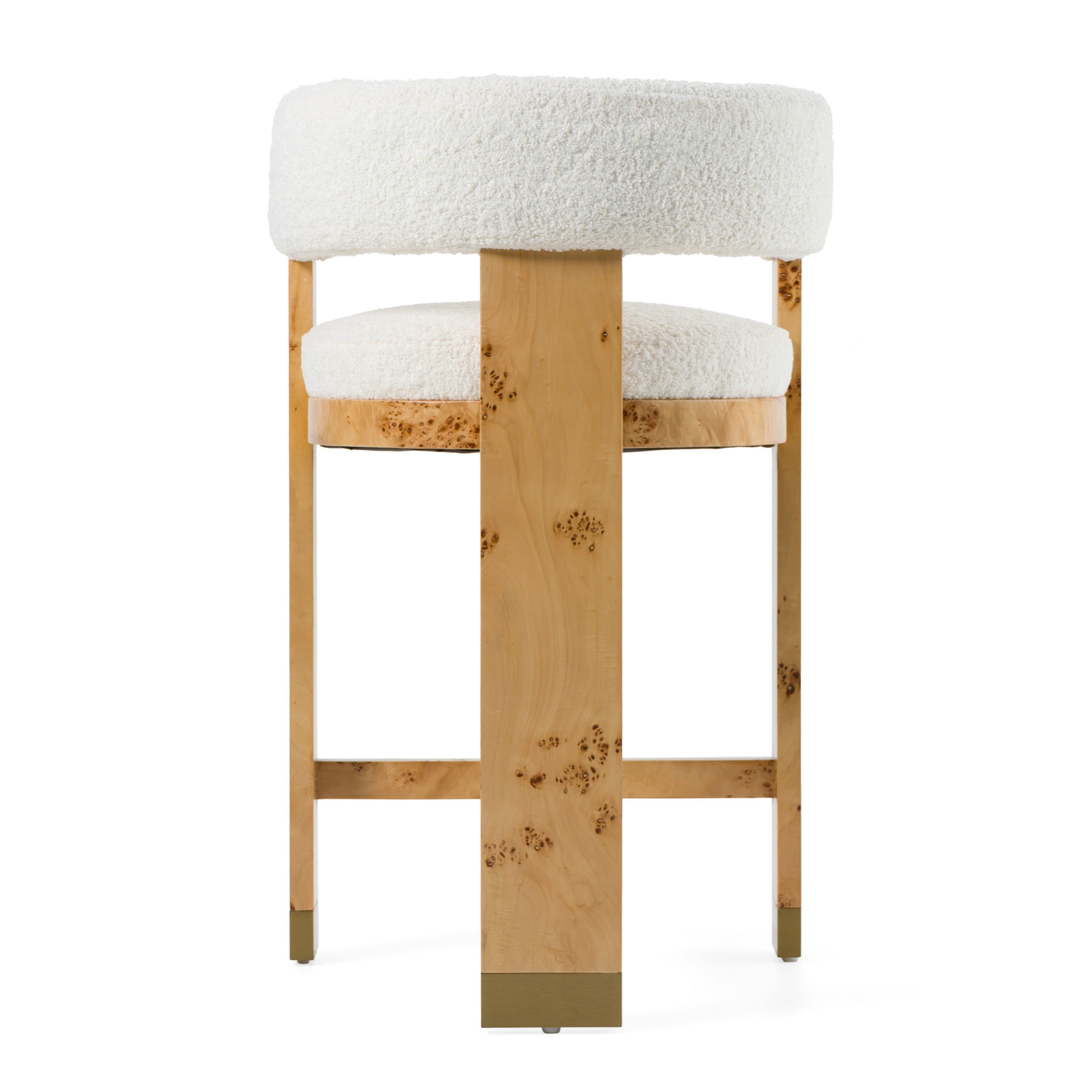 The Modrest Letha Modern Cream Fabric and Burl Counter Chair is an exquisite blend of contemporary design and natural elegance. Upholstered in plush cream fabric, its soft texture is complemented by the unique burl wood veneer that adds organic warmth and character to the piece. The low back and sculpted silhouette create a minimalist, yet sophisticated aesthetic, while brass foot caps add a touch of luxury. Perfect for chic kitchen counters or stylish bar spaces, the Letha chair effortlessly combines comfort with artful craftsmanship, inviting both style and serenity into your home.