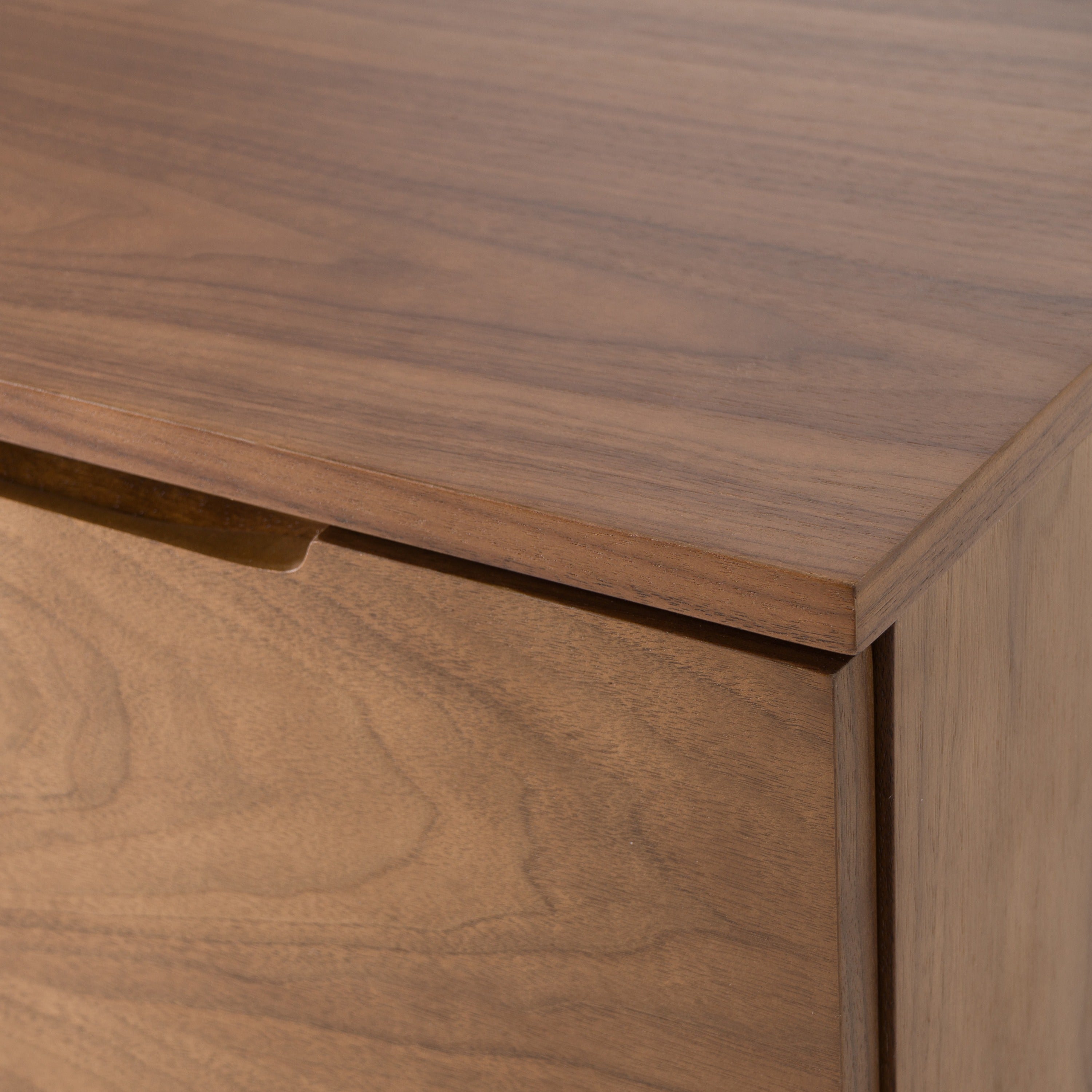 The smooth Walnut Veneer finish of this Modrest Lewis Mid-Century Modern Walnut Nightstand makes it an eye-stealer. Furnished with a single cavernous drawer, it features wood markings on the surface and a rectangular hollowed area on the upper portion of the drawer that functions as drawer pull. Walnut finished solid Rubberwood tapered legs keep this modern nightstand standing on the floor.