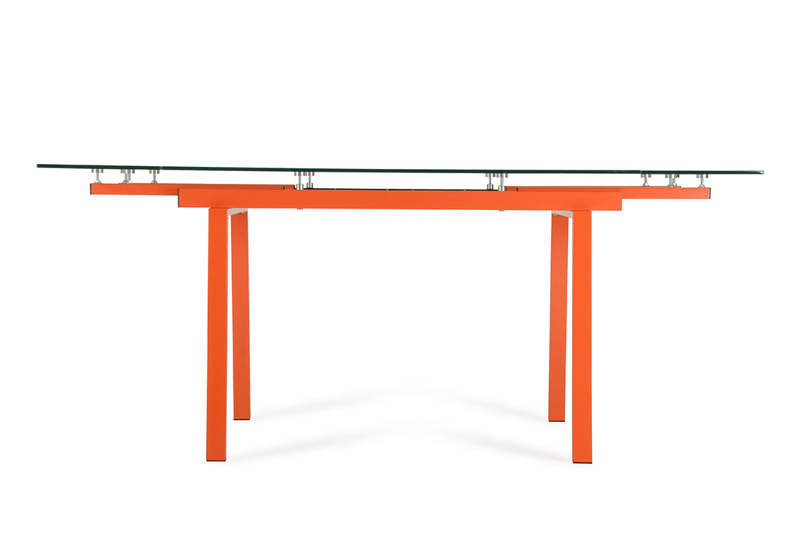 The Modrest Linus Contemporary Glass Extendable Dining Table features an eye-catching combination of materials and color. It features a 10-mm 3-piece clear tempered glass sitting on a powder-coated orange metal frame. This contemporary glass top dining table is capable of sitting more people as it extends up to W47/59/71" x D32" x H30" and requires some assembly.