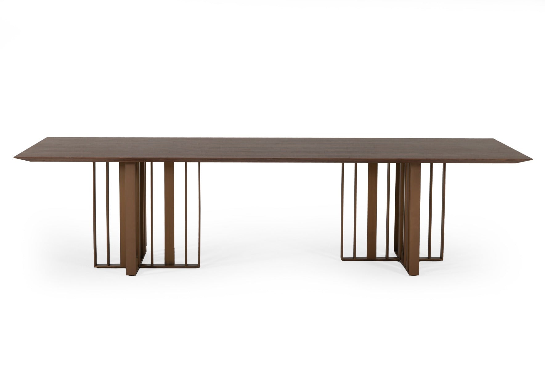 The grandiose style of the Livia Modern Dining table is apparent upon first viewing. The deep Wenge of the oak veneer contrasts perfectly against the gold stainless steel of the base. Two crossed rectangular pedestals make up each leg of this incredible table. The bases also offer slatted detail all covered in that luxurious gold stainless steel. This glam table will fit perfectly in your glam home.