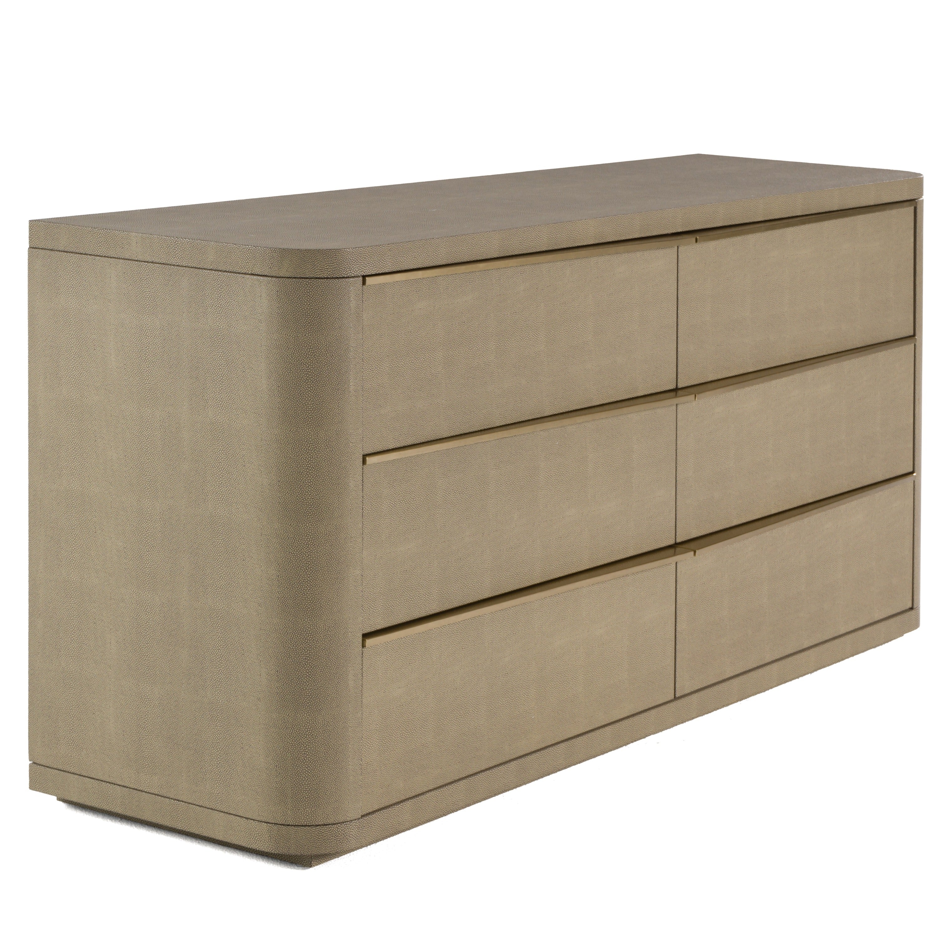 The Modrest Lois Dresser exudes modern sophistication, draped in luxurious beige shagreen upholstery and complemented by brushed brass handles. Its six soft-closing drawers glide effortlessly, adding both elegance and functionality to your space. The seamless curves of the design and the tactile finish evoke a sense of understated opulence, making it a stunning centerpiece in any bedroom. Perfect for those who appreciate refined craftsmanship and timeless design, this dresser enhances the atmosphere of a contemporary home with its subtle yet commanding presence.