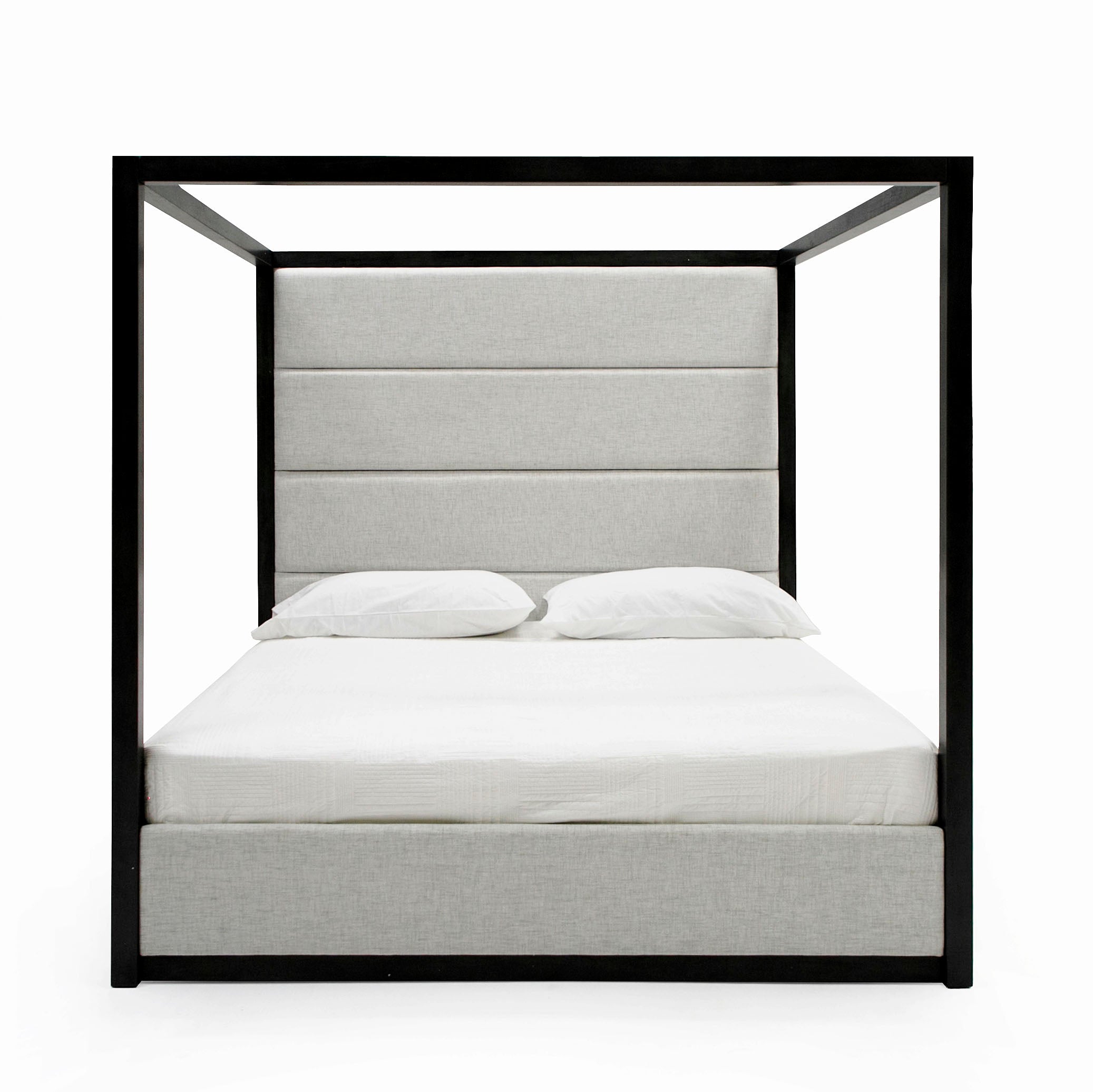 Manhattan Bed is a High Headboard platform Bed with Canopy in combination of Grey Wash Finish and White Fabric. Style it with white drapes for a cozy and private feel.