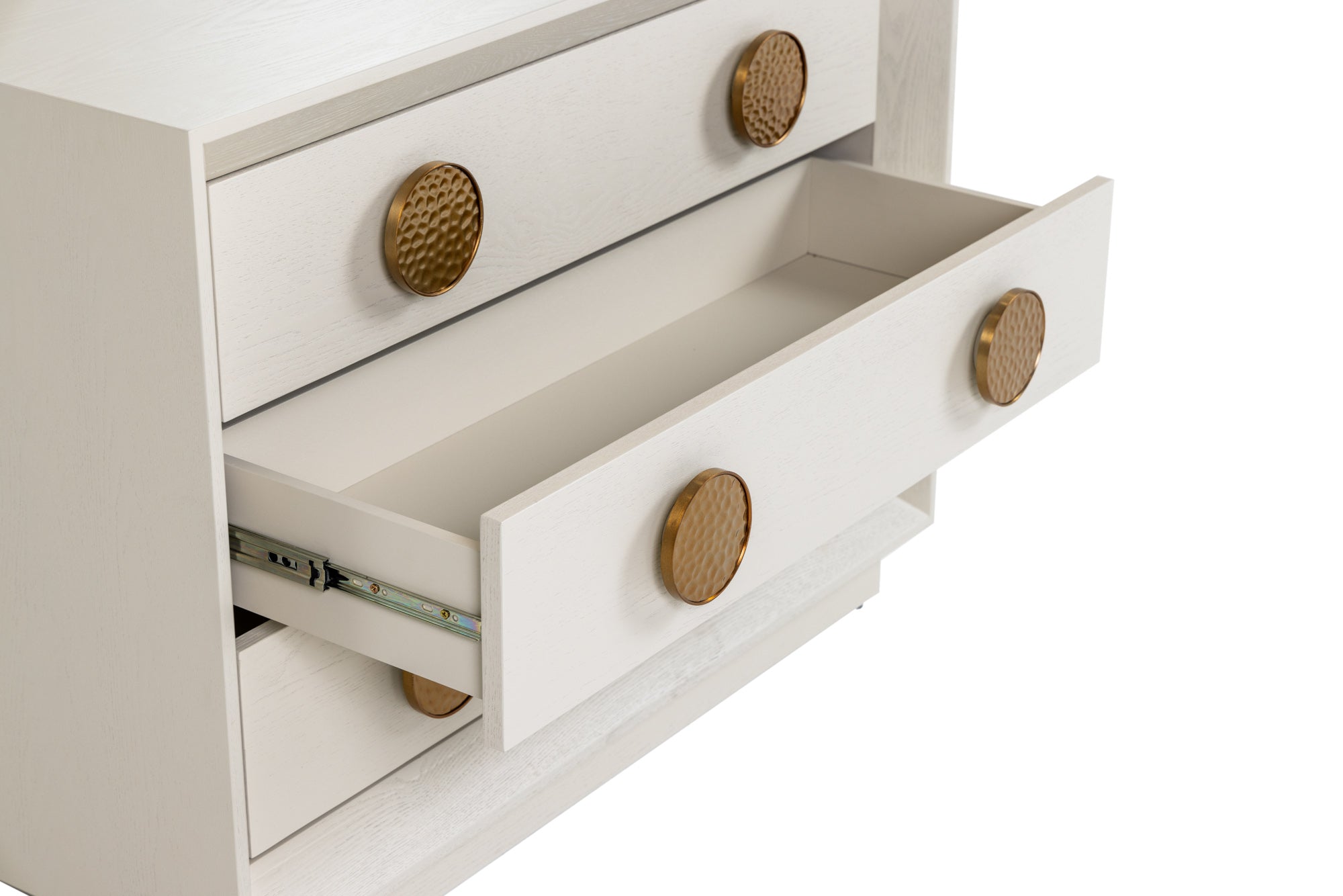 The Marjorie Nightstand will make a wonderful addition to your bedroom! It combines the three elements of good taste: attractive to the eye, made with excellent quality materials and multifunctional. The Cream White Ash Wood with a veneer finish brings a modern and elegant aesthetic to the room and the combination of its three drawers provide plenty of storage space for your bedroom. The Marjorie collection includes a matching Buffet as well as the Modern Walnut & Brushed Gold Rectangular Dining Table.