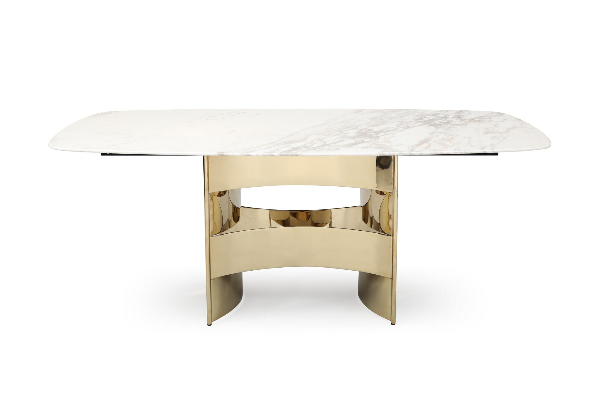 The Marmot Dining Table is a stylish glam piece for your home that is sure to steal the show. A heavy marble top with rounded edges floats on a stylish rose gold trestle base creating a mix of textures and colors that is sure to impress.