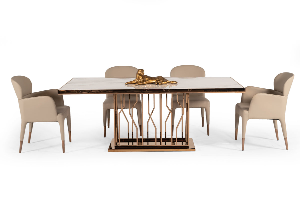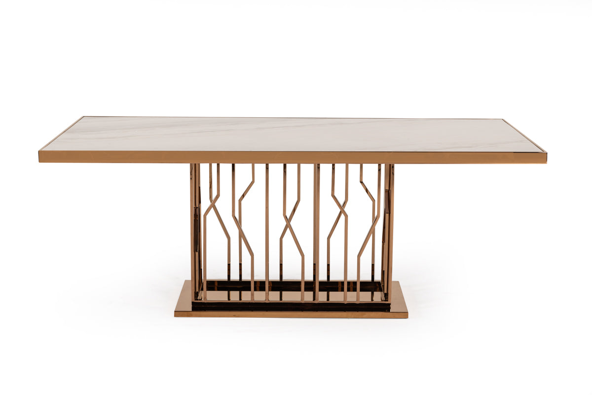 An impressive focal point to gather your family or guests for a sumptuous dinner is the Modrest Marston Modern White Marble & Rose gold Dining Table. Perched on the polished Rose gold stainless steel base is the rectangular white marble table top framed on the same material as the base. Seating 4-6 comfortably, this table features a stylish intricately designed base that stands on a rectangular platform. This modern dining table not only completes your dream modern dining room, as it provides a classy, inviting look evoked by its design and style.
