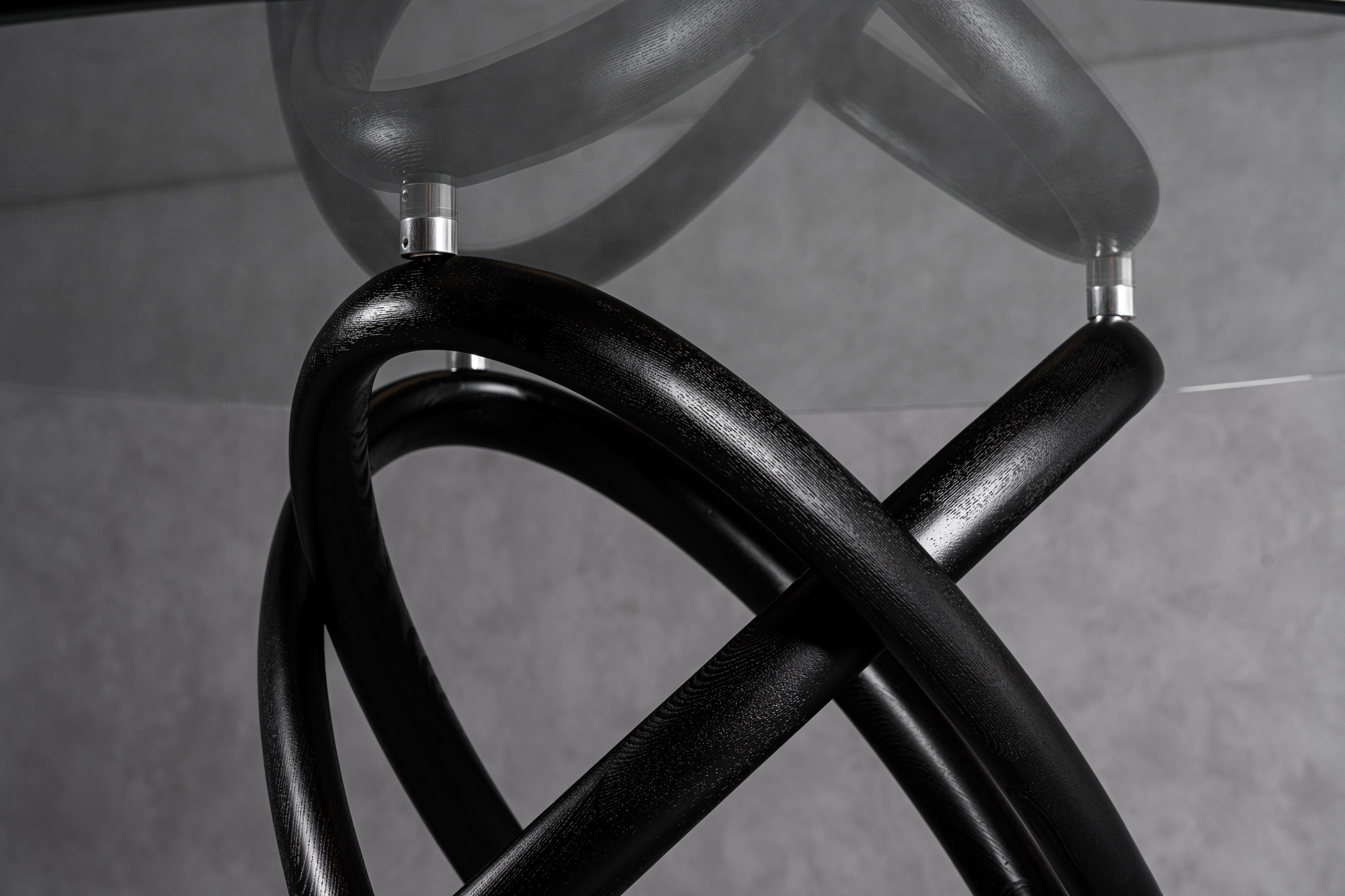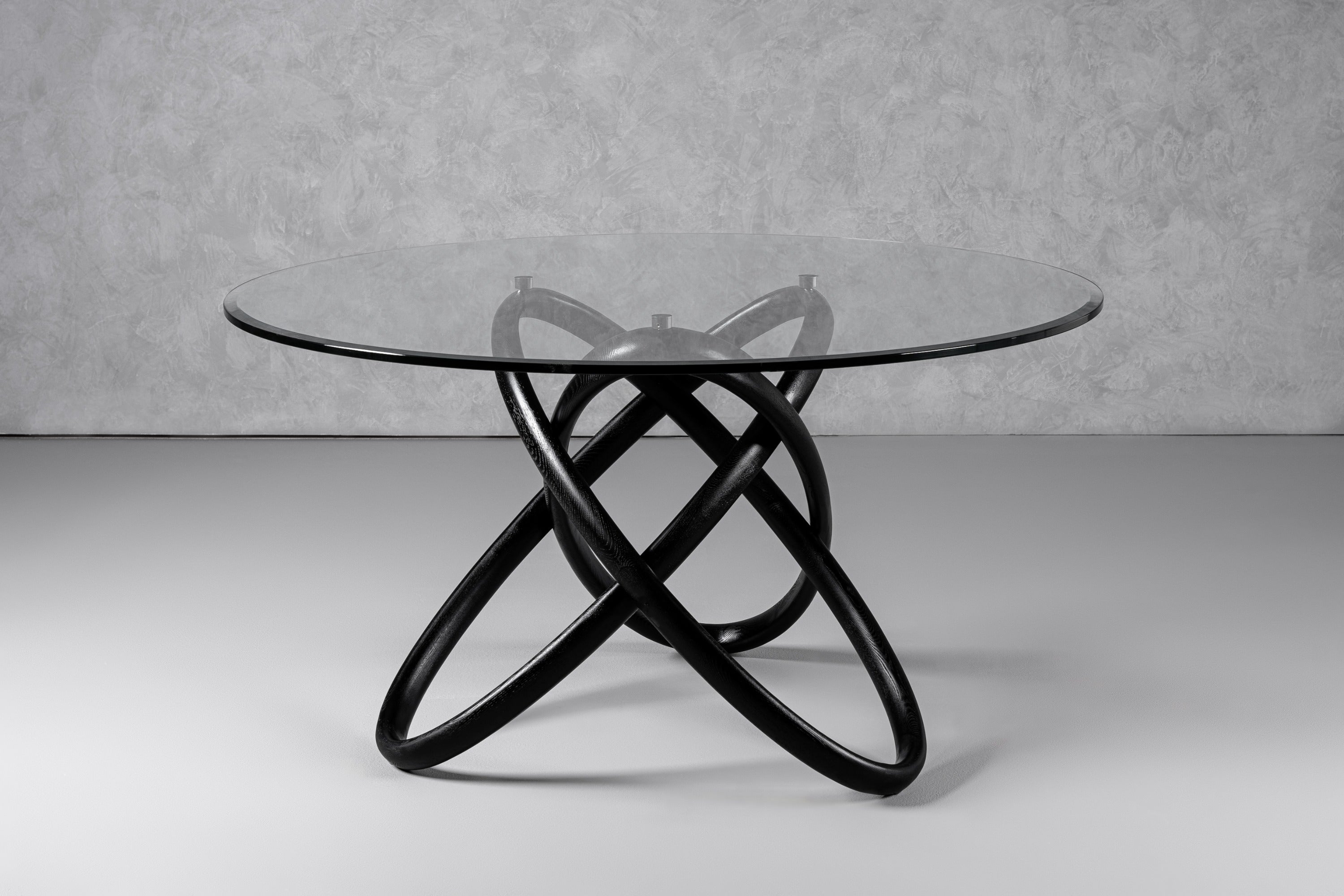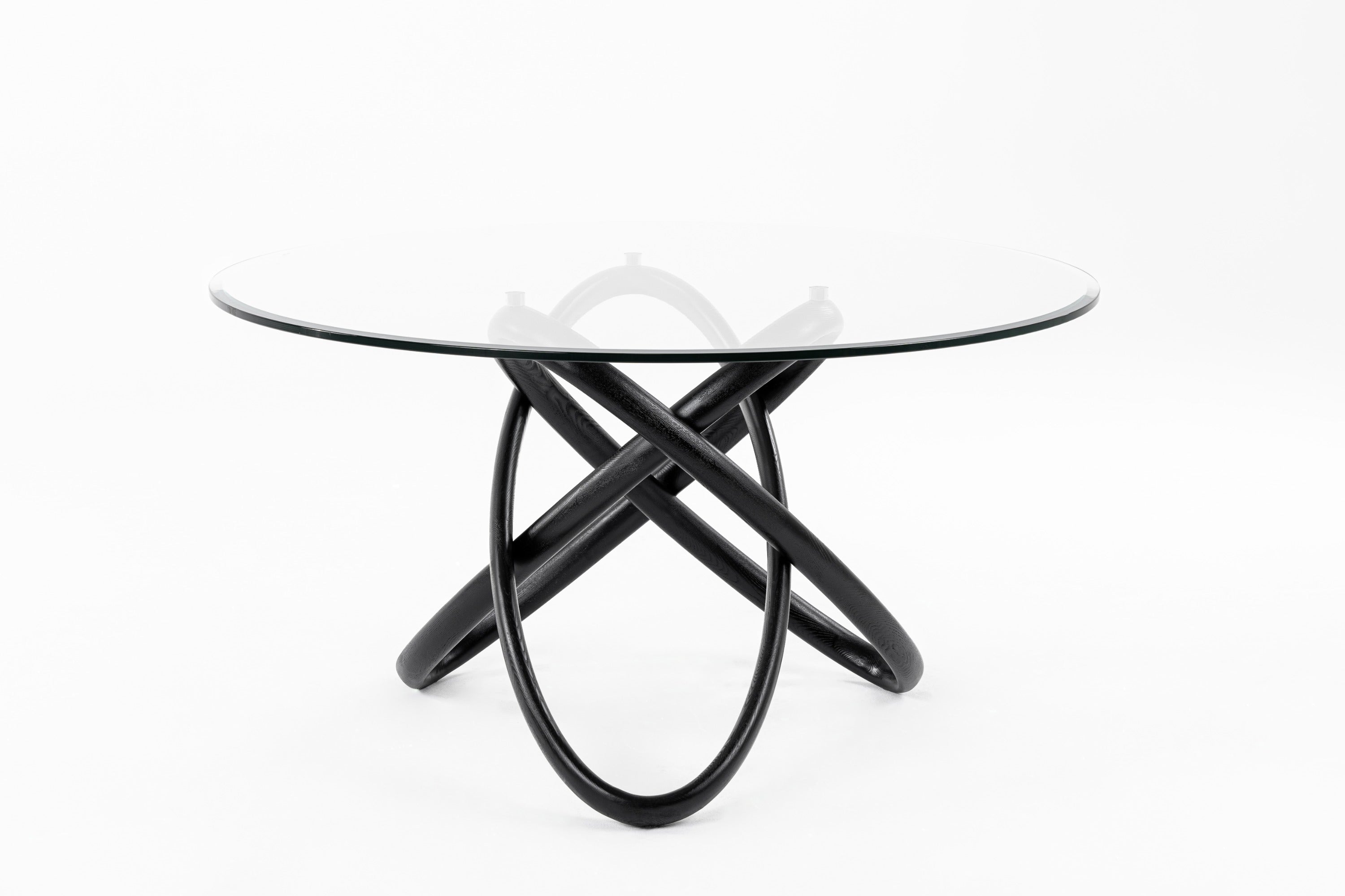 The Modrest Mason Round Glass & Black Ash Dining Table showcases a stunning, contemporary design. Its elegant round glass top is supported by a striking black ash base, characterized by a unique intertwining structure that adds a artistic touch. This fusion of materials creates a sophisticated yet inviting atmosphere, making it an ideal centerpiece for modern dining spaces. The table accommodates up to 4 people, ensuring ample space for gatherings and conversations.