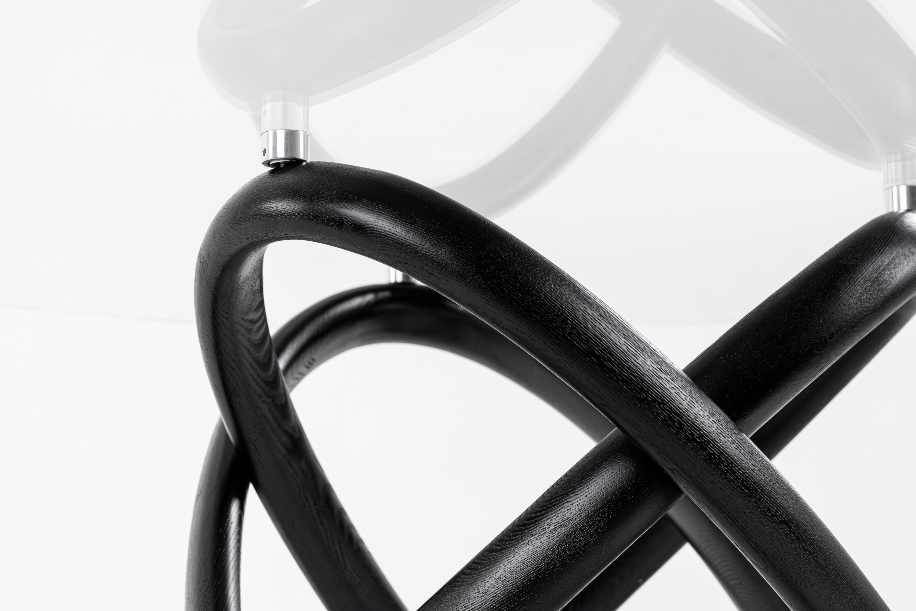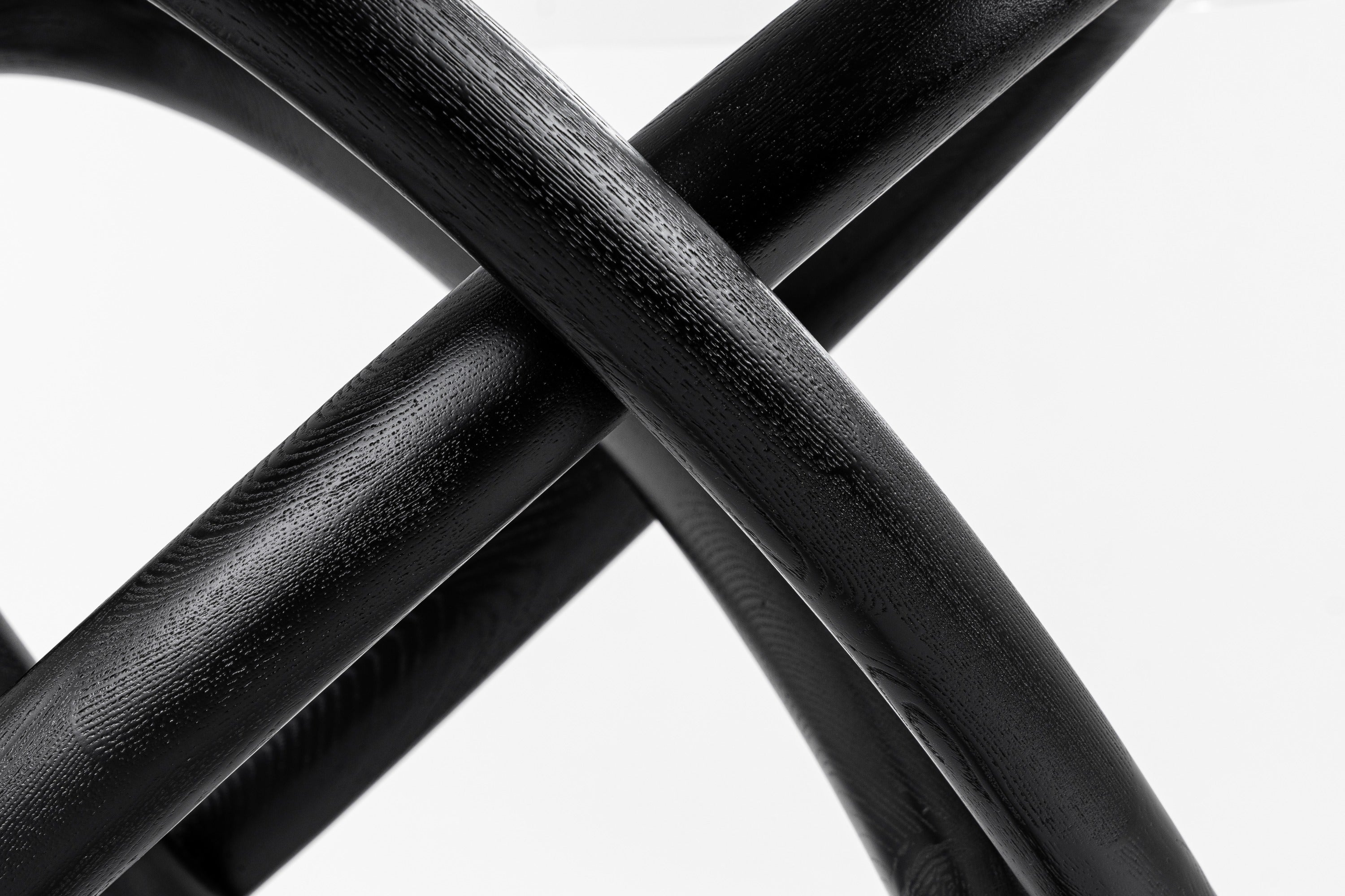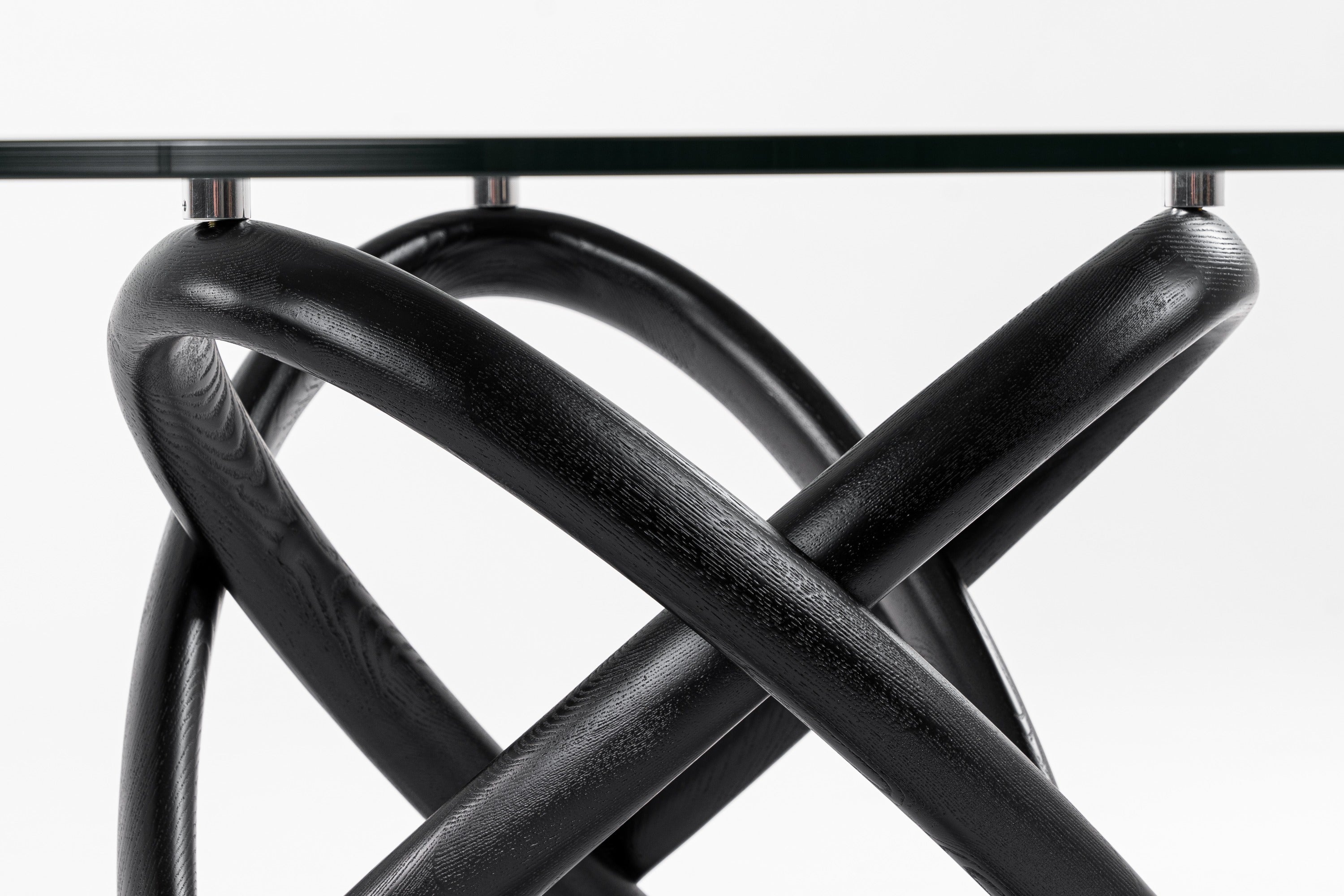 The Modrest Mason Round Glass & Black Ash Dining Table showcases a stunning, contemporary design. Its elegant round glass top is supported by a striking black ash base, characterized by a unique intertwining structure that adds a artistic touch. This fusion of materials creates a sophisticated yet inviting atmosphere, making it an ideal centerpiece for modern dining spaces. The table accommodates up to 4 people, ensuring ample space for gatherings and conversations.