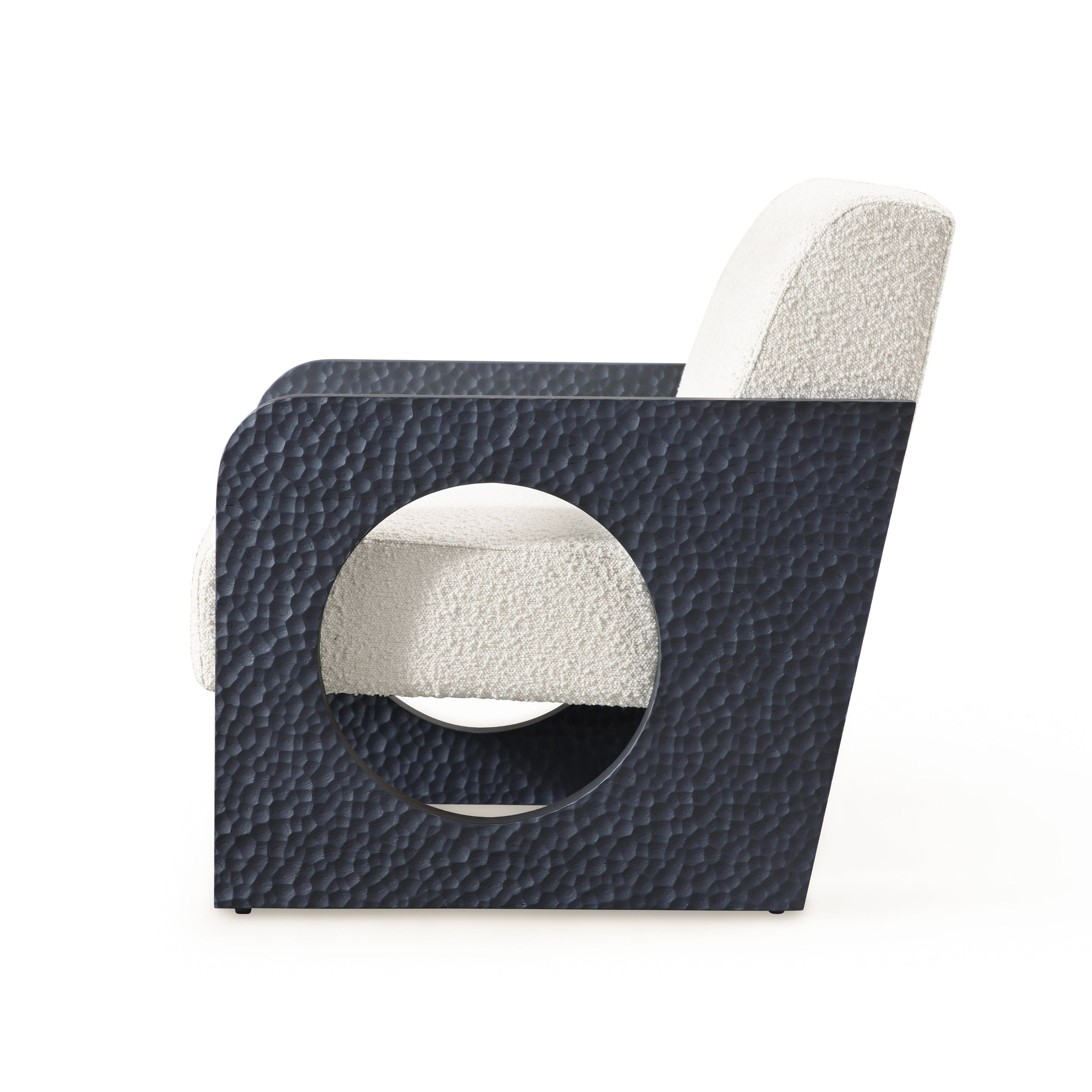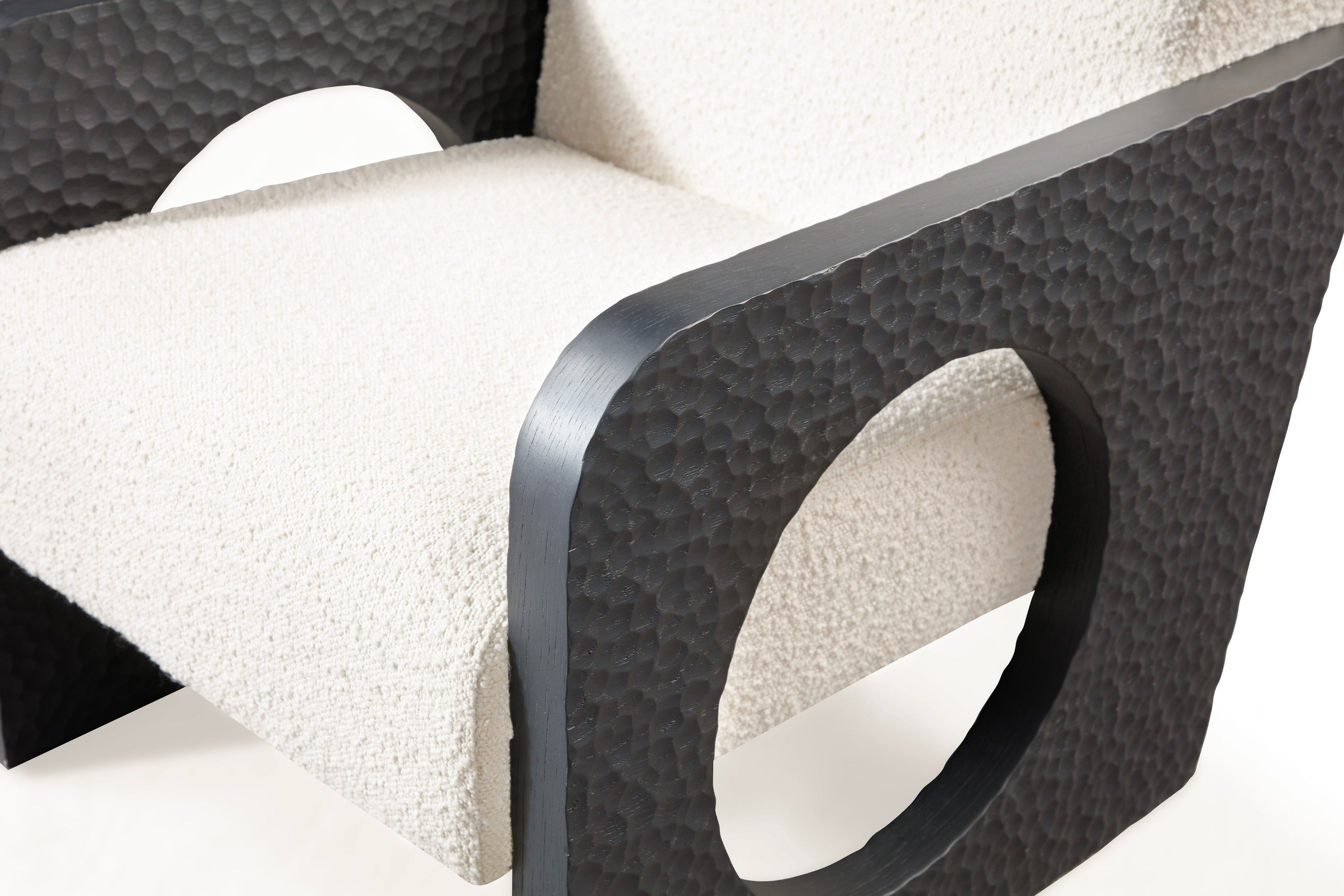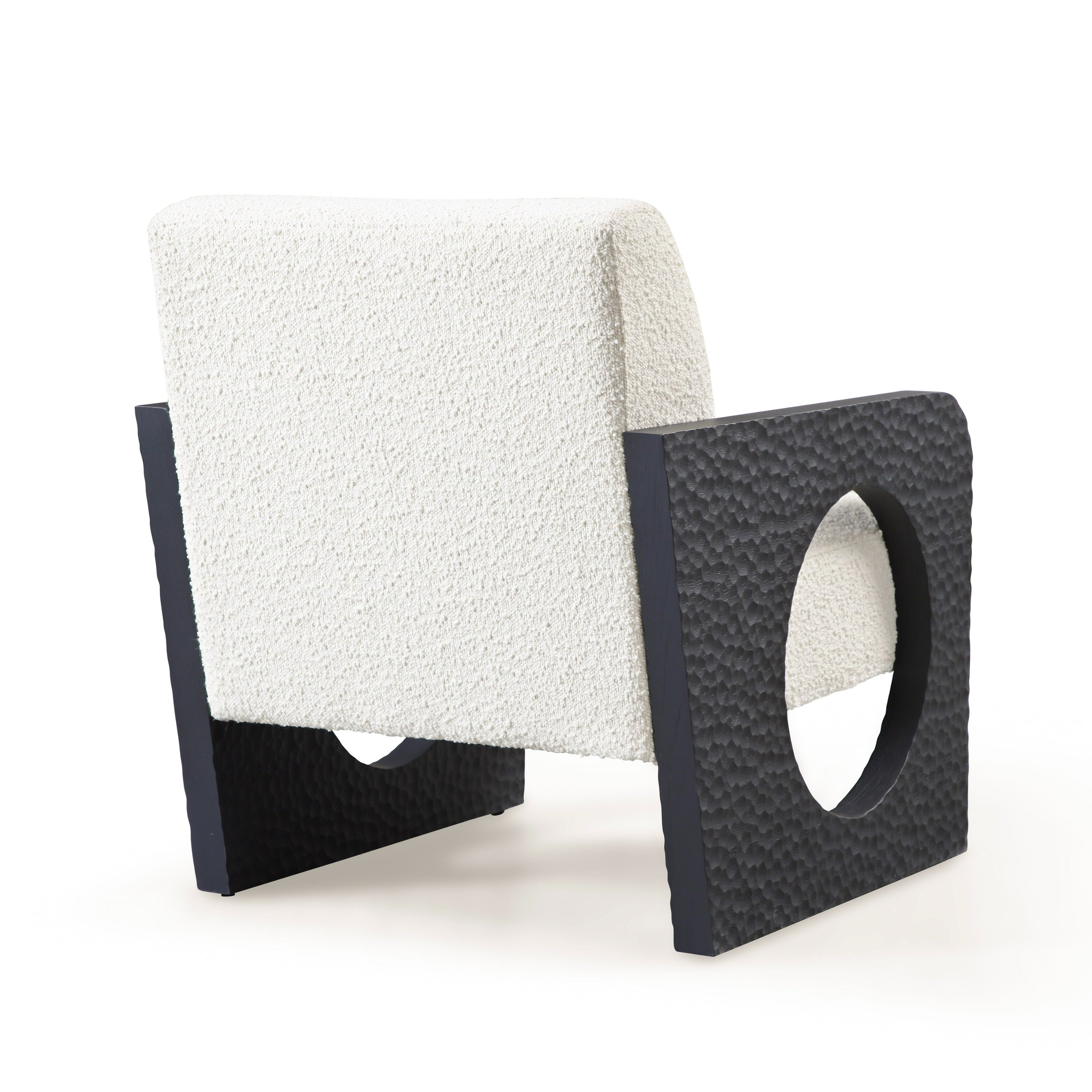 The Modrest Midland Accent Chair features a striking modern design characterized by its off-white fabric upholstery and bold black oak accents. The chair s unique silhouette showcases a soft, textured seat and back, paired with artistic armrests that incorporate circular cutouts, adding a contemporary touch. Its harmonious blend of colors and textures makes it a standout piece for any stylish interior, perfect for enhancing living spaces with a chic, inviting aesthetic.