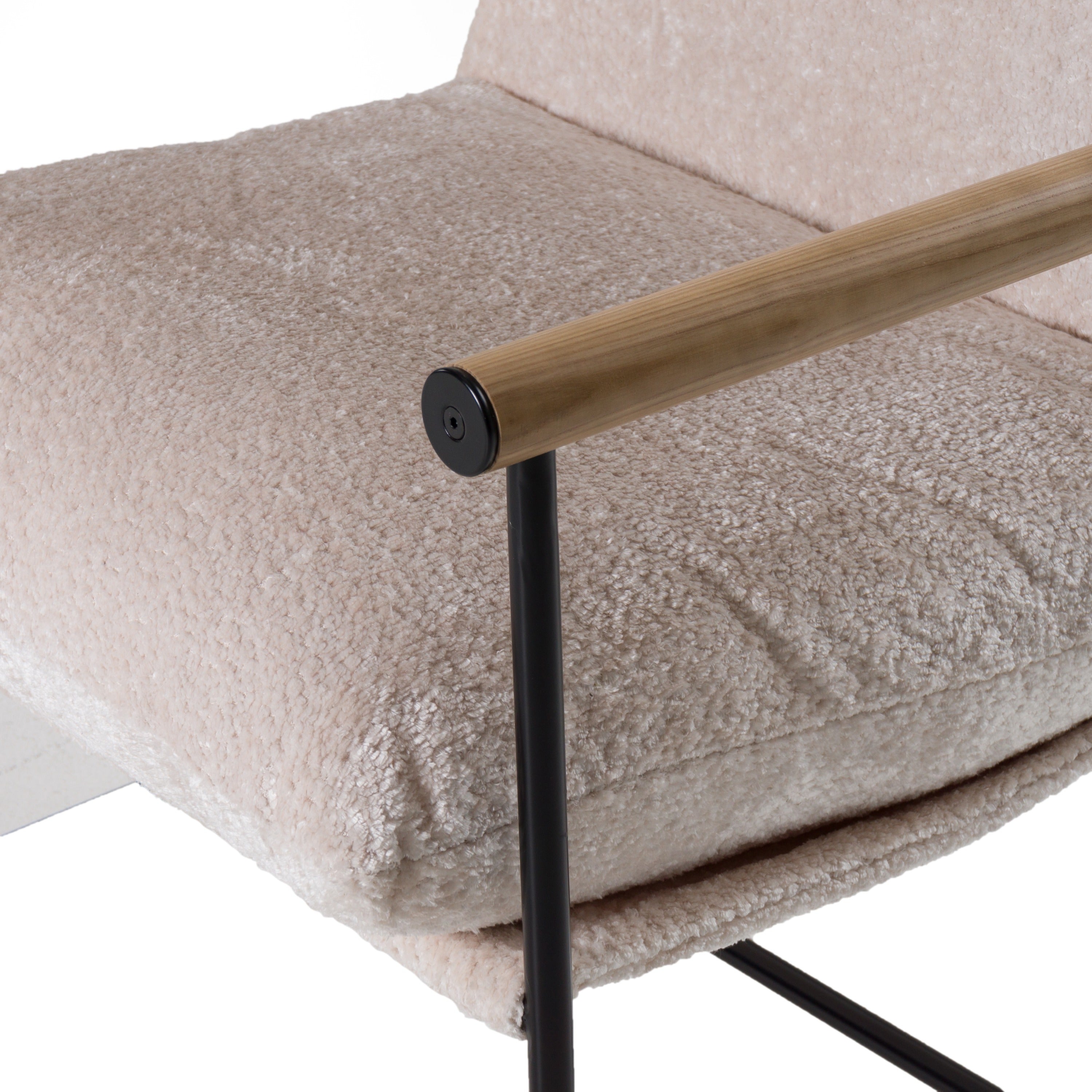 The Modrest Moorcroft Modern Beige Fabric Accent Chair effortlessly combines mid-century modern elegance with contemporary comfort. Wrapped in soft, beige fabric, its sleek silhouette is enhanced by minimalist black metal legs and warm wood armrests, creating a perfect harmony between industrial and natural elements. The generously cushioned seat and back offer a cozy retreat, while its airy design adds a touch of sophistication to any living space. Ideal for those who appreciate timeless design and subtle luxury, the Moorcroft chair brings both style and tranquility to your modern home.