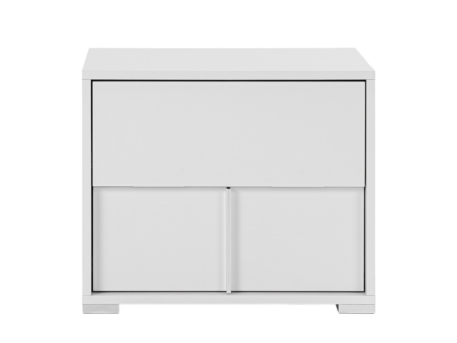 The Modrest Nicla Italian Modern White Nightstand shows fluidity in design featuring a sleek white gloss finish with chrome accents as pulls. It features 2 soft-closing drawers. Fully assembled, this modern nightstand stands on cubed chrome legs and has a dimension of W24" x D16" x H21".