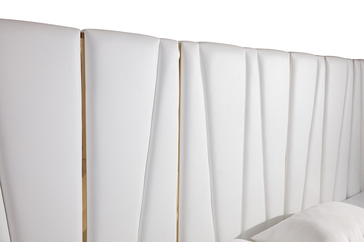 Luxurious and lavish characterizes the Modrest Nixa Modern White Bonded Leather & Gold Bed. A massive modern bed upholstered in dainty white bonded leather; it features a wide headboard that states it is the central figure in your bedroom. Extending on both sides of the bed, the headboard features champagne gold stainless steel lateral accents on the front and side frame. Intermixed with these accents is diagonal channeling that supports the first-class look of this modern bed. Keeping your mattress in place is the slatted sunken mattress frame so you can continue sleeping to your heart's content. Make way for the Nixa modern bed and get that hotel feel in your bedroom!