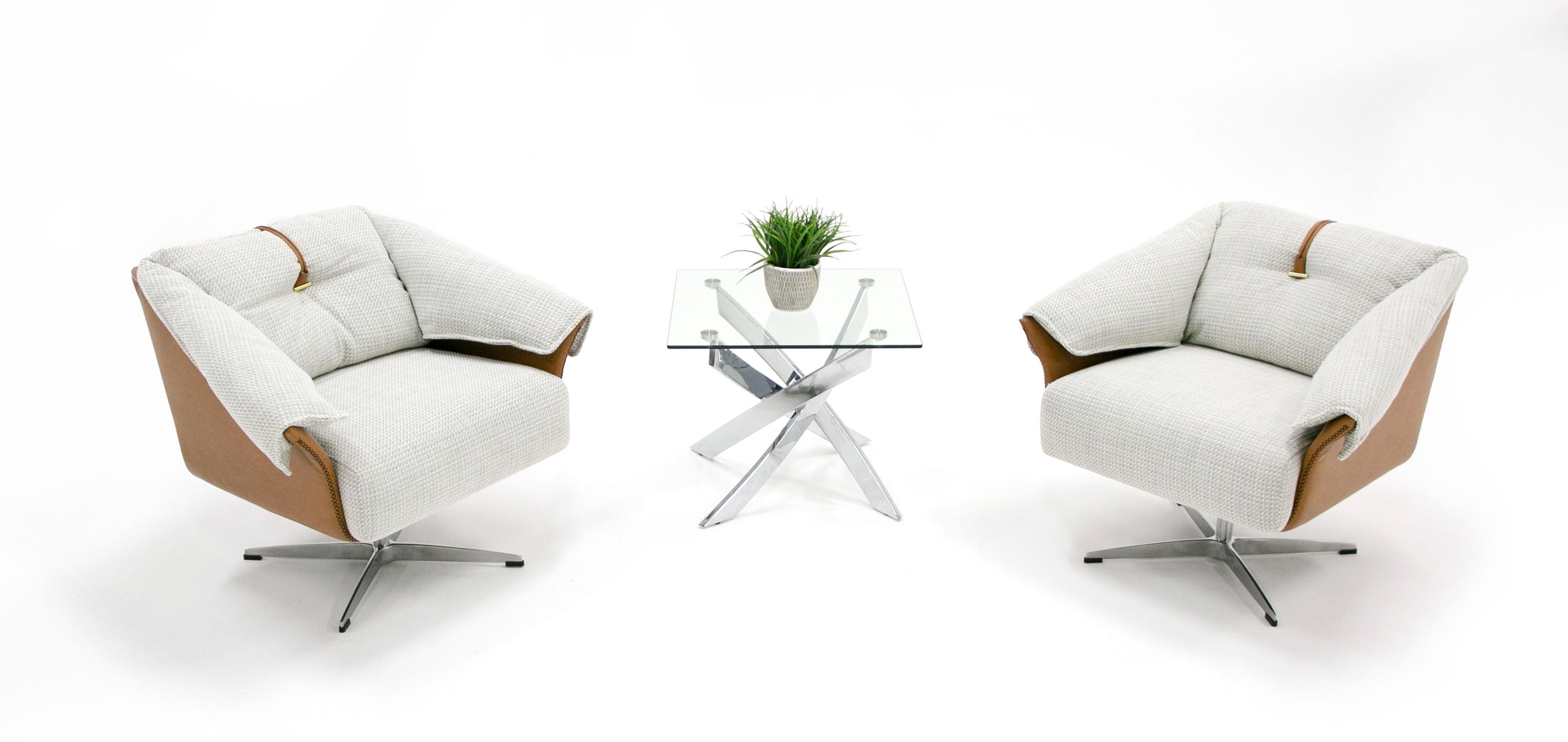 Ohio Swivel Accent Chair is made from combination of Light Grey Fabric and Camel Leatherette. This Retro style chair is comfortable with padded cushions and armrests and has a metal base. The back cushion is decorated with contrast stripe and metal button.
