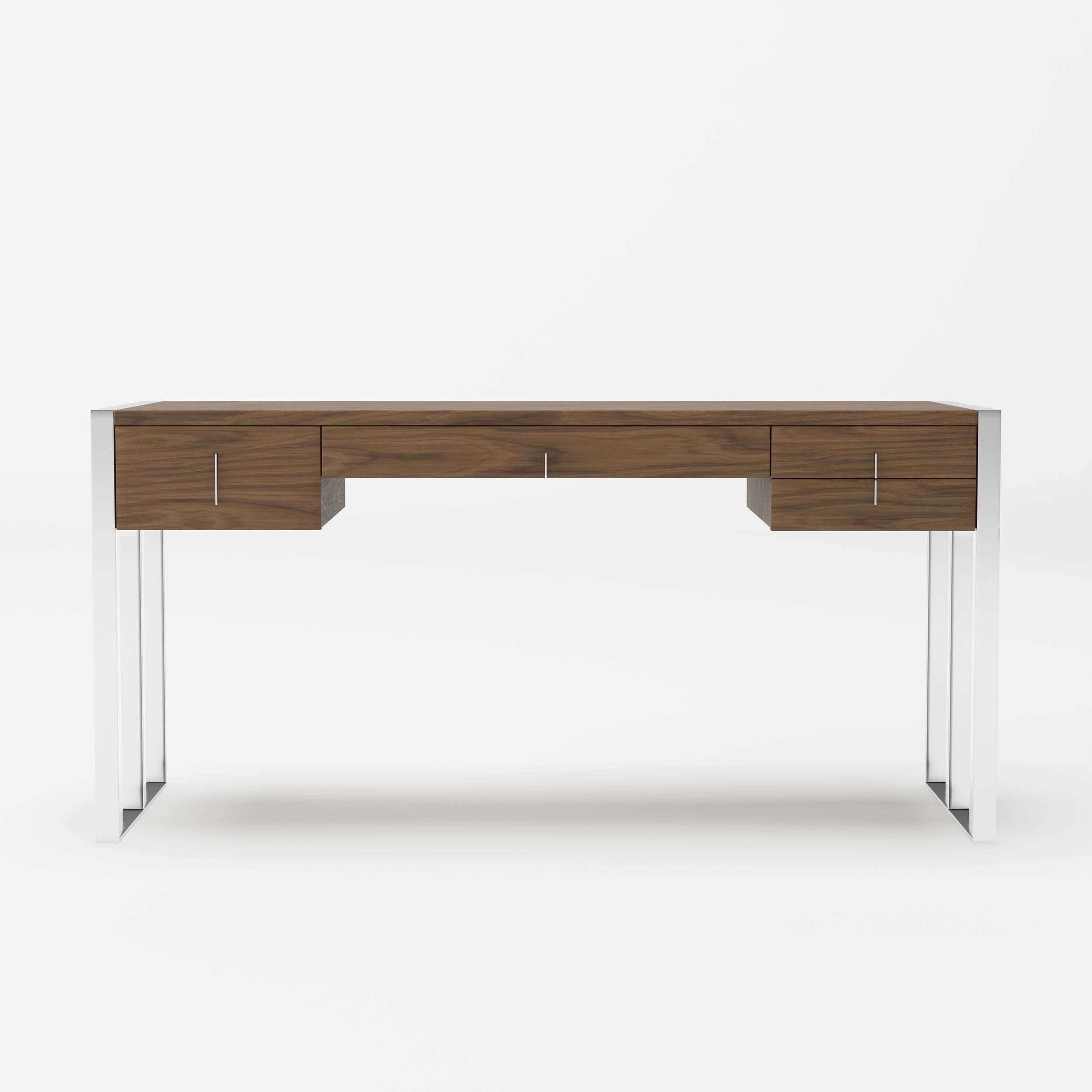 The Orcutt Desk has a contemporary feel with the American walnut top and drawers with two squared stainless steel legs on either side. There are four drawers and plenty of legroom.