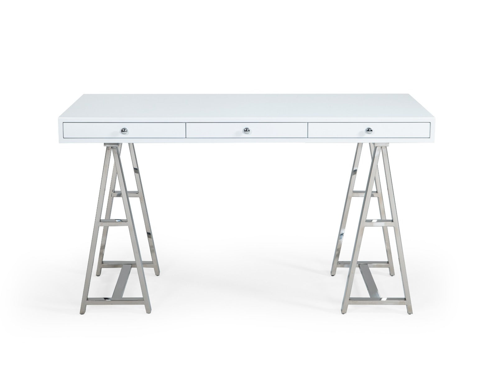 The Ostrow Desk is a beautiful modern desk, perfect for any contemporary home. The sawhorse base is made of polished stainless steel that shines in the light. The hard steel against the delicate look of the white top makes a beautiful juxtaposition. Three drawers offer storage options and a visual draw to the eye.