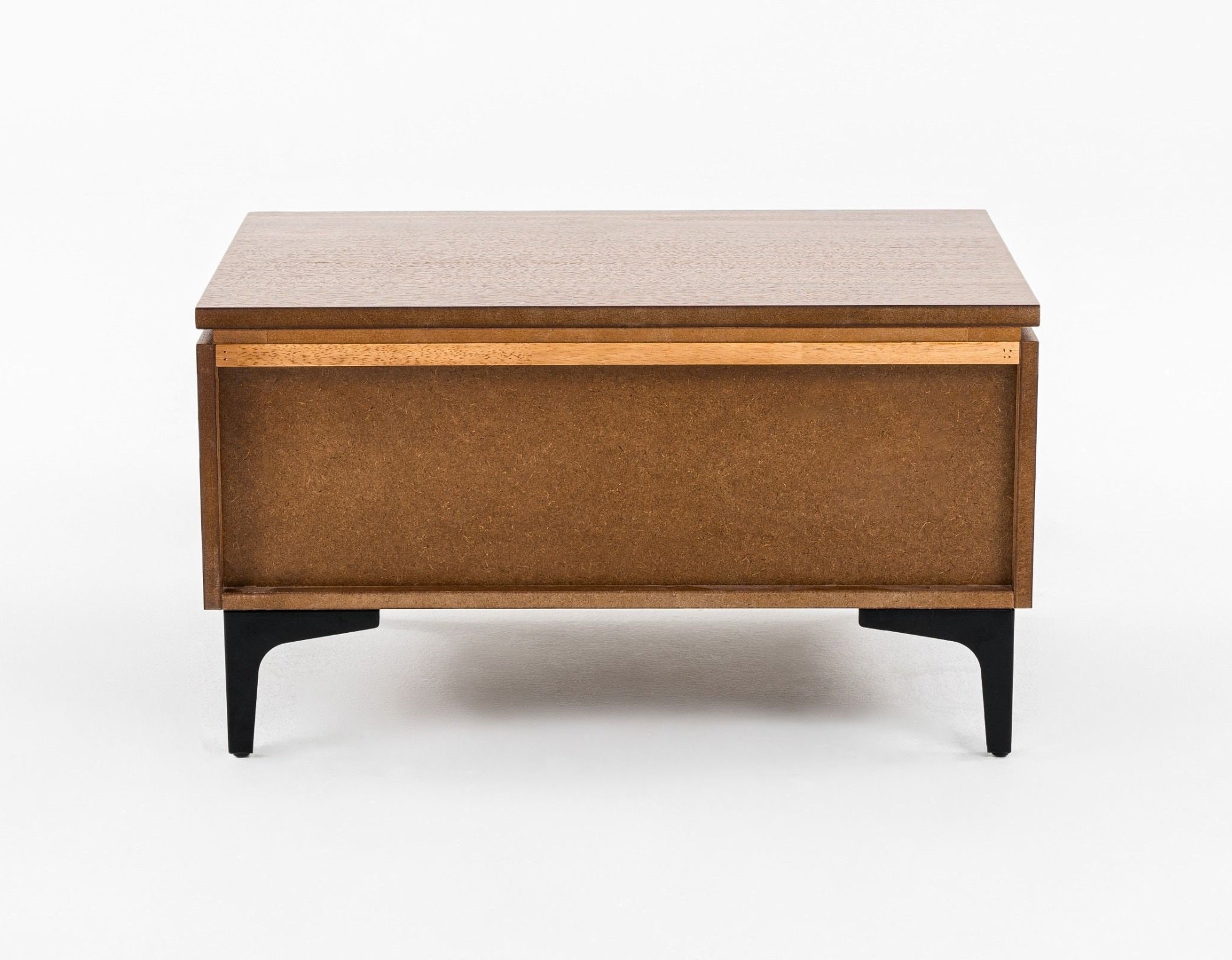 The Paula Nightstand is presented in a Mid Century Style. The walnut veneer has a Parque look by using alternating grain. The black metal accents contrast well with the walnut. The texture and style of this piece make it perfect for your industrial, farmhouse, or mid-century home. Style with the matching Paula pieces.