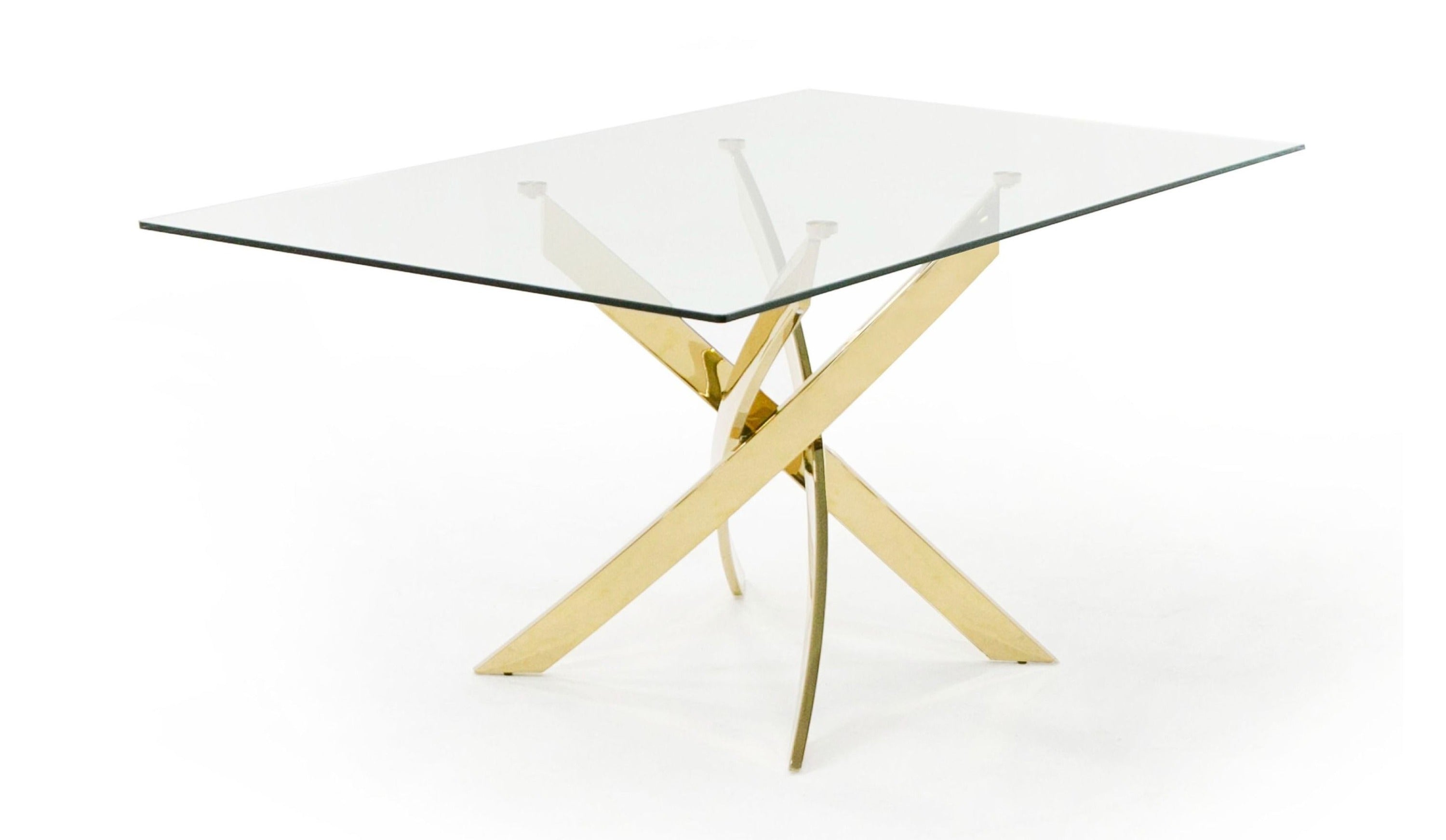 Representing Glam and Modern style, the Modrest Pyrite - Glass and Gold Dining Table is a definite attention grabber piece. Complementing the glass top is the intertwined gold stainless steel base that offers sturdy support, giving this table a poised elegant look. Complete it with our wide variety of comfortable Dining Chairs with Gold legs.