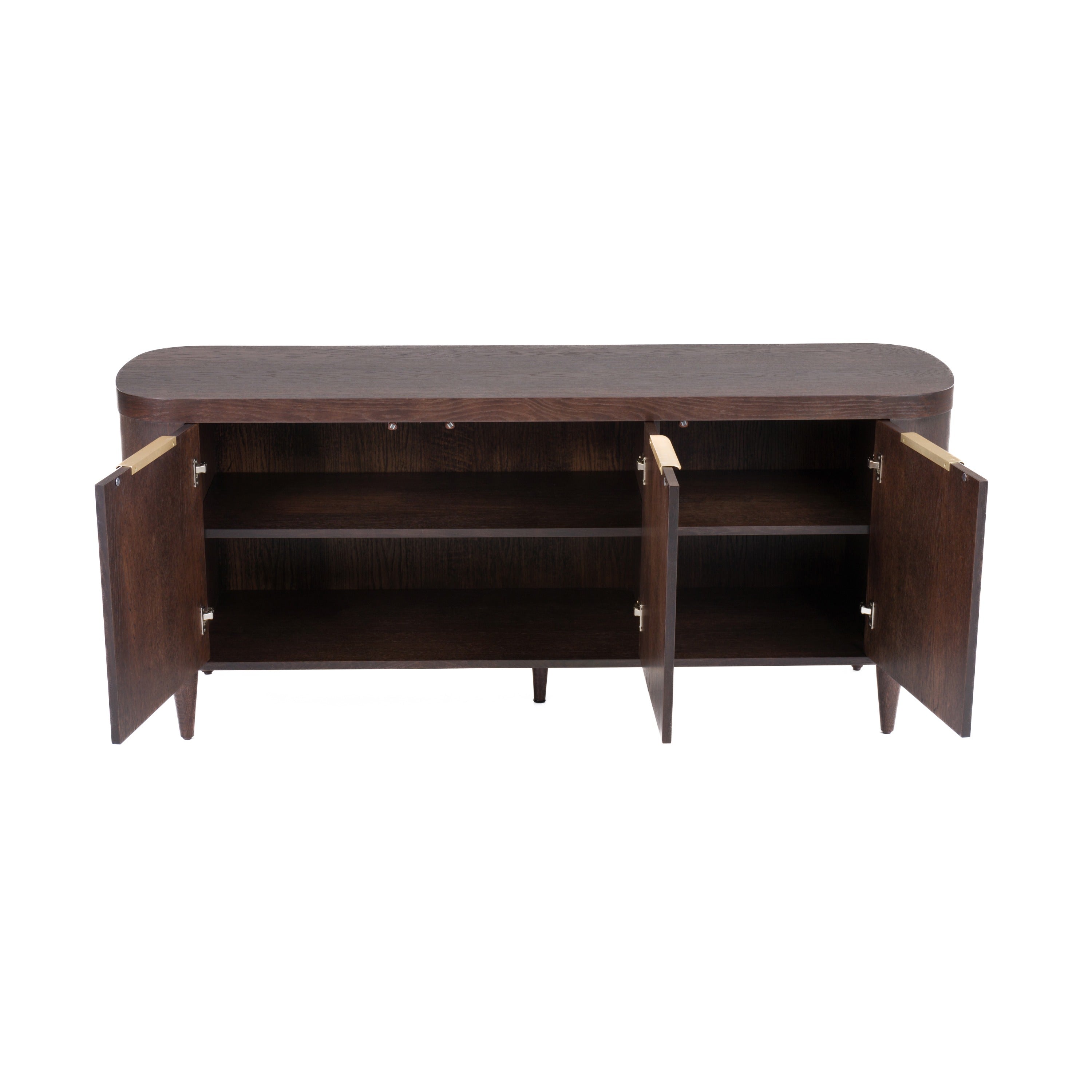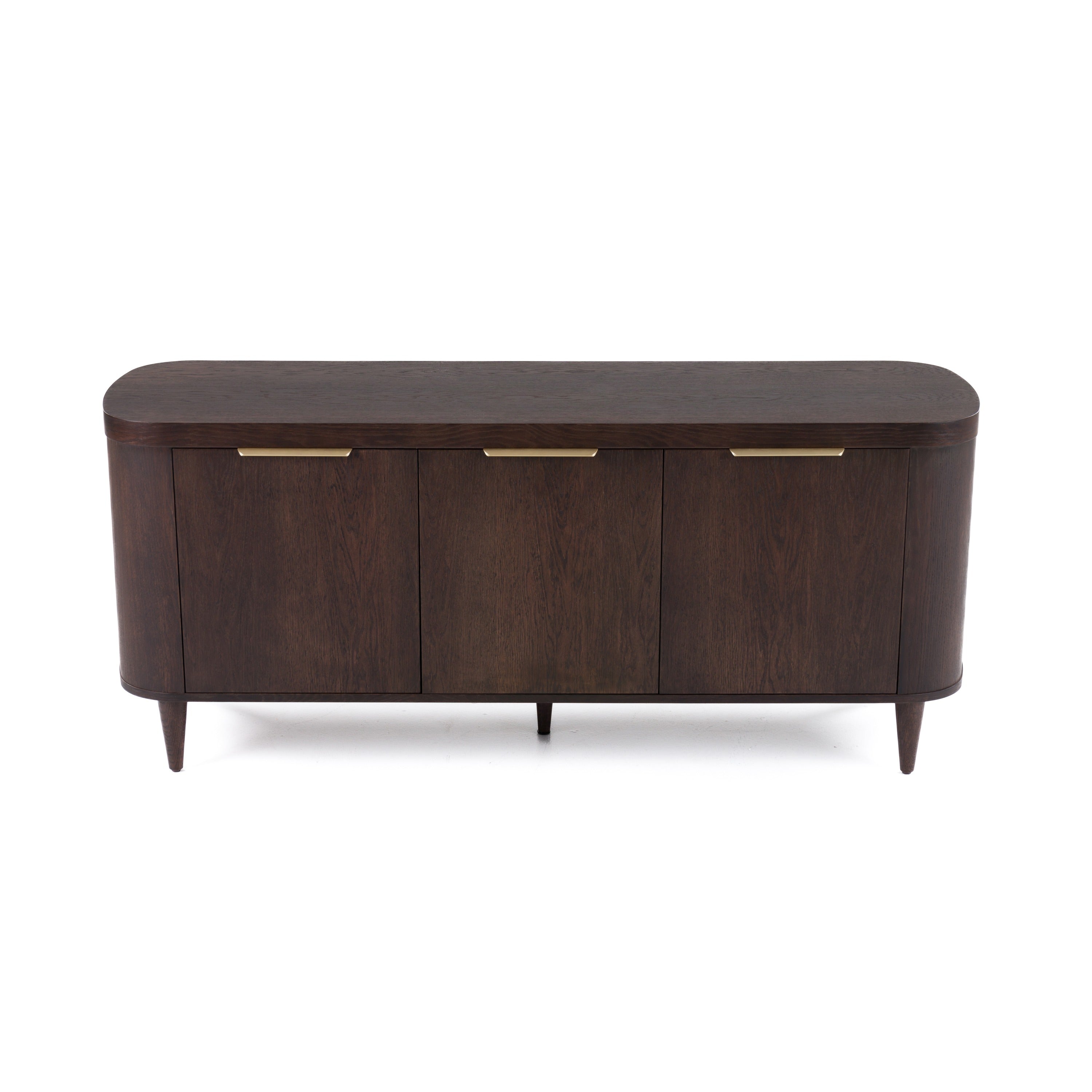 The Modrest Richmond Modern Brown Oak Buffet exudes understated elegance with its sleek, rounded silhouette and warm brown oak veneer. The smooth curves of the buffet, accented by brass handles and tapered legs, bring a sense of refined sophistication to any room. With its thoughtful craftsmanship and timeless appeal, this piece effortlessly blends modern design with functional beauty, making it a stunning focal point in a contemporary dining or living space. Ideal for those who value both form and function, it offers the perfect balance of style and practicality.
