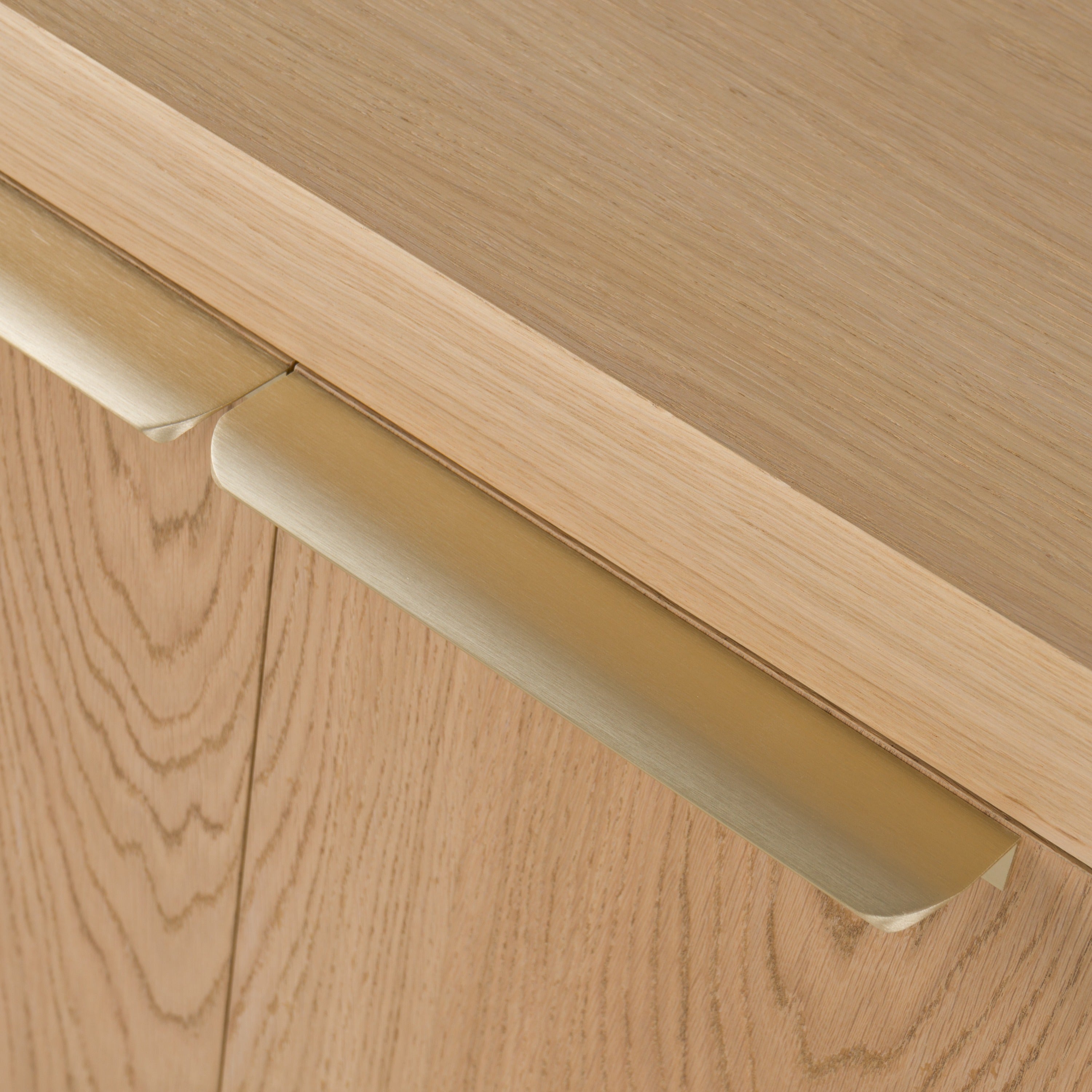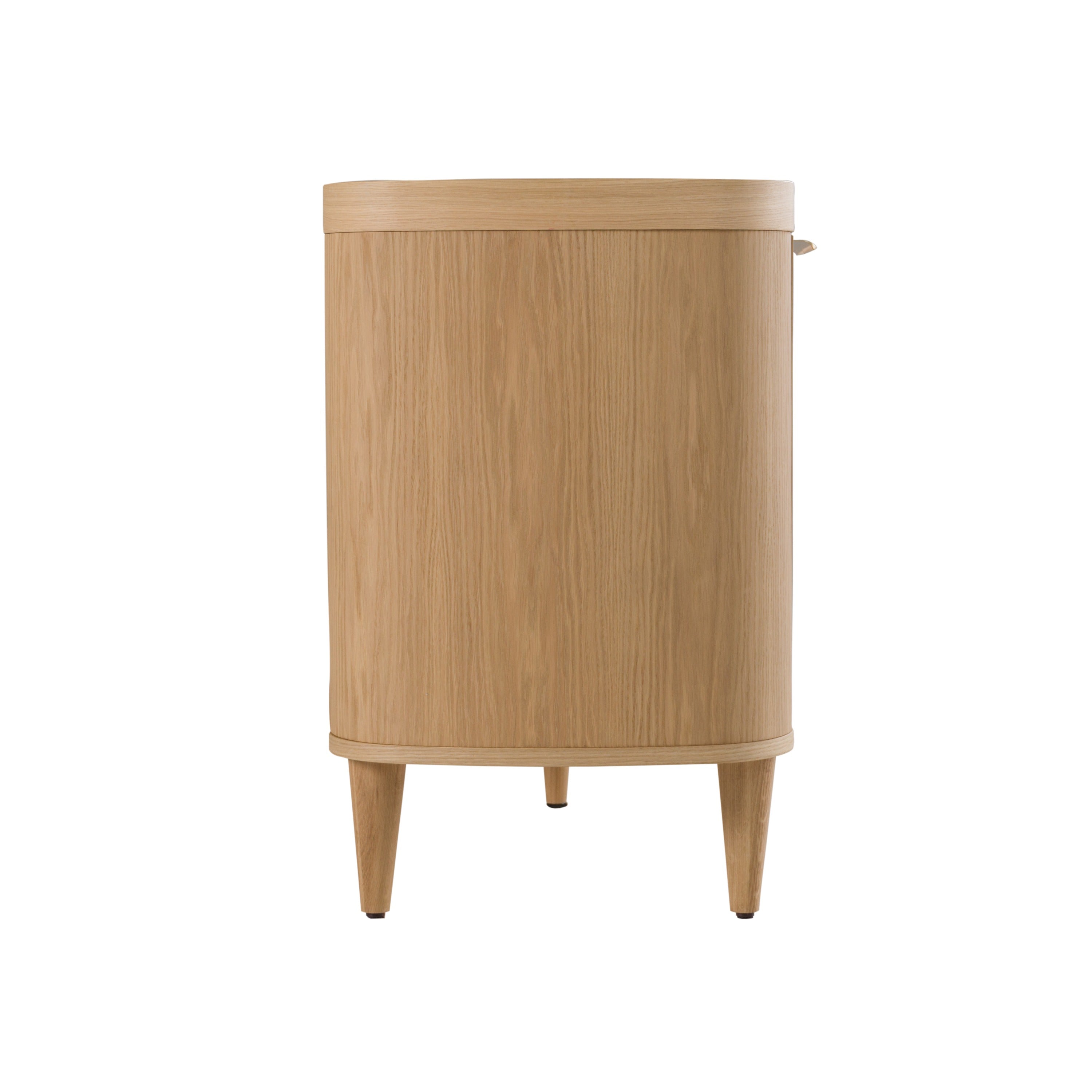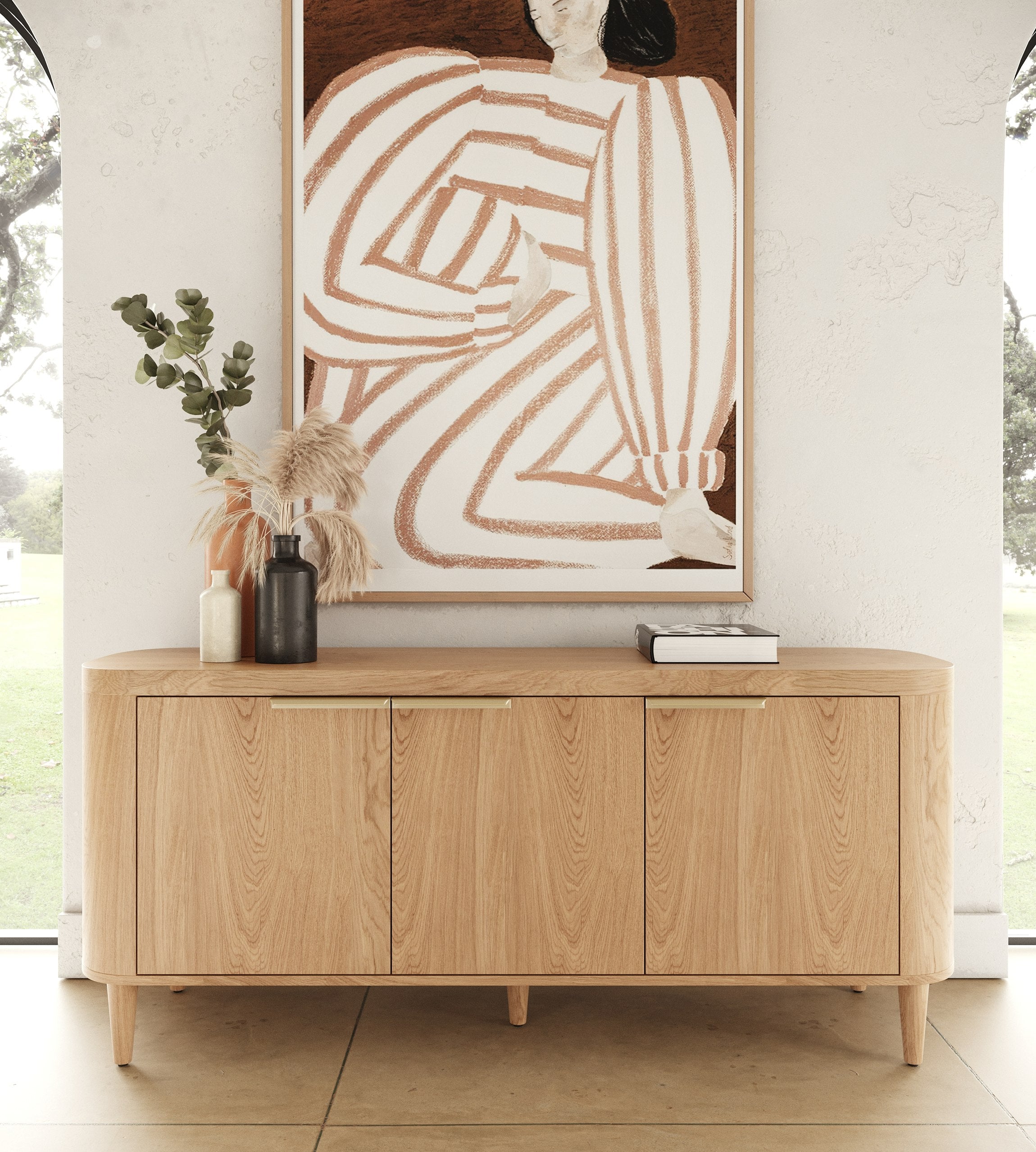 The Modrest Richmond Modern Natural Oak Buffet is an elegant expression of contemporary craftsmanship. Its soft, rounded edges and natural oak veneer evoke warmth and sophistication, making it a perfect centerpiece for any modern living or dining space. The buffet's seamless design, accented by sleek, minimal hardware and gracefully tapered legs, invites a sense of effortless luxury into the home. It serves as both a functional storage piece and a statement of timeless, refined style, blending beautifully with a variety of interior aesthetics.