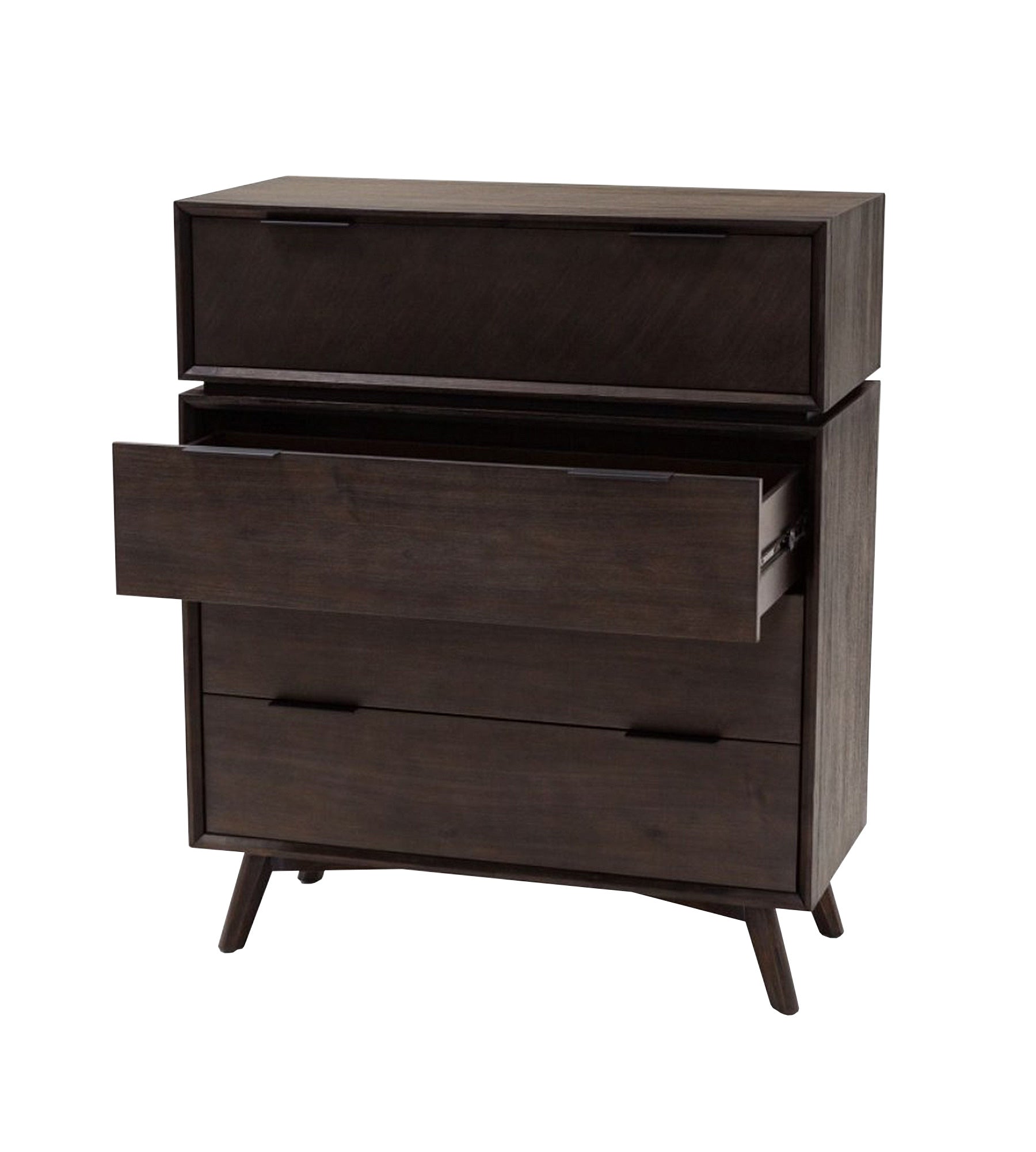 The Roger Chest is a modern industrial item that adds a rustic yet luxurious look to any bedroom. This dark brown acacia wood & veneer chest has four dovetail joint drawers, black metal handles with tapered angled legs giving it a nice 60's feel while still maintaining its luster.