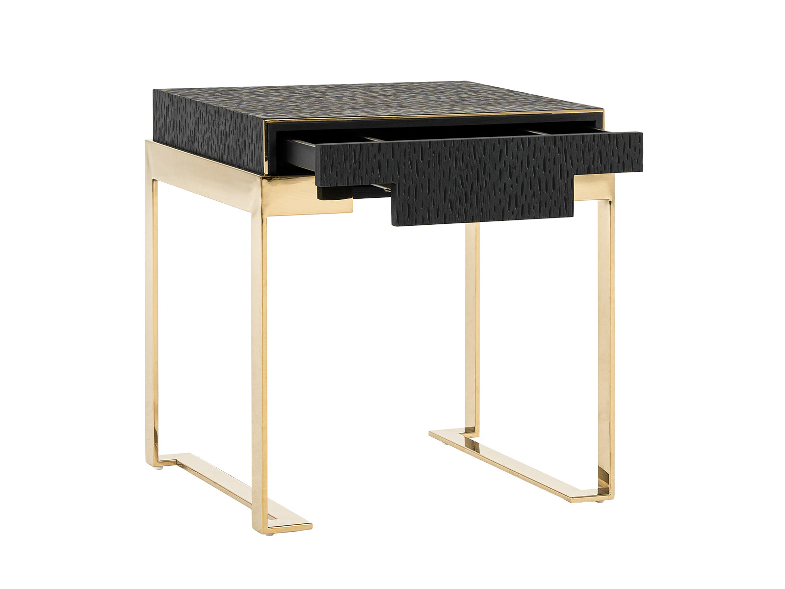 The Modrest Rothsay Modern Wenge and Gold Nightstand is a stylish and contemporary addition to any space. This nightstand is crafted with a Wenge Oak Veneer finish with gold stainless steel legs. The included drawer creates ample space for your bedroom essentials. The nightstand's sleek design and rich wood tones make it a versatile choice for various interior styles.