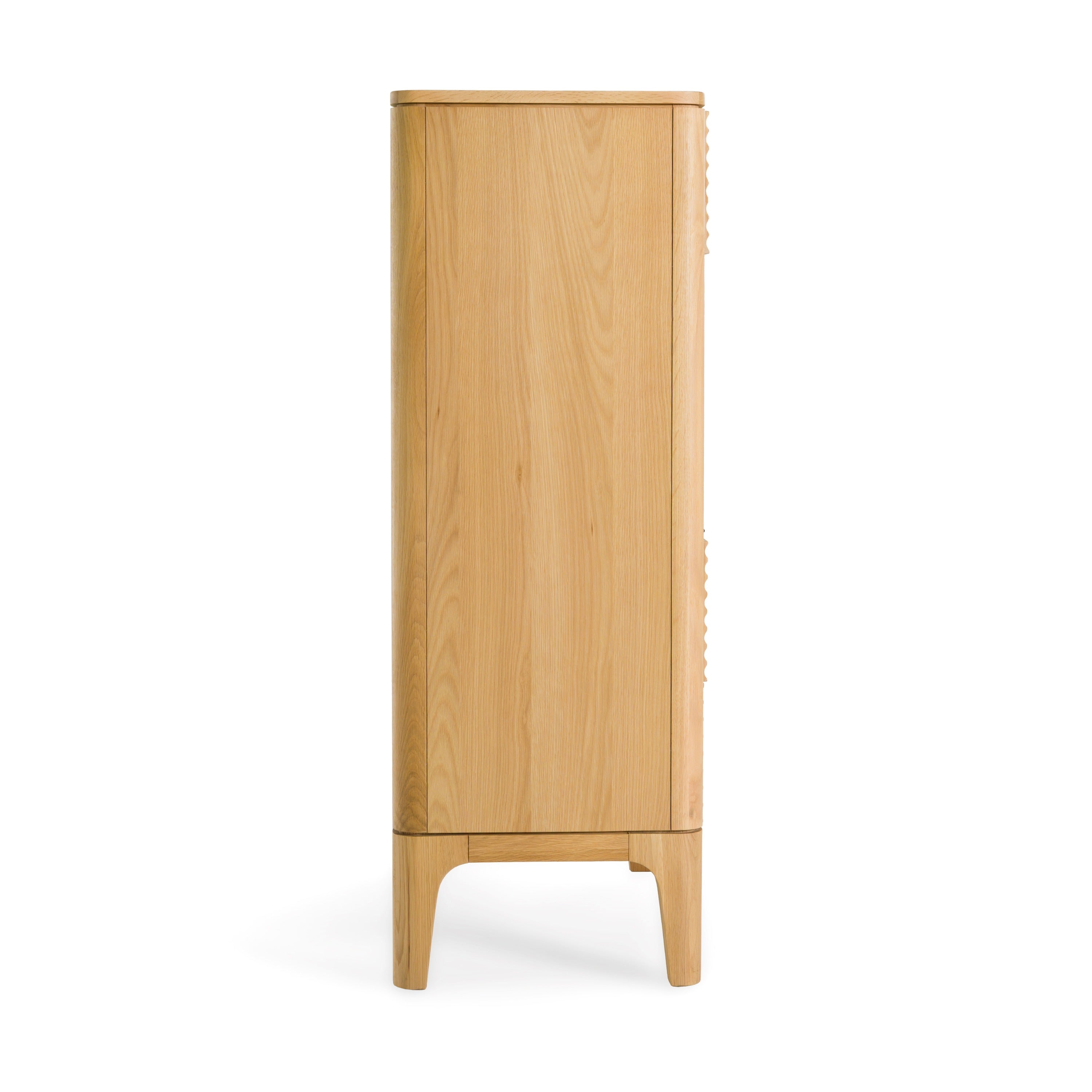 The Modrest Seattle Modern Natural Oak Chest is a horizontal and is made from solid and manufactured wood, specifically oak. Its natural color complements various interior styles. With 5 drawers, it offers ample storage space. The removable metal handles and black drawer handles add a touch of sophistication. Plus, it comes fully assembled for your convenience!