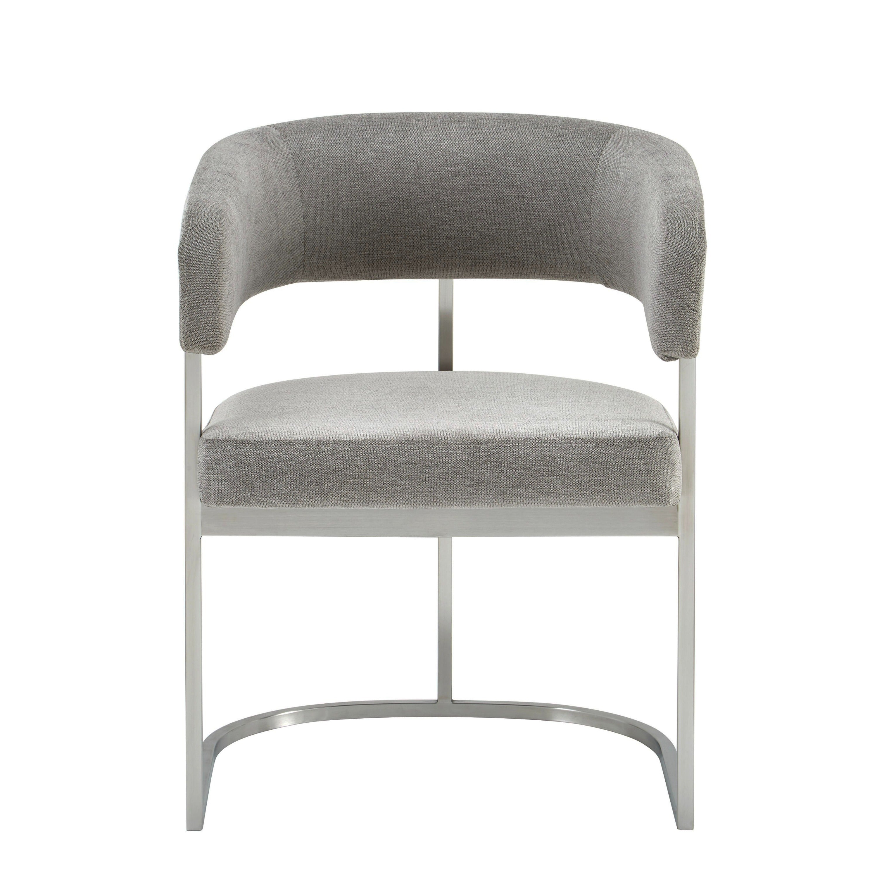 The Modrest Sebastian dining chair exudes contemporary elegance with its modern grey fabric upholstery and sleek stainless steel frame. Featuring a gently curved back and armrests, this chair offers both comfort and style, making it a perfect addition to any dining space. The minimalist design highlights clean lines and a sophisticated aesthetic, while the combination of fabric and metal creates a chic, inviting atmosphere. This versatile chair is ideal for modern interiors, seamlessly blending functionality with visual appeal.