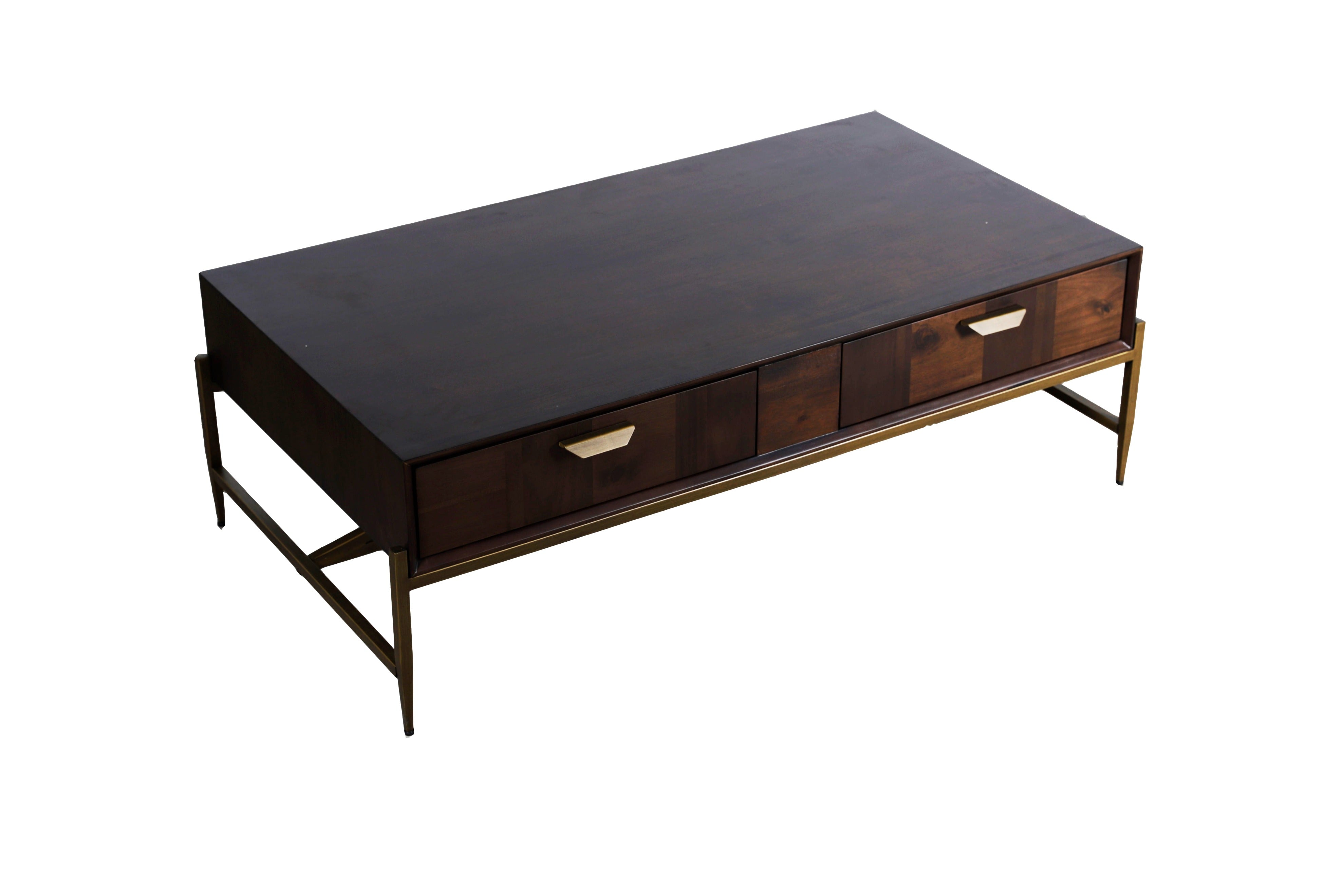 Highlighting the graceful support structure on the Shane Coffee Table, you can see how a simple triangle acts as both a design motif and strong geometric support shape. This antique brass painted metal finish on the frame and handle plays nicely against the Dark Mango finish on the Acacia veneer of the two drawer unit. One final element is the mitered edge detailing that lightens the visual load of the drawer front. To keep your unique palate, go ahead and check the rest of the Shane series and bring more joy into your home, for now and for years to come. Fully assembled.