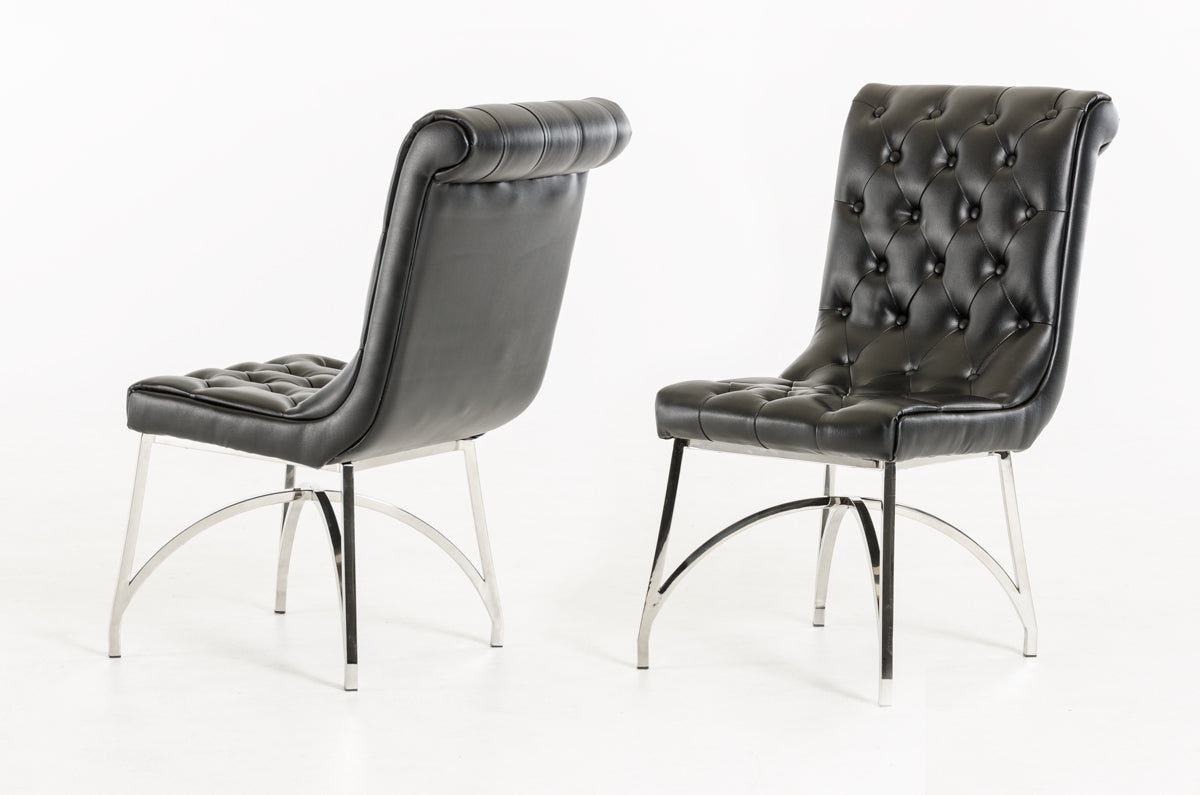 The Modrest B8351 Modern Black Leatherette Dining Chair offers a luxurious design featuring black leatherette upholstery with tufted seat and seatback. Bowed stainless steel legs offer steady support.
