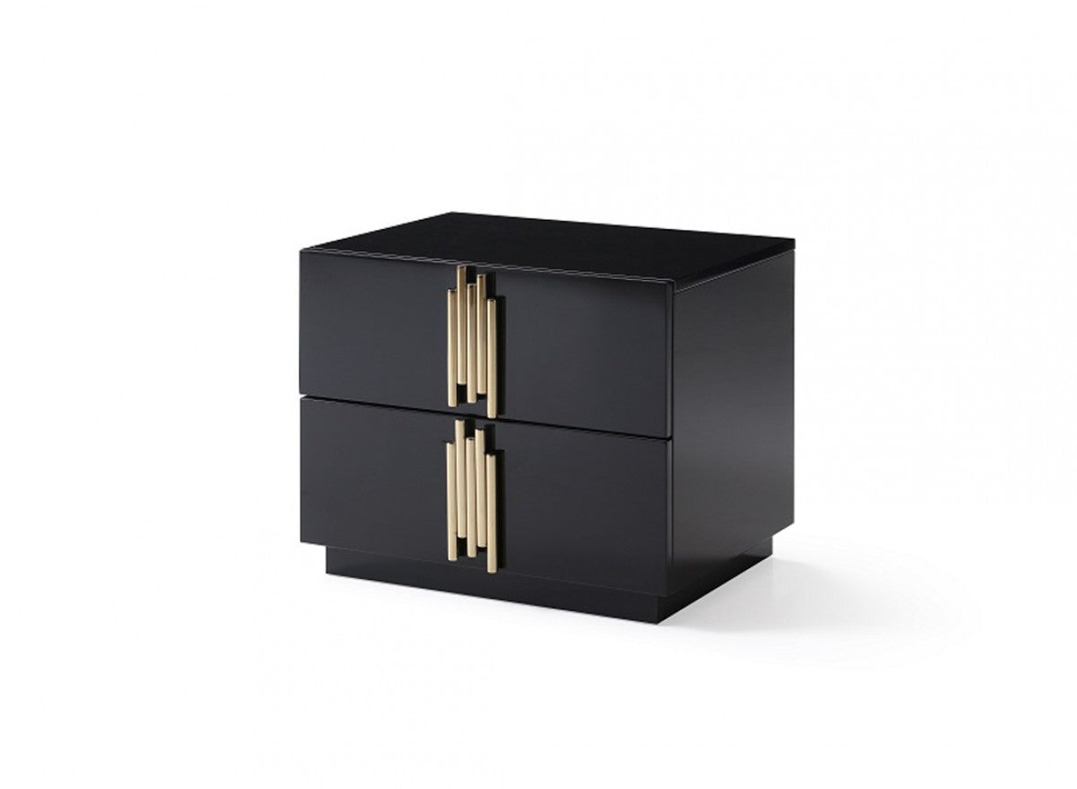 Complementing any bedroom theme is the Modrest Token Modern Black & Gold Nightstand. It features a practical 2-drawer design in a posh black high gloss finish. Providing a striking contrast are the rod-shaped champagne gold stainless steel handles that were positioned in an irregular fashion. This modern nightstand offers ample storage and a wide top, ensuring you of organization in your bedroom.