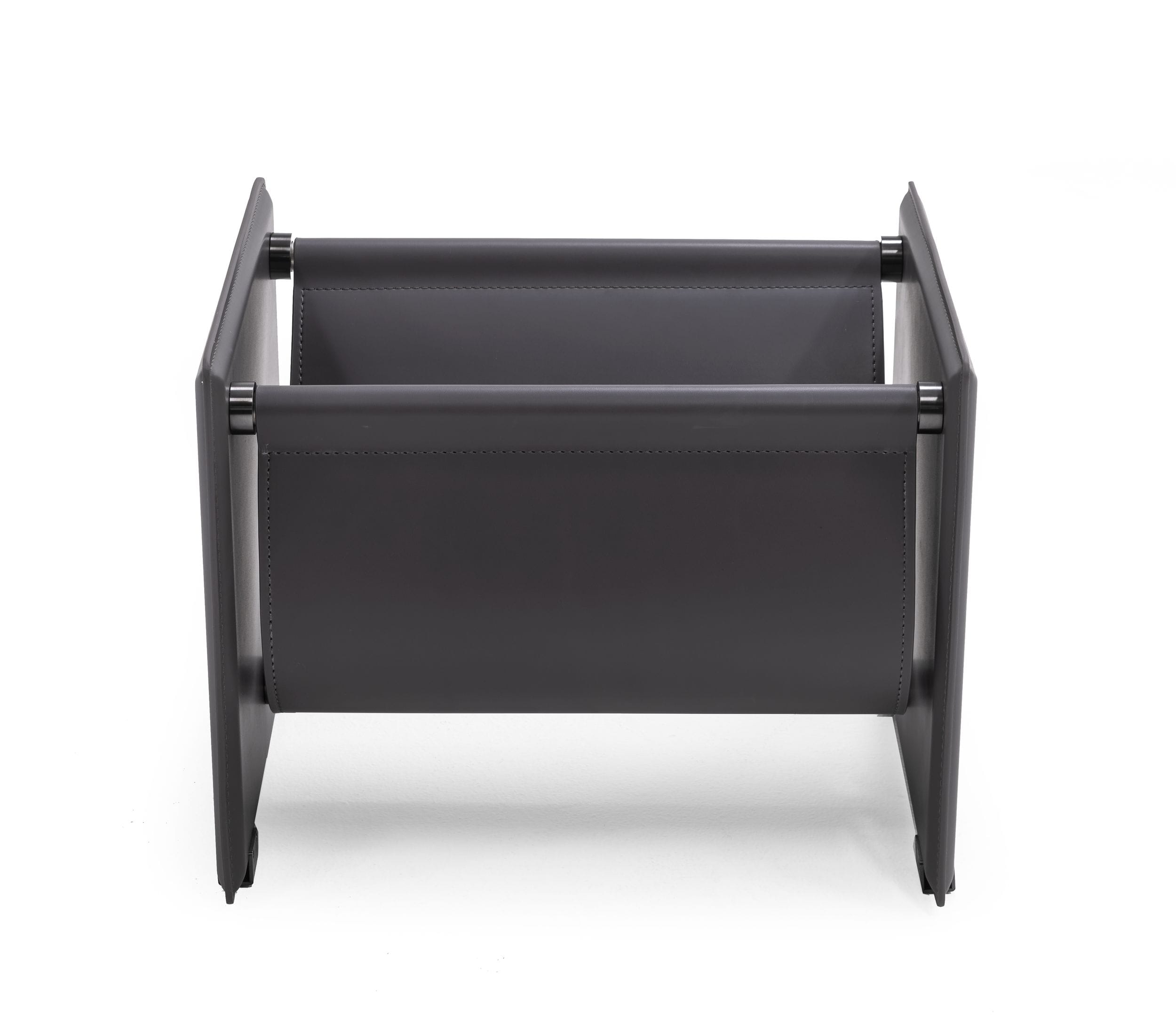 The Uriah Magazine rack is an elegant piece of home decor. Upholstered in a luxurious grey saddle leather, it sets itself apart as an ultimate show of style. Pair with a sheepskin chair and cowhide rug for a perfect mid-century look.