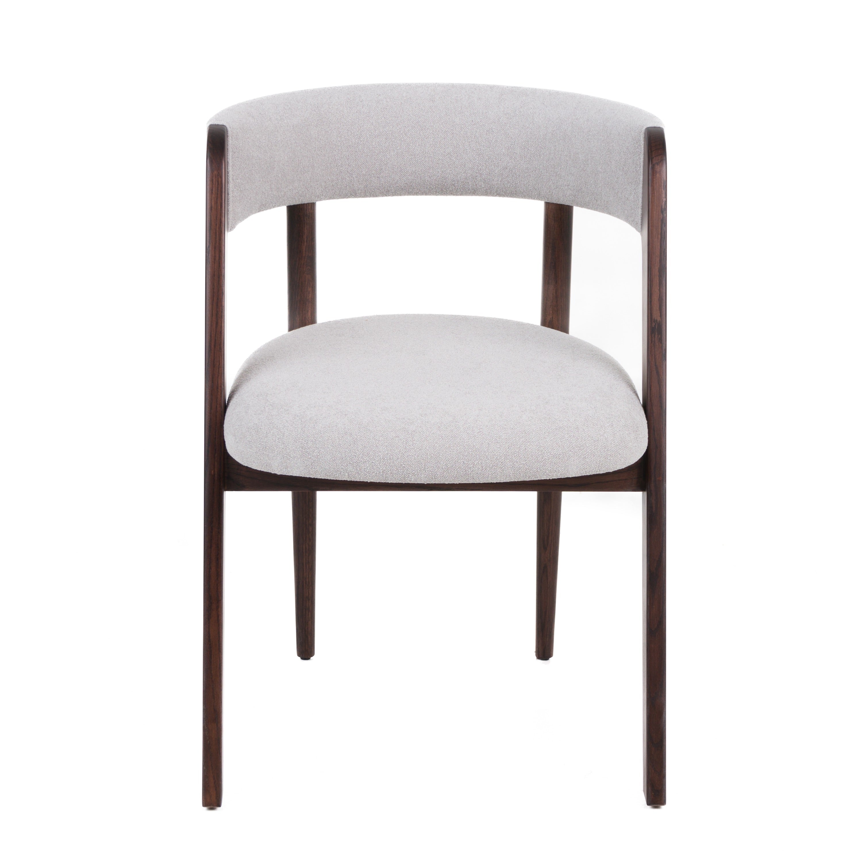The Modrest Vegas Modern Dining Chair Set merges timeless sophistication with contemporary elegance. Wrapped in a soft light grey fabric and complemented by rich walnut-stained oak, these chairs exude a refined warmth. The rounded backrest and sculpted frame deliver both comfort and architectural allure, making them perfect for elevating any dining space. These chairs bring a harmonious balance of texture and design, embodying the craftsmanship and modern aesthetic synonymous with luxury interiors.