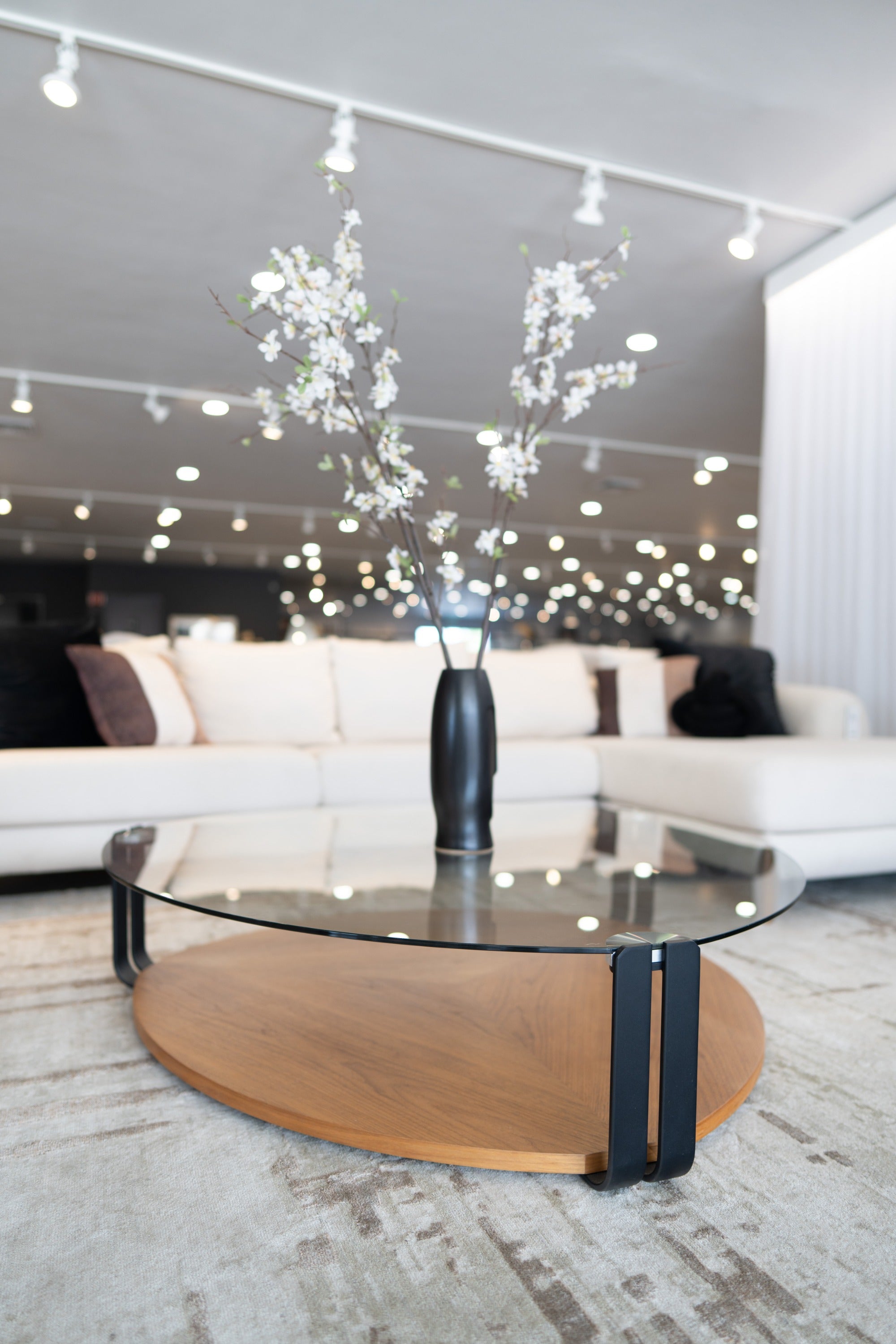 The Viviana Coffee Table has a qunique rounded triangular shape, that is enhanced by the dark metal supports that hold up the super thick 10mm clear glass top, over the rich walnut veneer base that can be used for display storage. The clean curvature of this piece is modern, contemporary and beautiful.