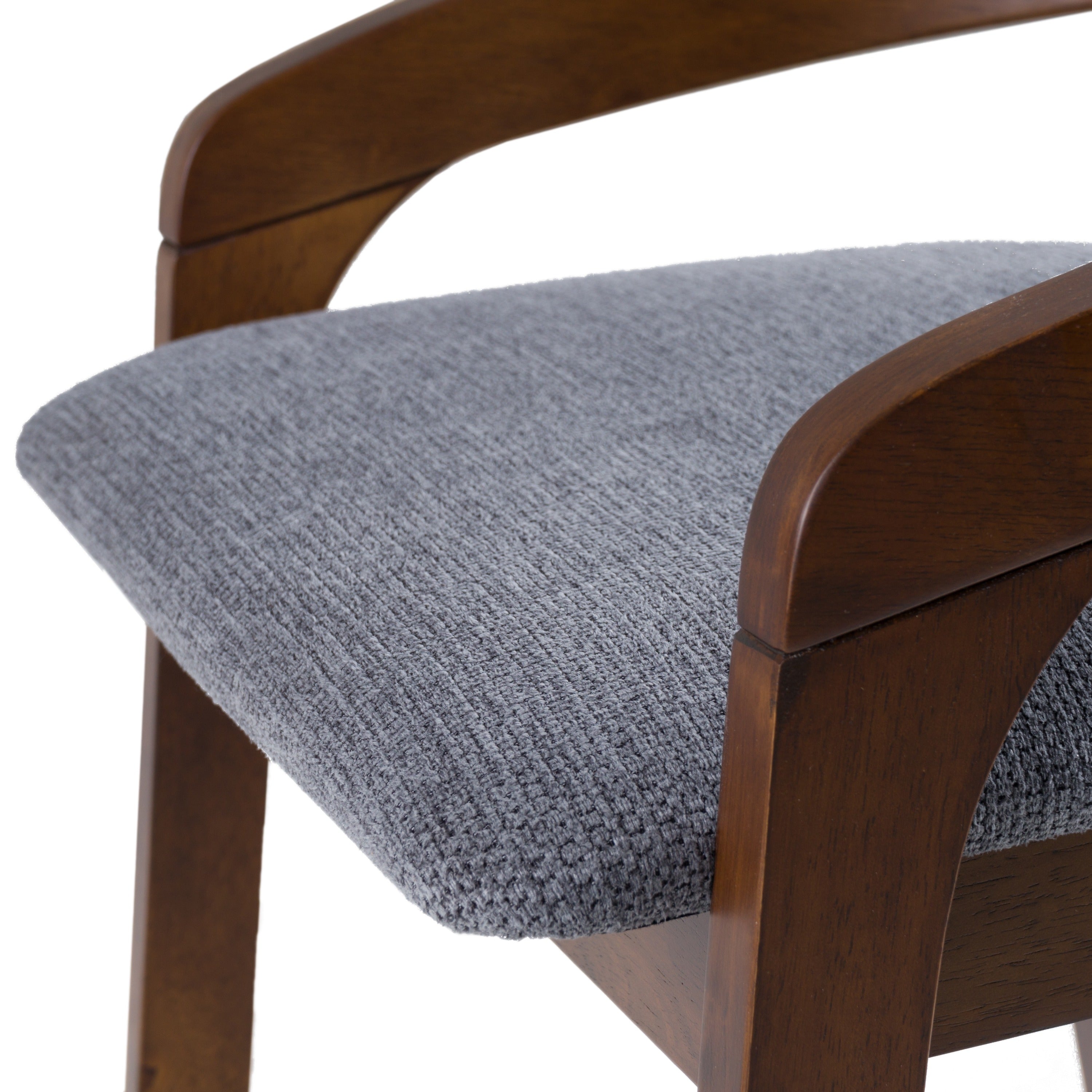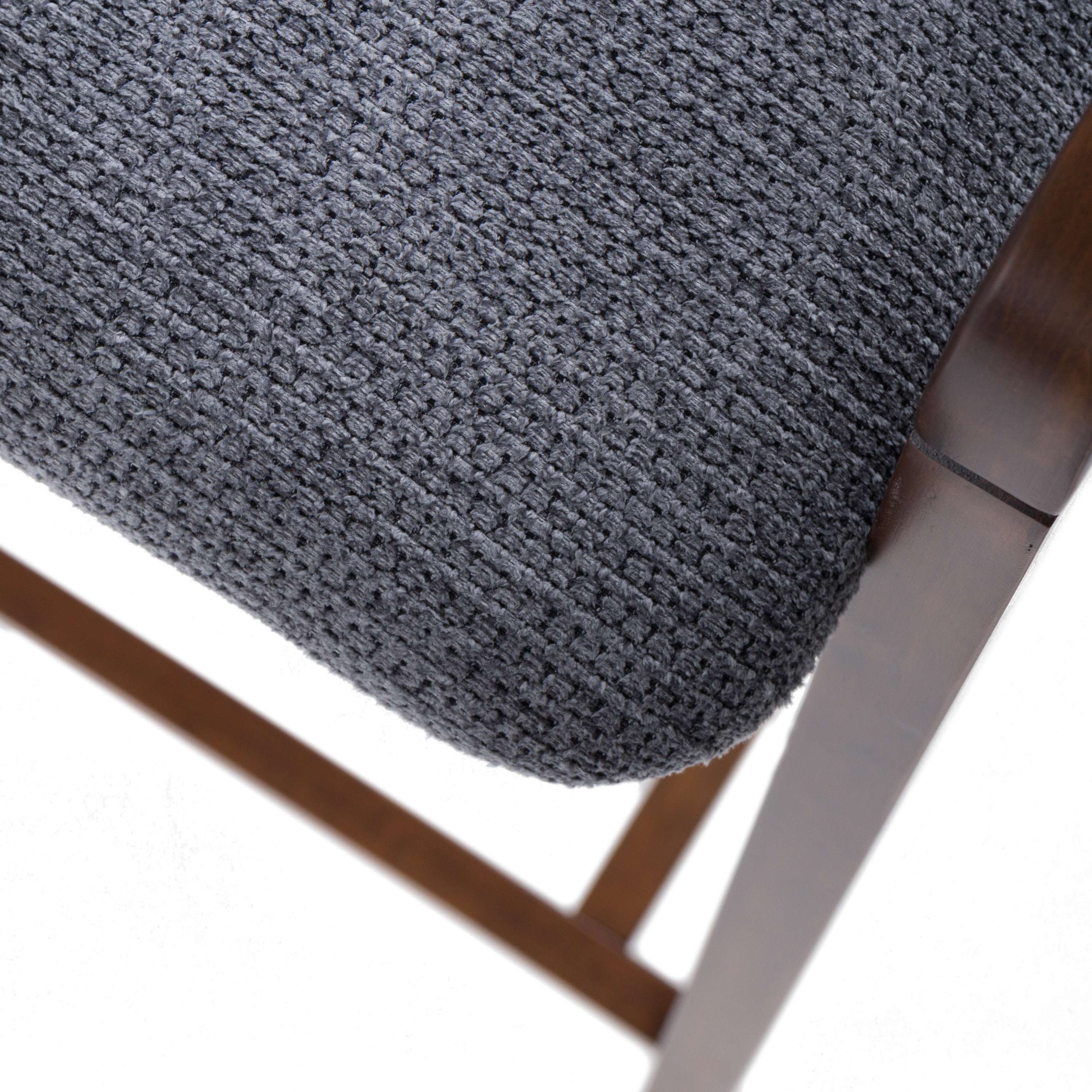 The Modrest Vougler - Modern Grey Fabric & Walnut Counter Chair (Set of 2) is a stylish and functional addition to any contemporary kitchen or bar area. This set includes two counter chairs, each upholstered in 100% polyester fabric in a sleek grey color, complemented by a walnut finish on the solid rubberwood and manufactured wood frame. Featuring a low backrest, four sturdy legs, and a footrest, these chairs offer both comfort and support with a weight capacity of 220 lbs. Easy to maintain, simply wipe clean with a dry cloth; assembly is required.
