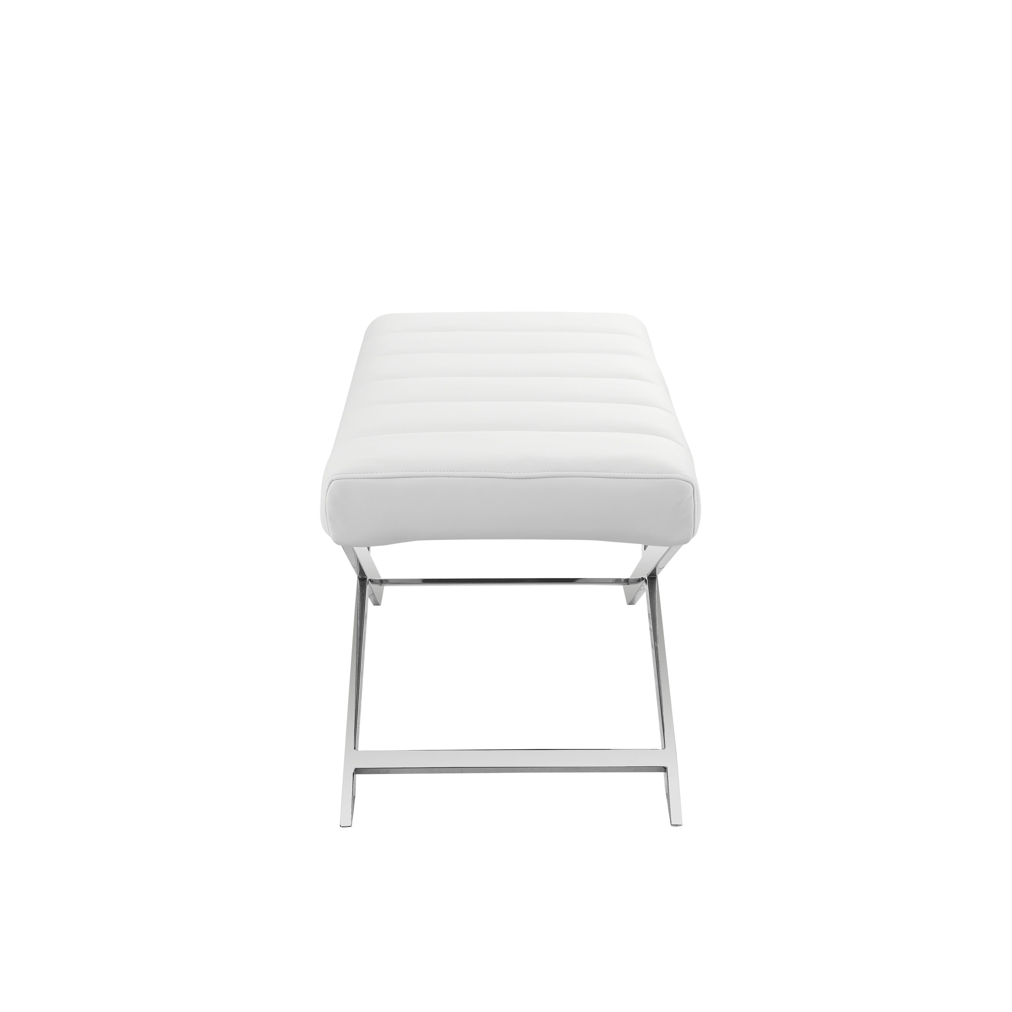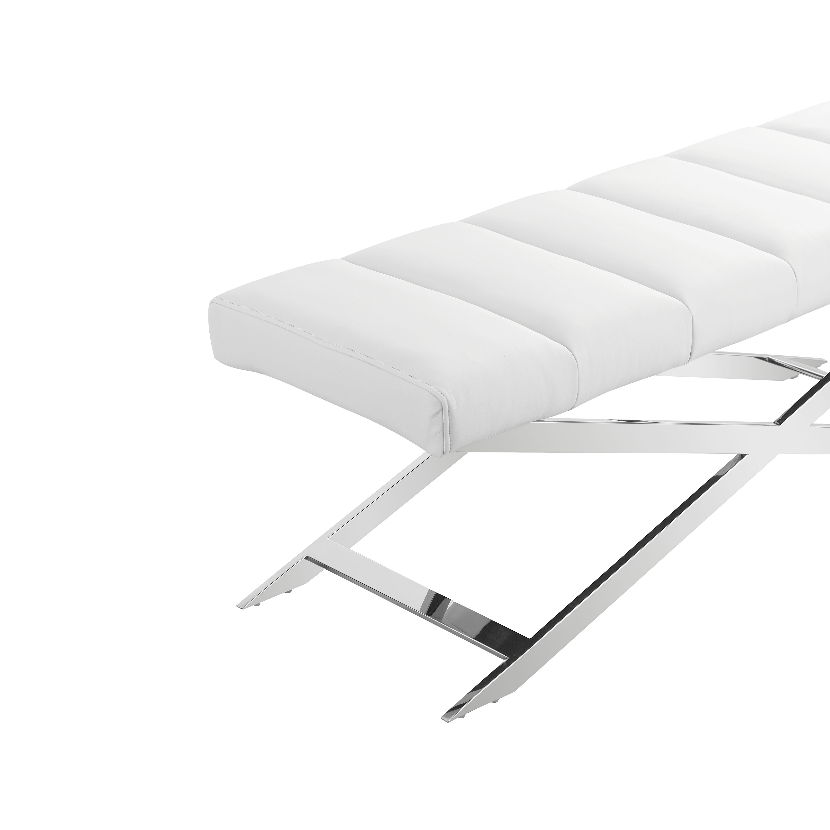 The channel tufting on the luxurious bench draws the eye in. The upholstery is a beautiful white vegan leather that is sure to be soft to the touch. The brushed stainless steel frame and legs hold up the glam piece to make a perfectly styled item.