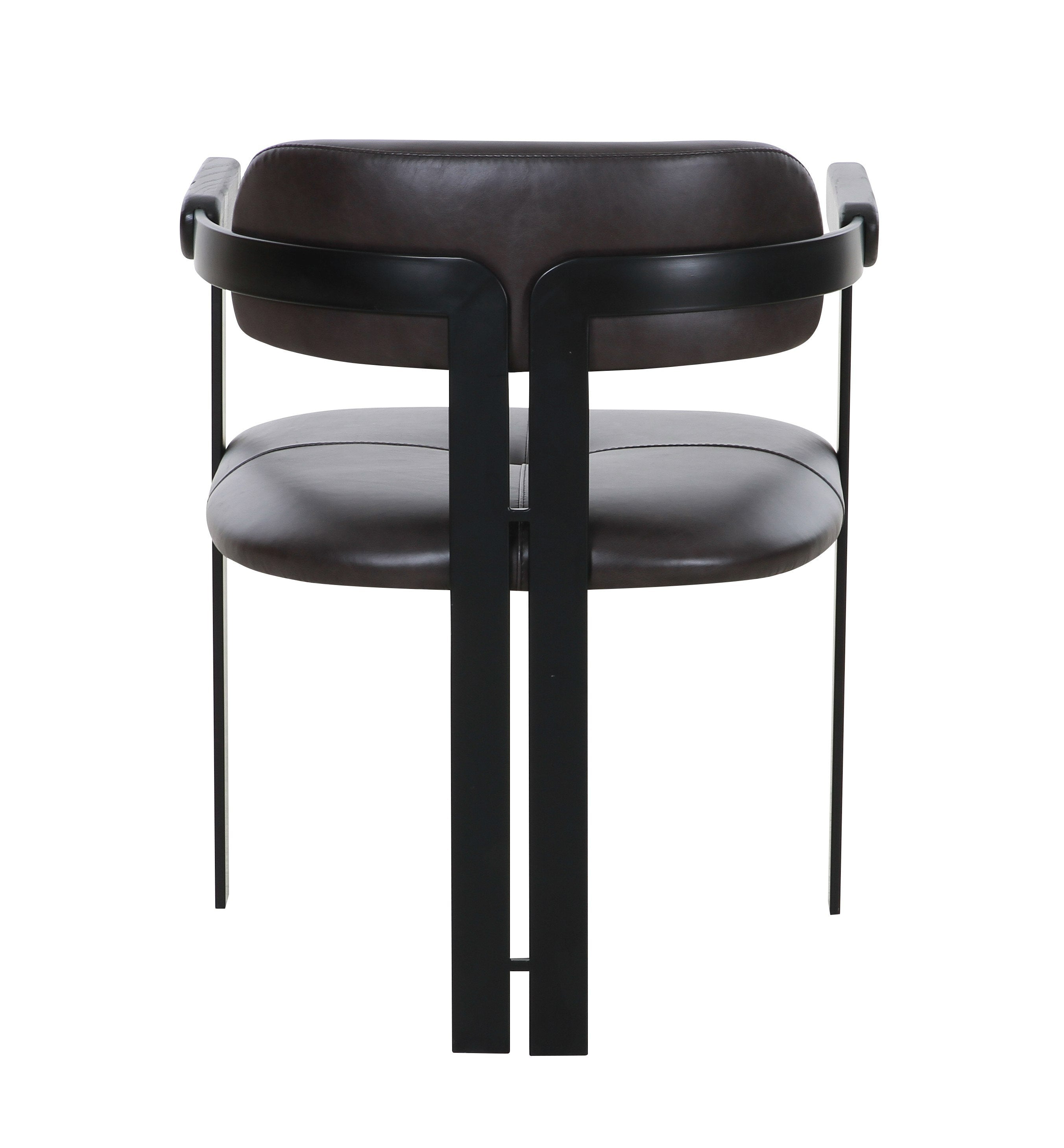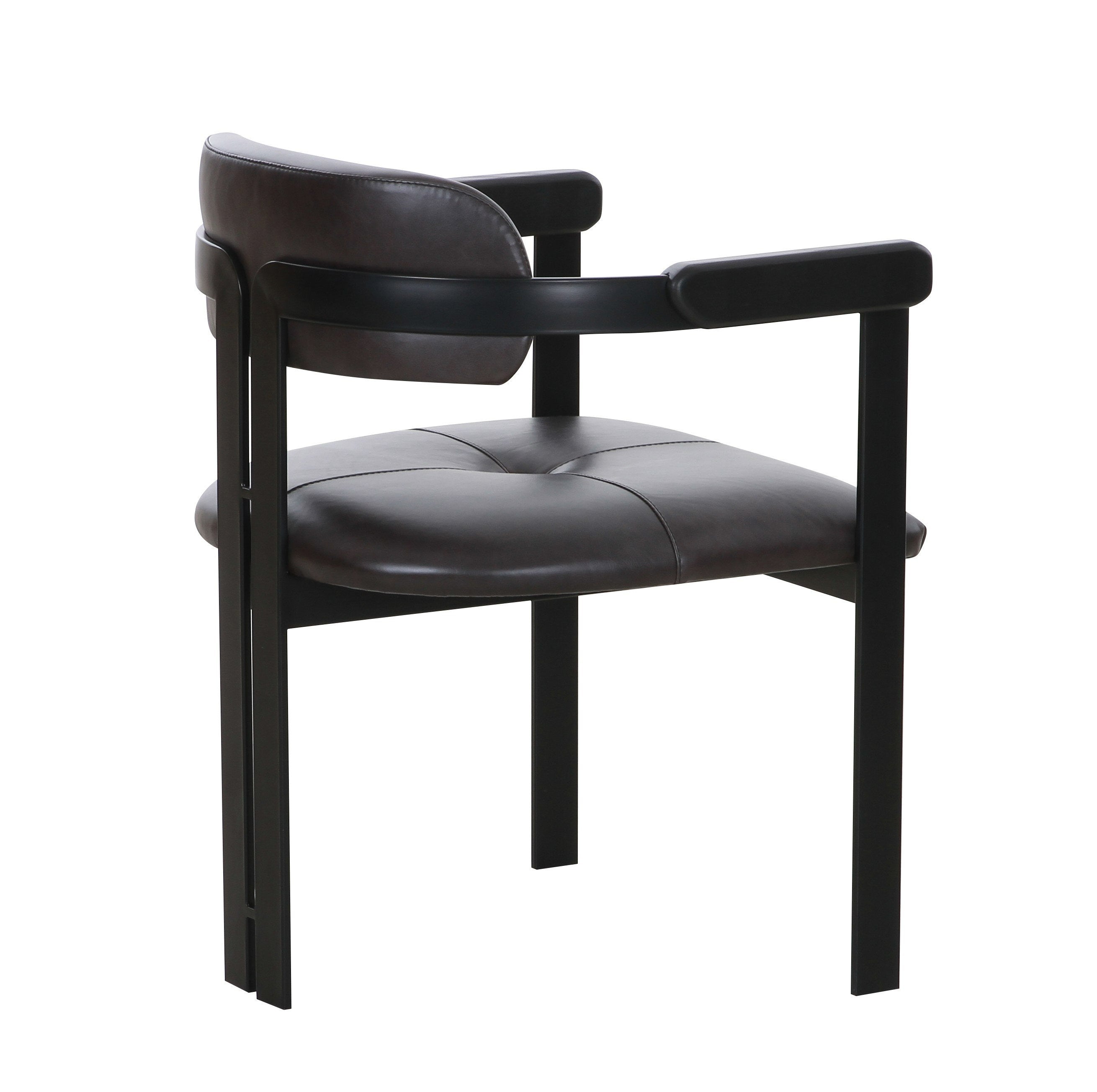 The Modrst Aneta Dining Chair combines sleek design with comfort. Upholstered in genuine dark brown leather, it exudes sophistication. The black iron frame with black wood armrests adds a contemporary touch, while the foam-filled seat and back ensure a cozy dining experience. The slat back design completes this elegant piece, making it a perfect addition to any modern dining space.