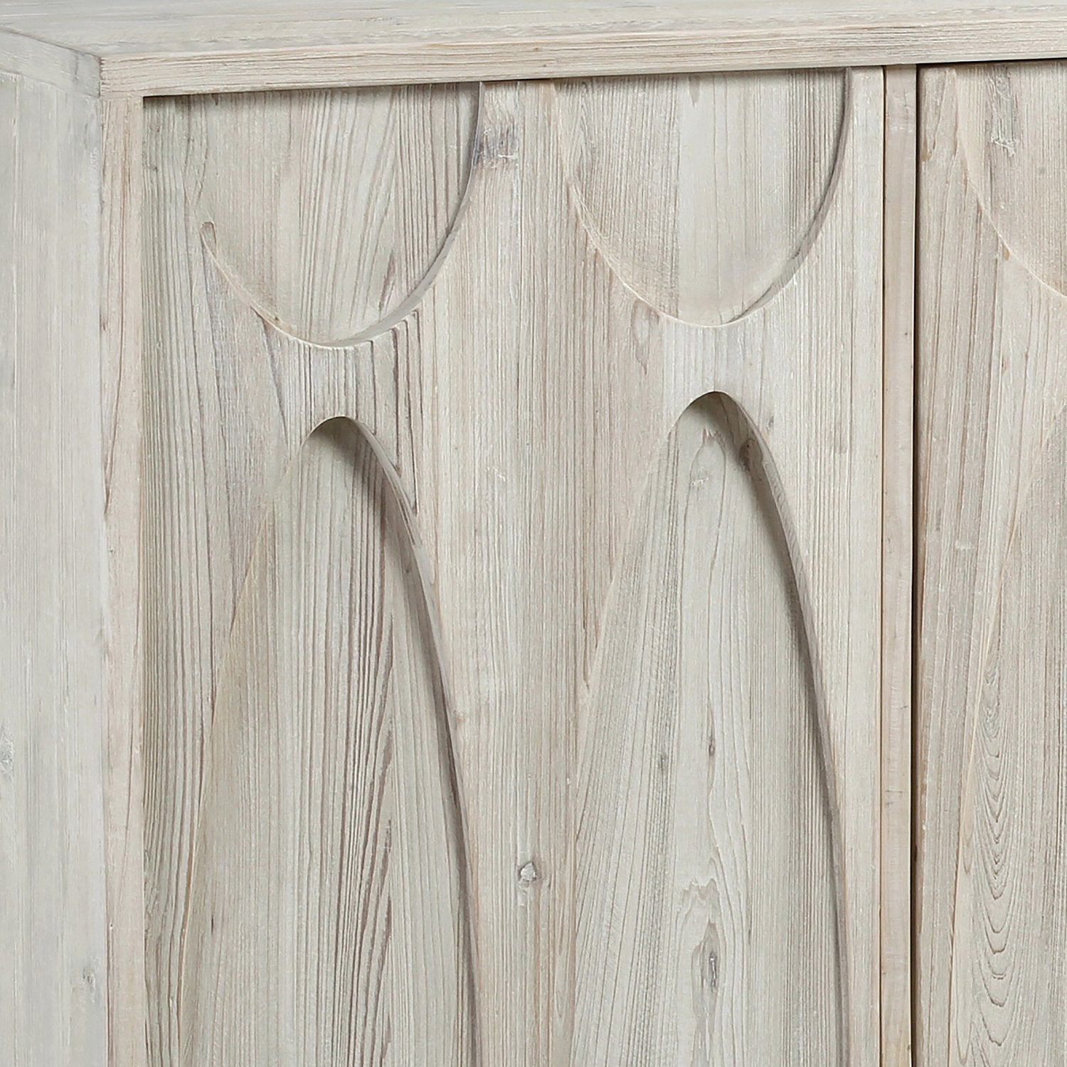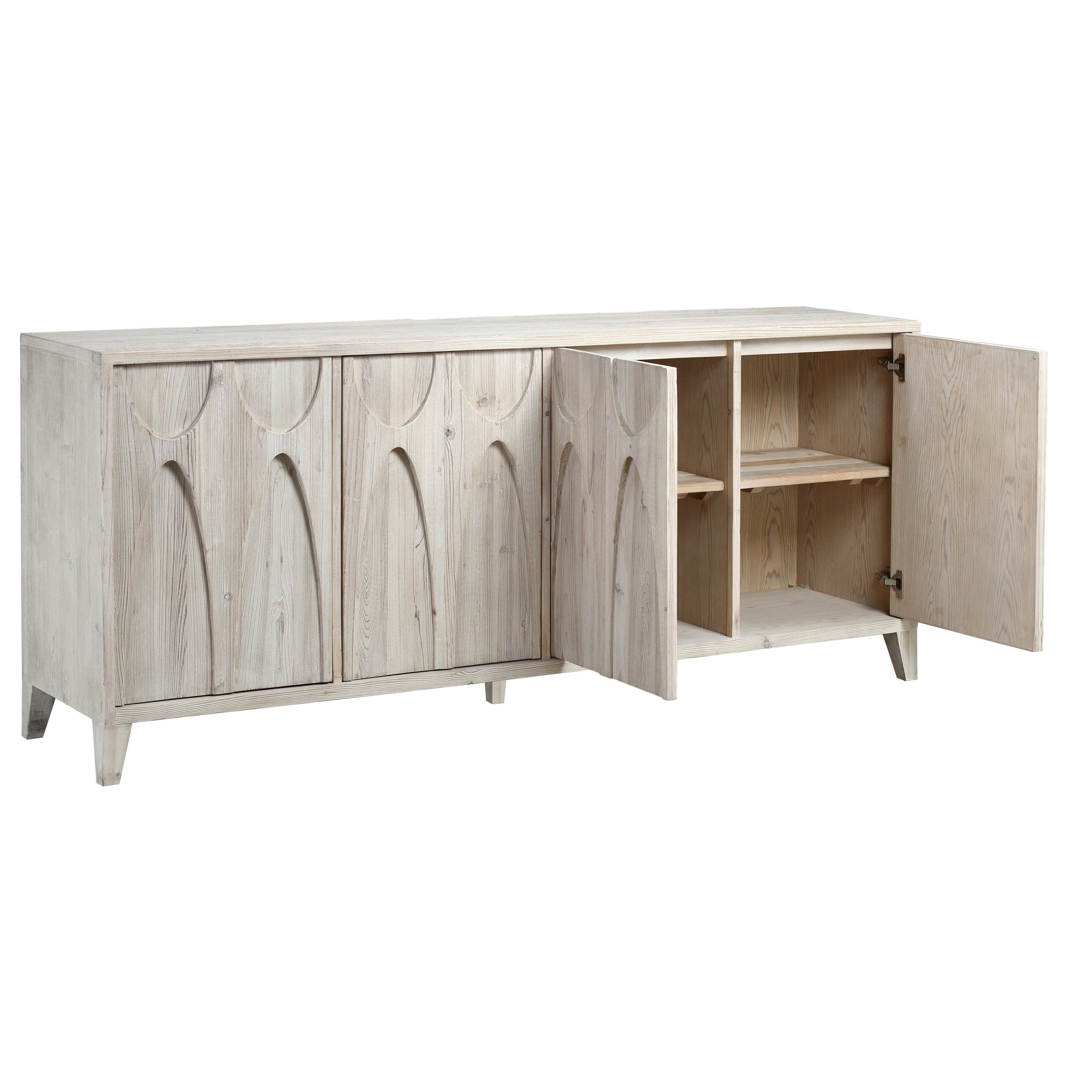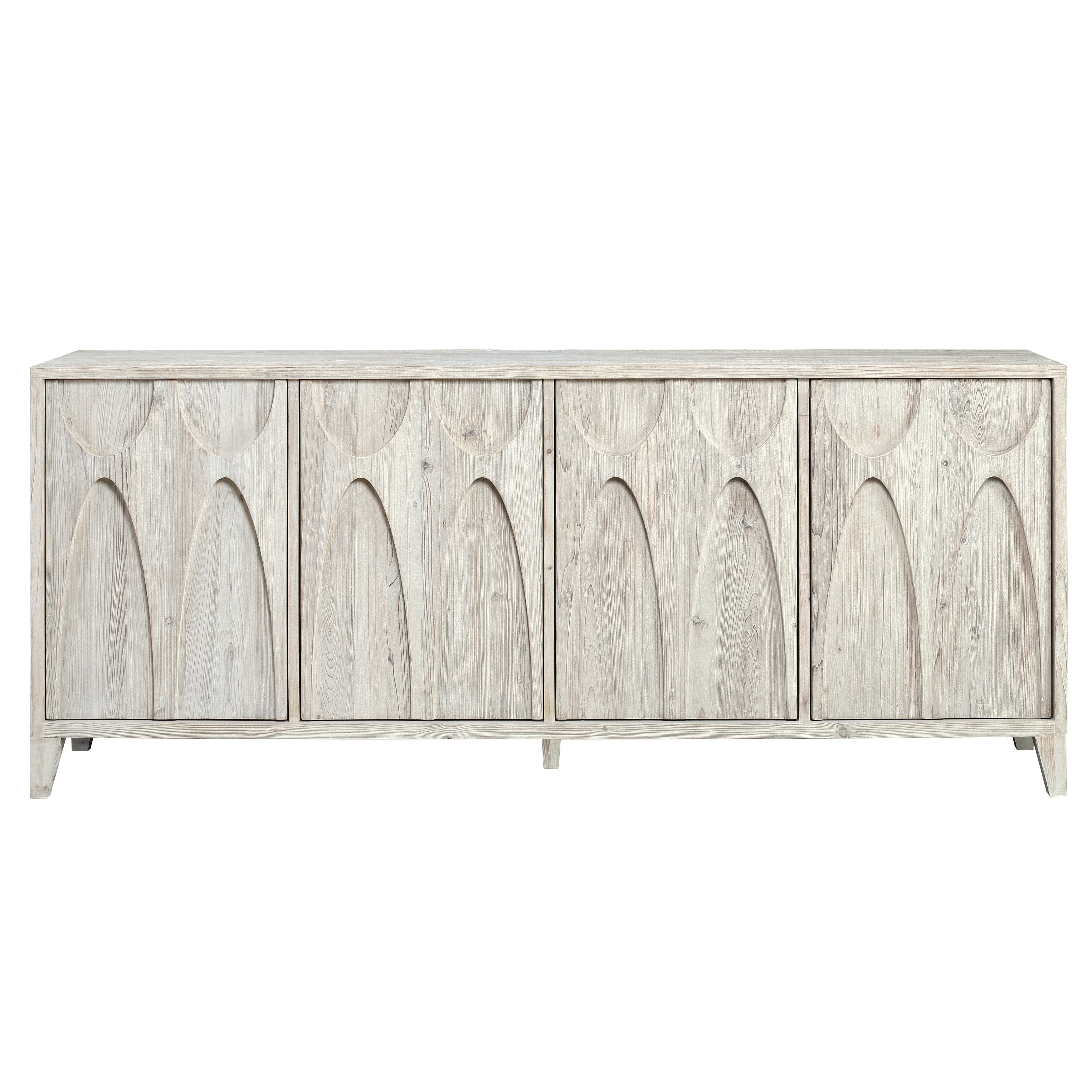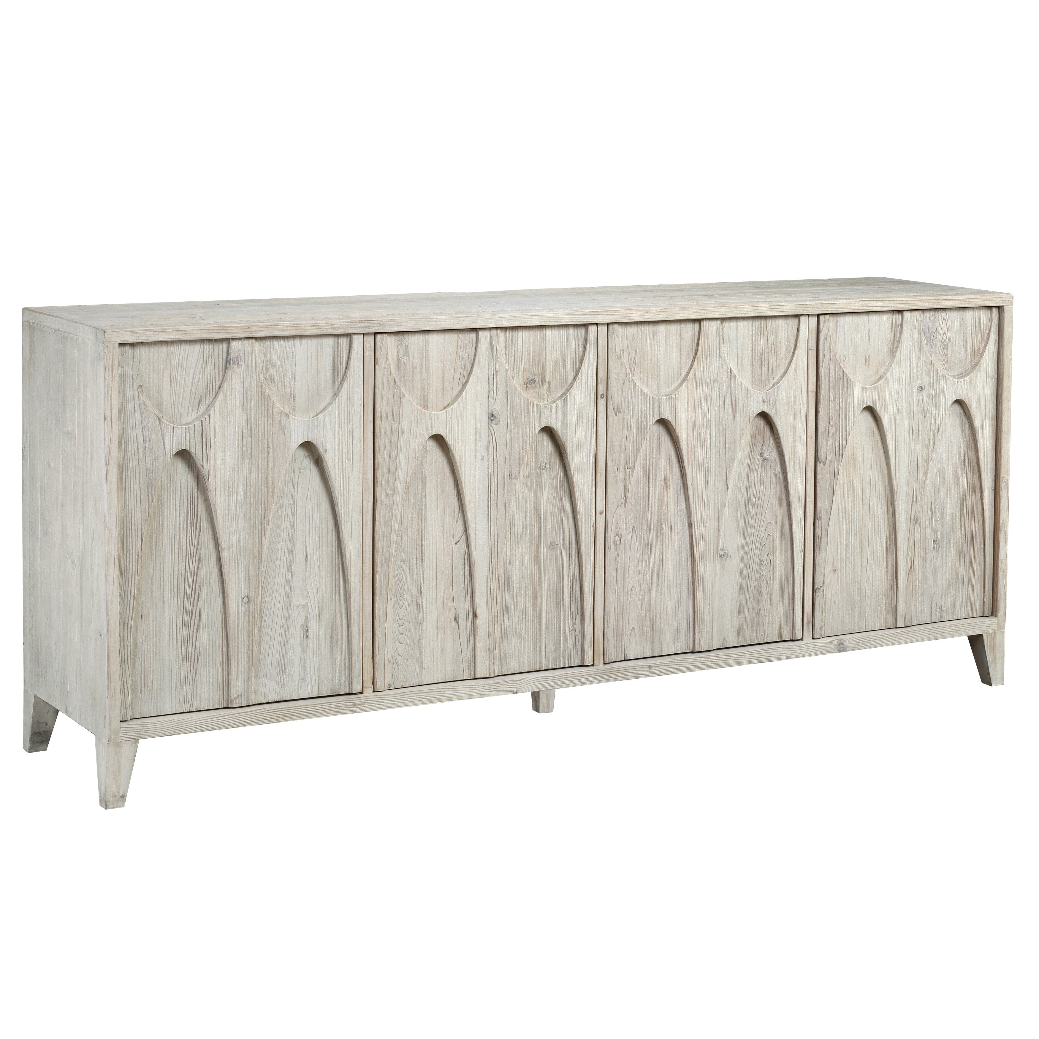 Add a mid-century flare to your home with this reclaimed pine sideboard. Made from solid reclaimed pine hardwood and standing 79 in length, this piece has 4 storage doors showcasing a hand carved curvy mid-century modern design that will levitate your space and wont skimp on storage.