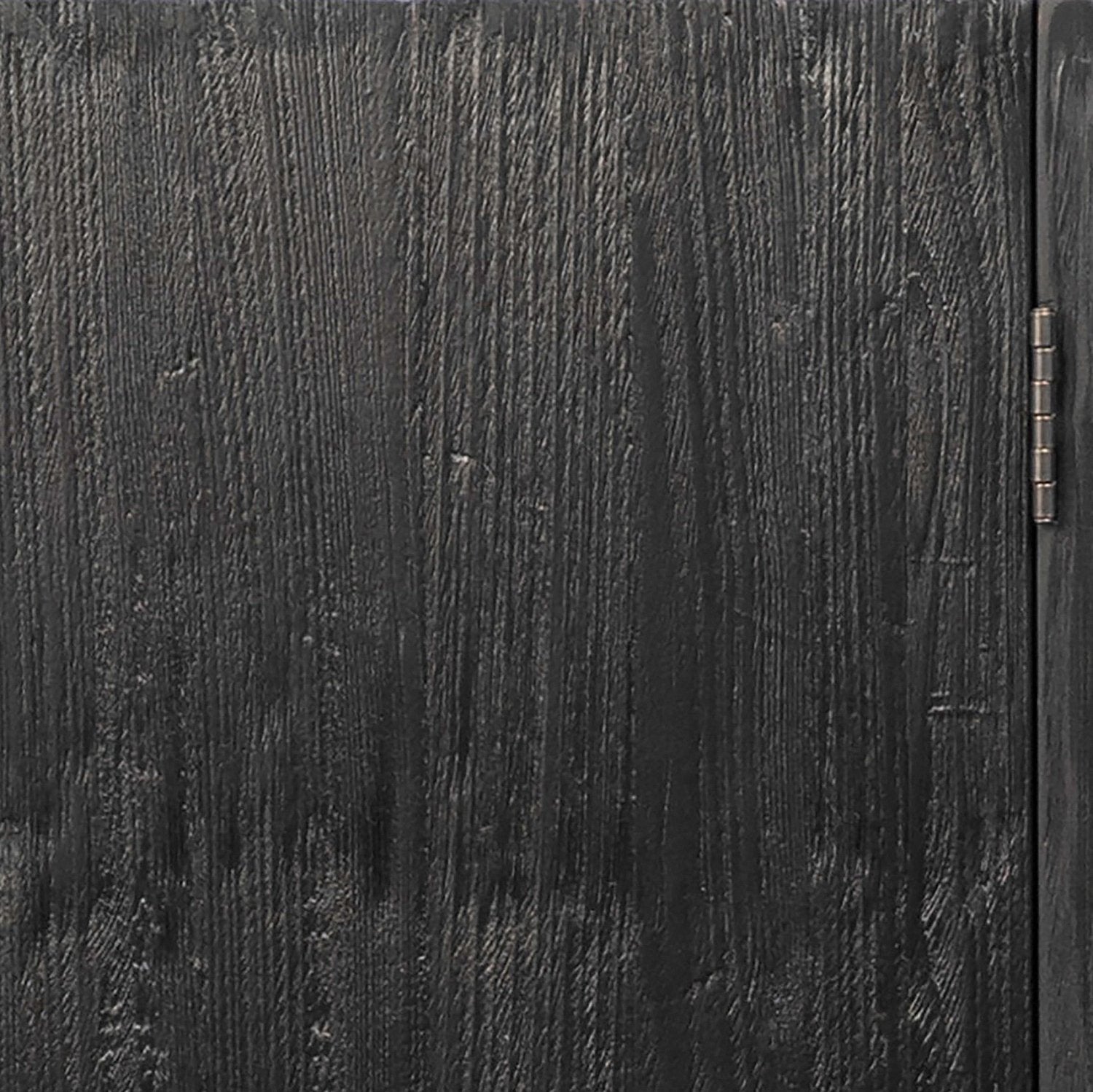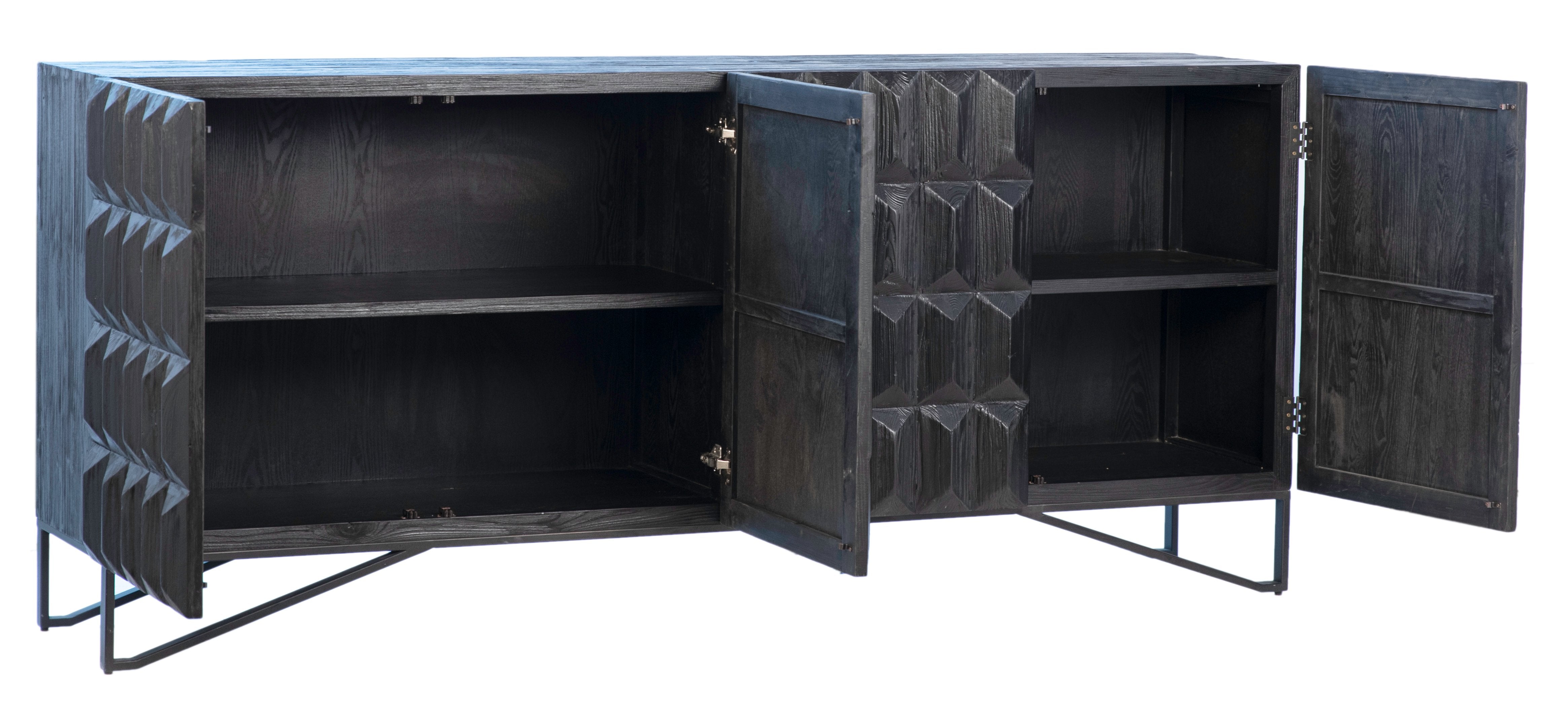 Bring contemporary style to your living space with this 84 sideboard. This versatile sideboard mixes materials and textures to create a striking design. Made from reclaimed pine wood in an edgy antique black finish. Featuring a stunning hand-carved design on each of the four doors that open to find two built-in shelves for added storage. Sitting atop a black metal base for extra support, this sideboard is equal parts durable, functional, and stylish.