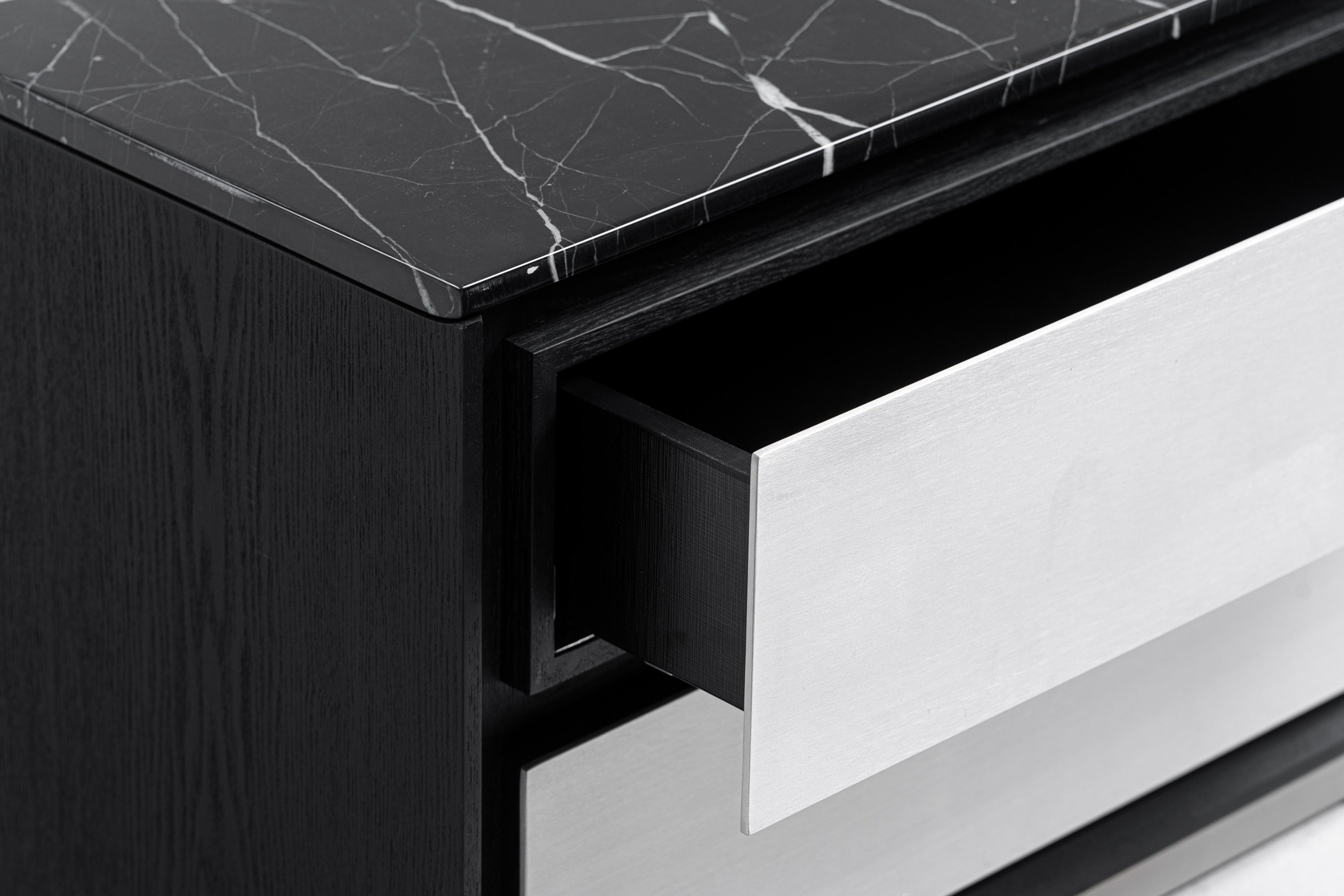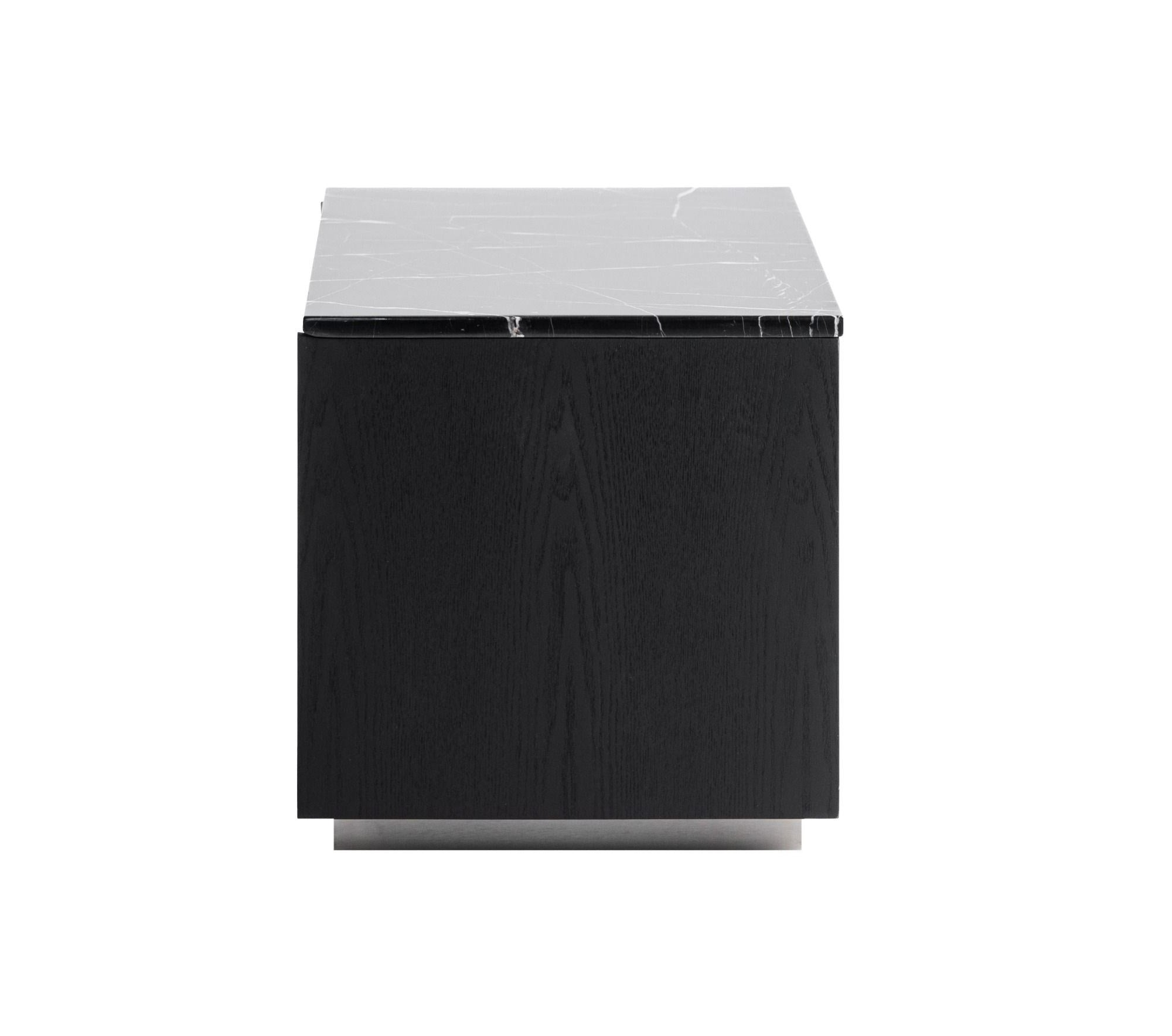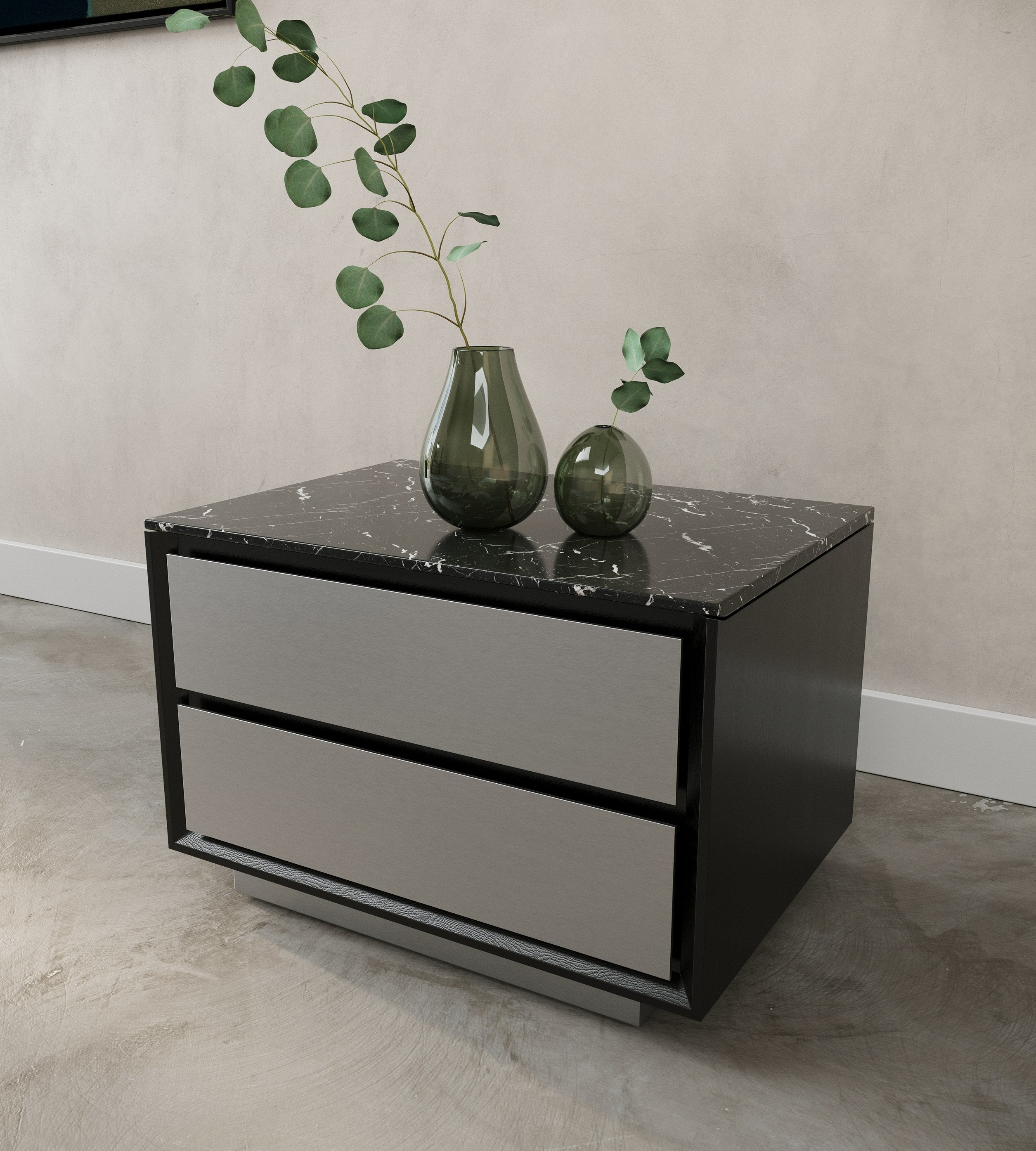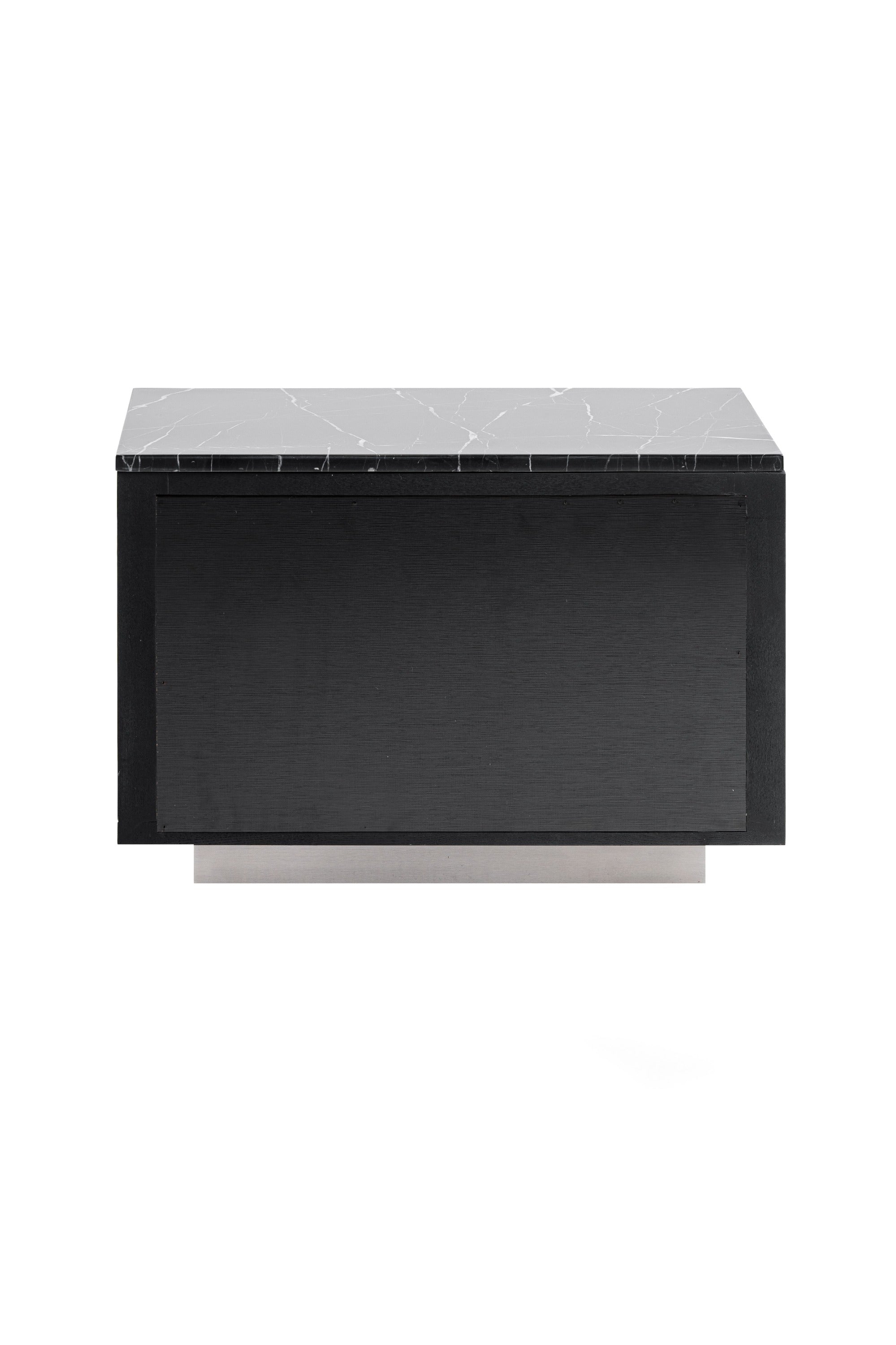 The Modrest Concord Nightstand features a striking modern design with a luxurious black marble top that showcases elegant white veining. Its sleek black ash body complements the contemporary aesthetic, while two spacious drawers with aluminum facades provide ample storage. The minimalist silhouette exudes sophistication, enhanced by a polished base that adds a touch of refinement. This nightstand seamlessly blends functionality with style, making it an ideal addition to any modern bedroom.
