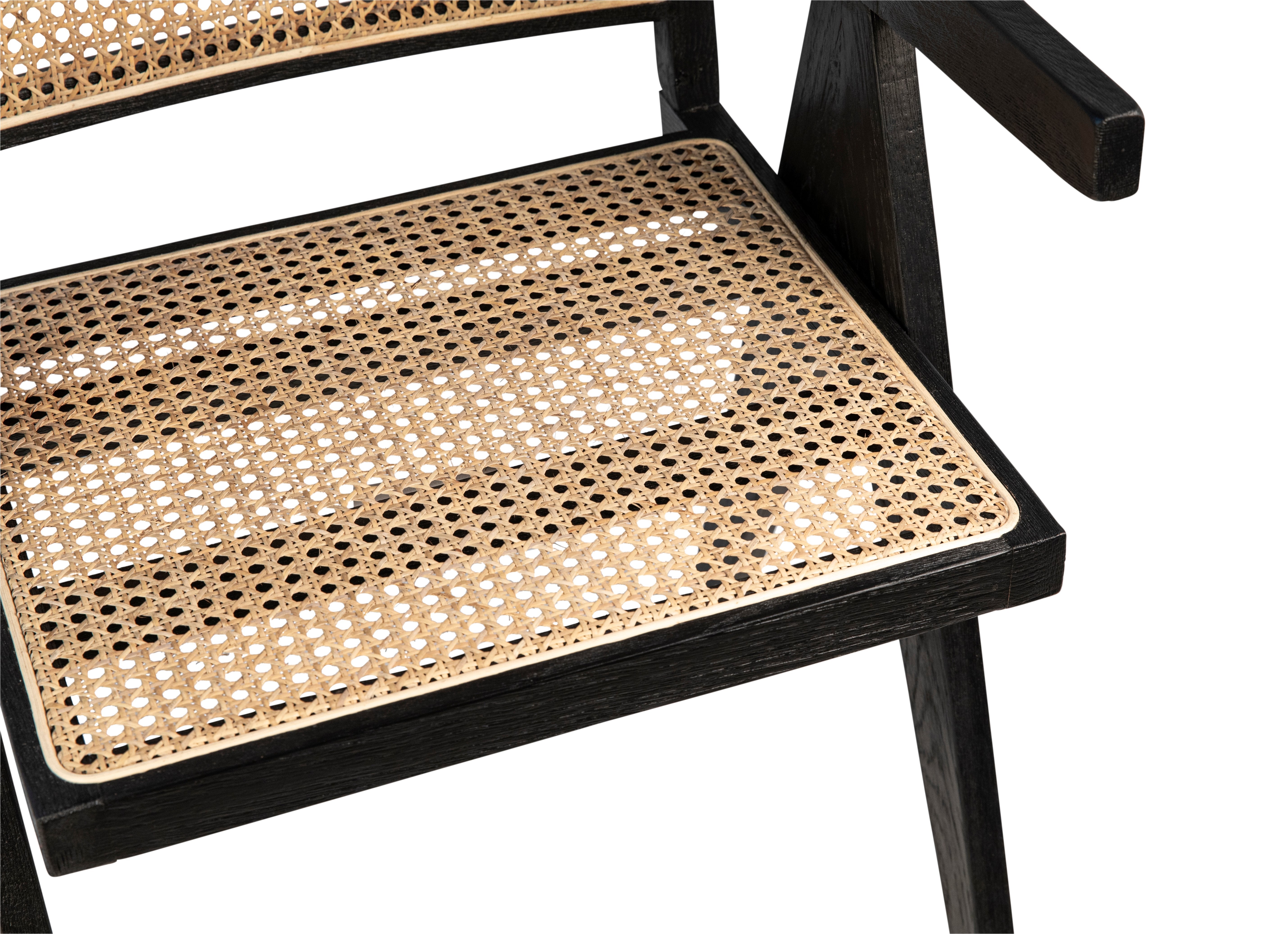 Finished in an antique black and natural rattan, this beautiful arm chair is modern with a tropical flare. Made of solid Oak Hardwood and Rattan, this two-toned chair is the perfect accent to any room or dining table.