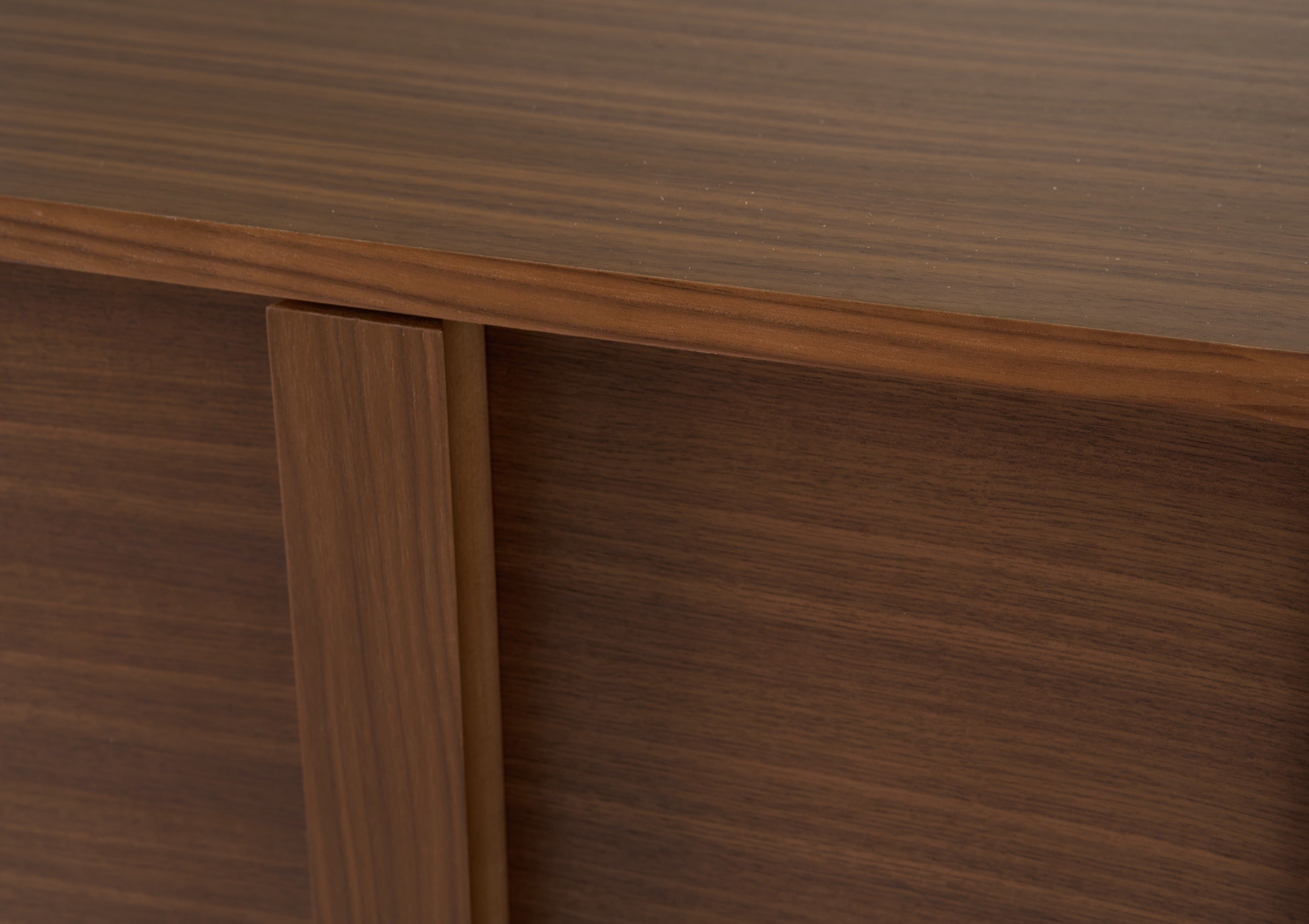 This five-drawer modern walnut chest will provide ample storage room. Each drawer features an integrated wood pull, which adds an extra element of style. There's a rich walnut-finished veneer on the chest, too, which adds warmth.