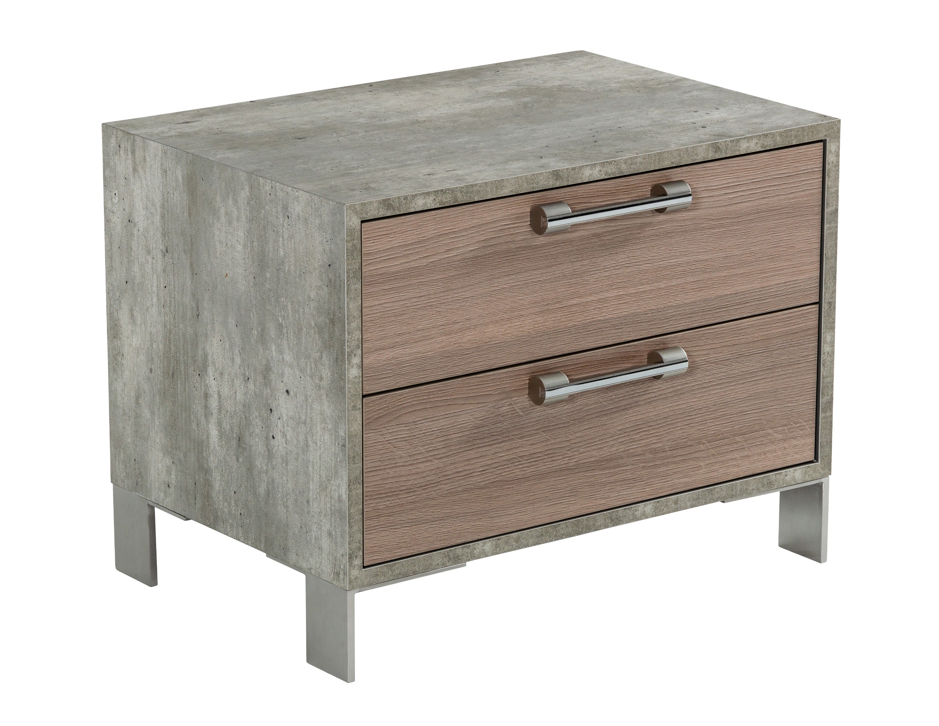 Faux concrete laminate surrounds the stylish clean lines of the Boston Nightstand, creating an engaging juxtaposition. Stylish stainless-steel handles adorn the two soft closing drawers, faced with brown oak laminate. Finished with matching stainless-steel legs, this piece is the perfect staple for your urban home. Pair with the Boston Bed, Dresser, Chest, and Mirror for a complete set.