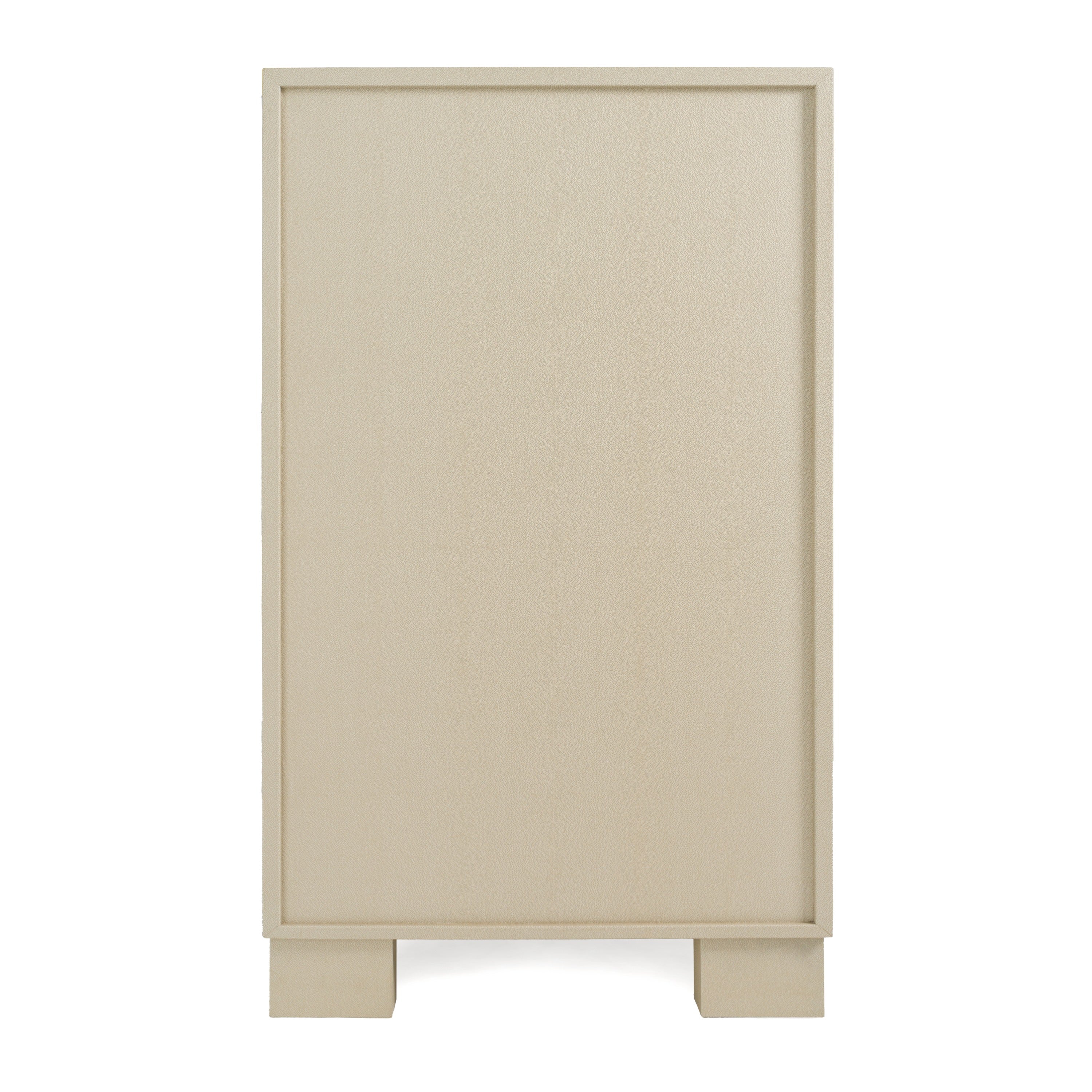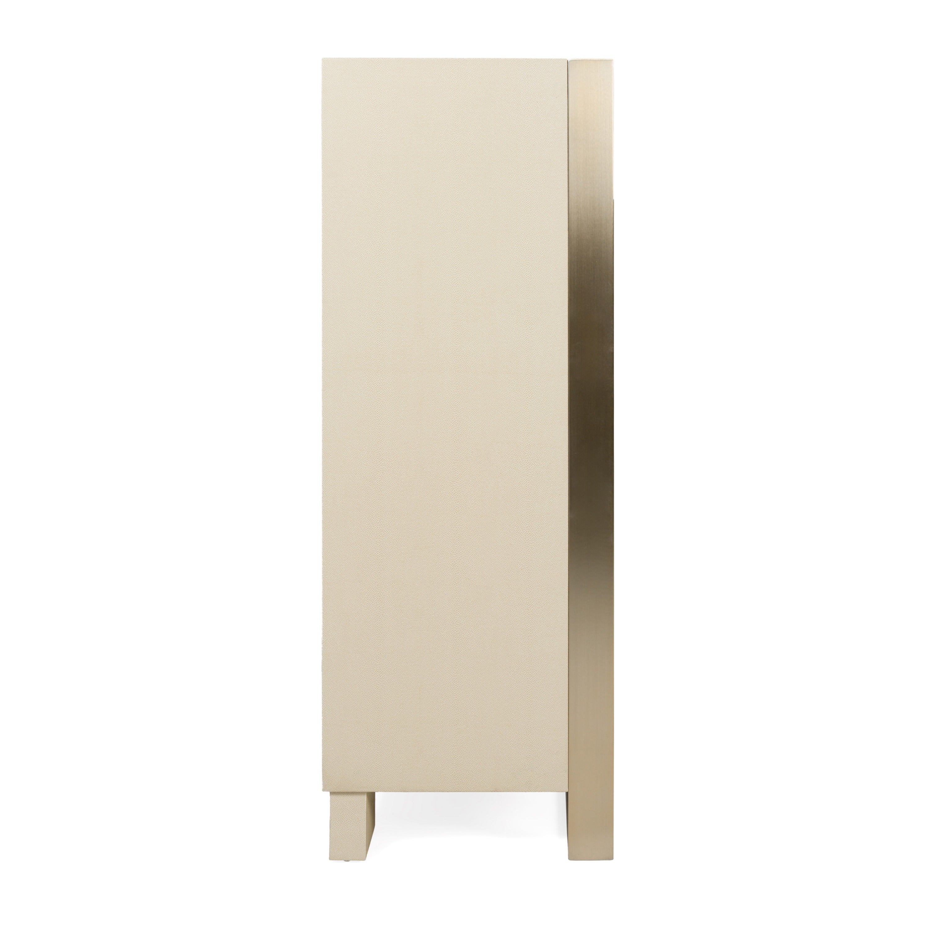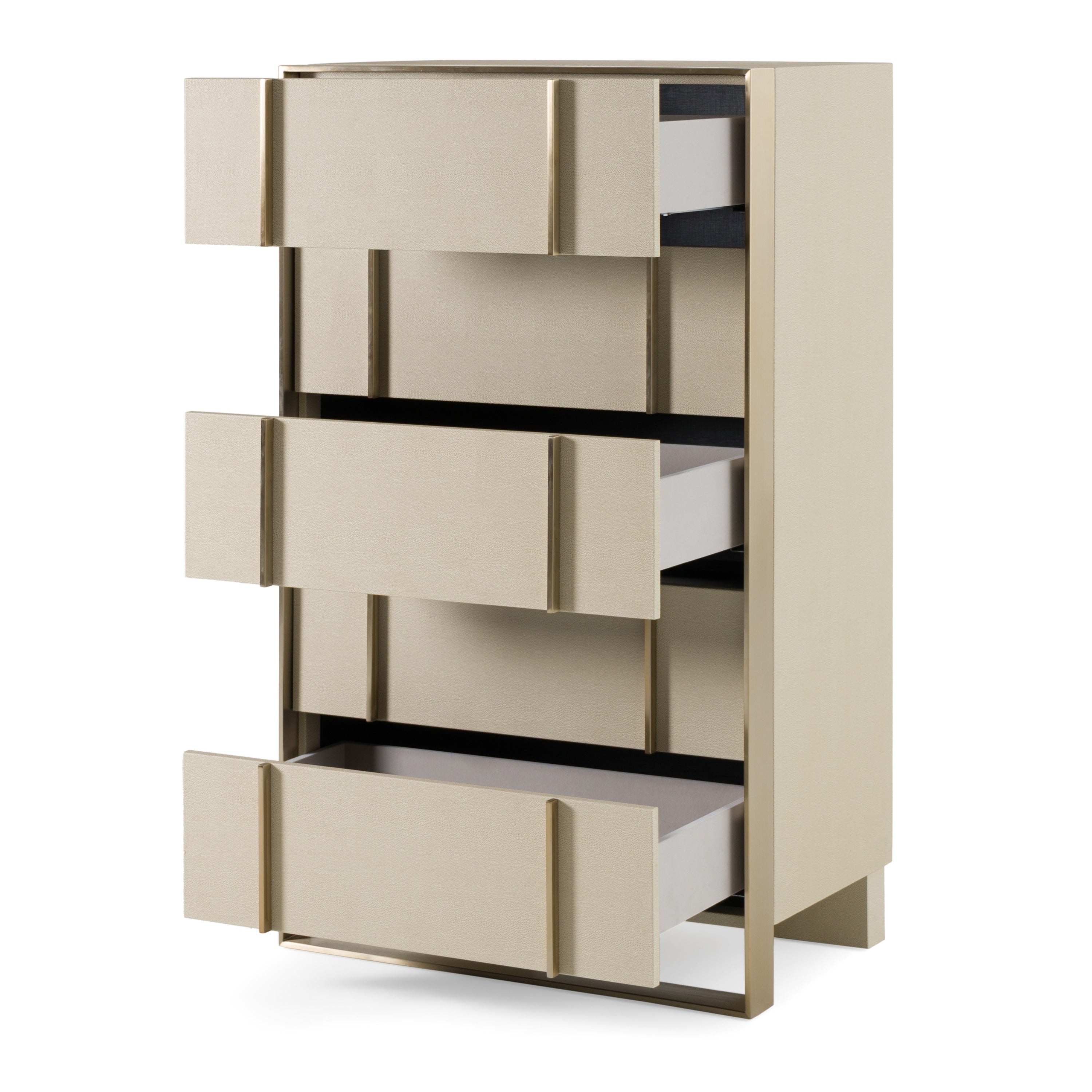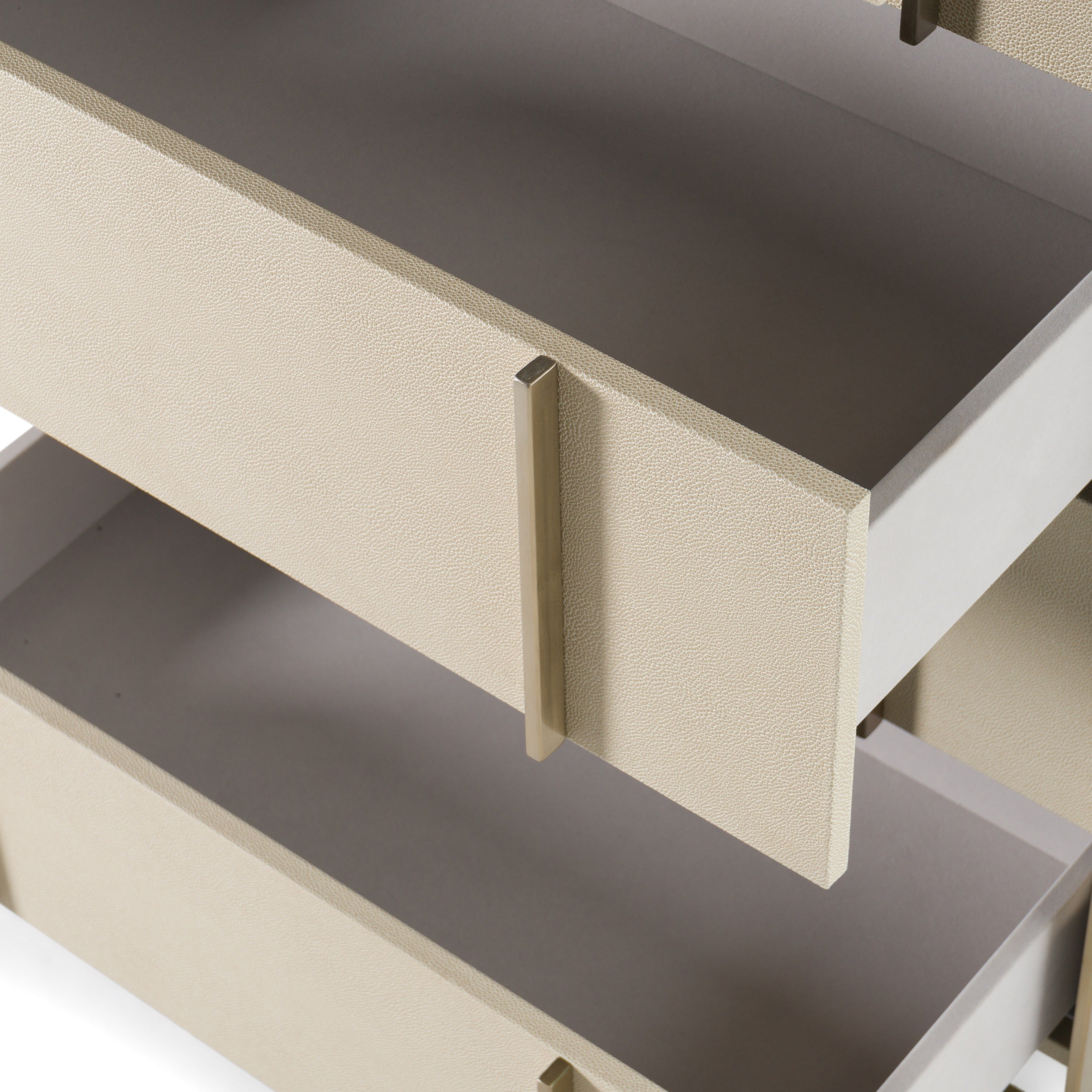 The Nova Domus Cartier Modern Beige Shagreen and Brushed Brass Chest is a stunning piece of furniture that combines elegance and functionality. Crafted with attention to detail, it features beige shagreen bonded leather on its surface, exuding a luxurious texture. The chest boasts five drawers, providing ample storage space for your belongings. The brushed brass finish adds a touch of sophistication, making it a perfect addition to any modern home. Fully assembled and ready to enhance your living space, this chest is a credit to its brilliant designer.