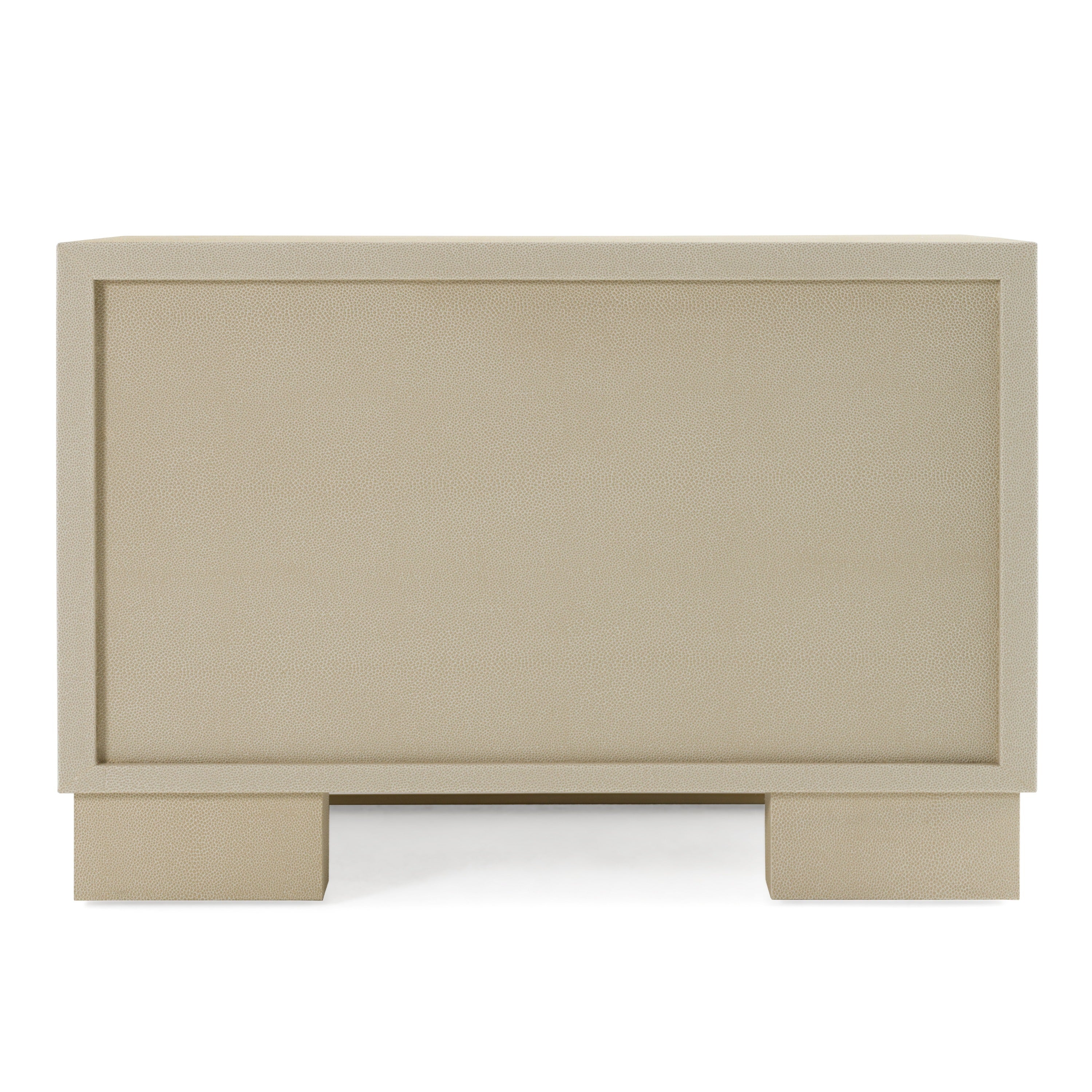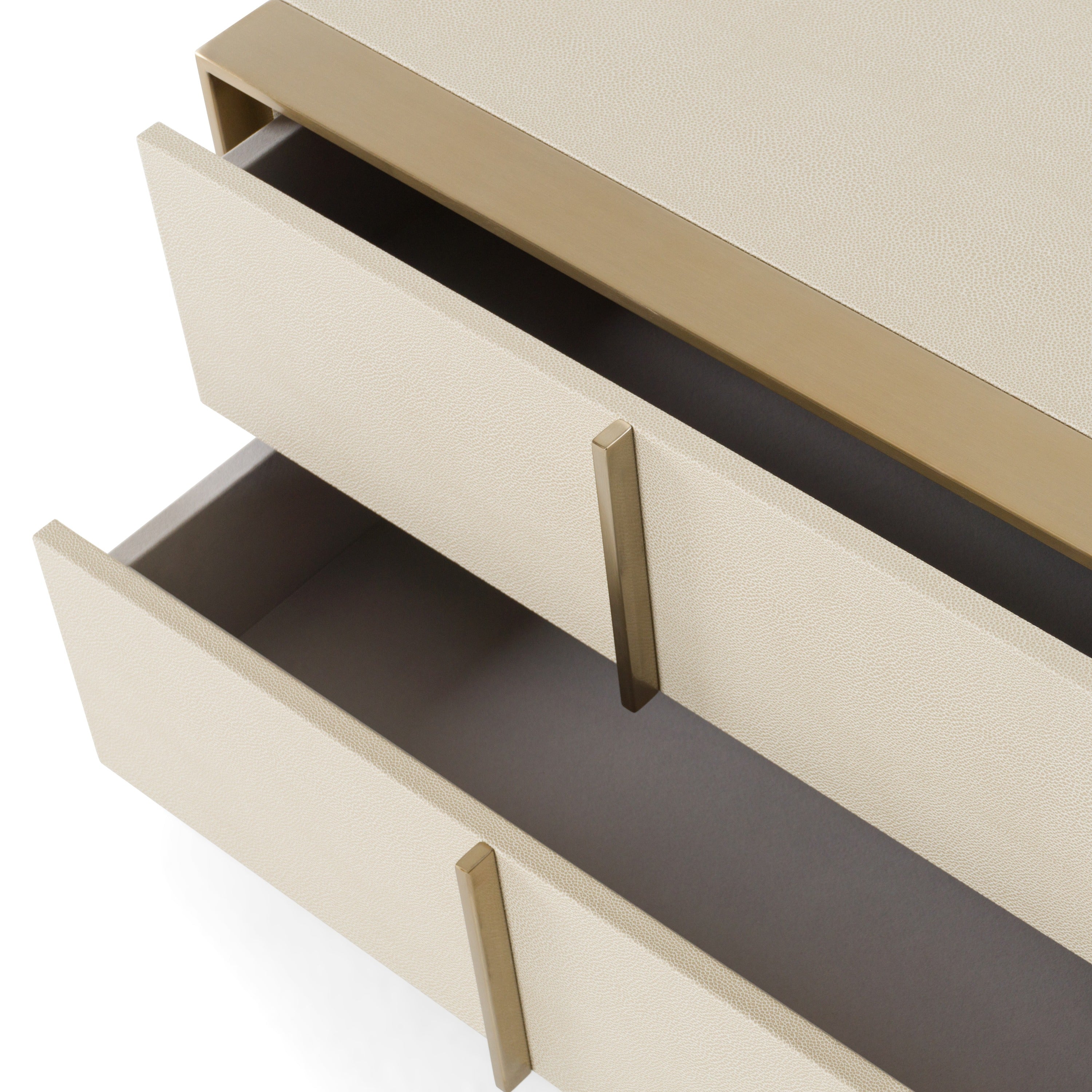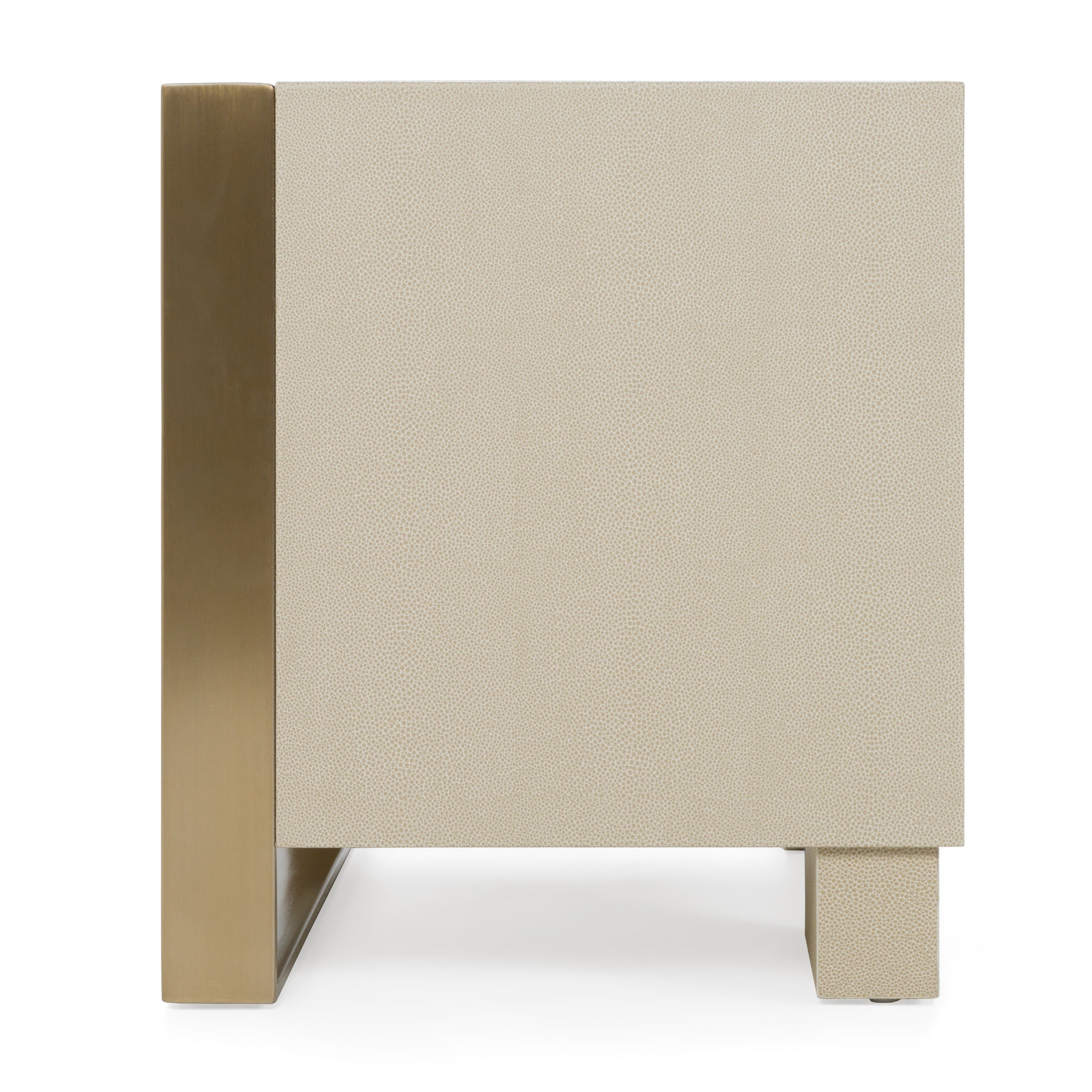The Nova Domus Cartier Modern Beige Shagreen and Brushed Brass Nightstand is a stunning piece of furniture that combines elegance and functionality. Crafted with attention to detail, it features beige shagreen bonded leather on its surface, exuding a luxurious texture. The Nightstand contains two drawers, providing ample storage space for your belongings. The brushed brass finish adds a touch of sophistication, making it a perfect addition to any modern home. Fully assembled and ready to enhance your living space, this nightstand is a credit to its brilliant designer.