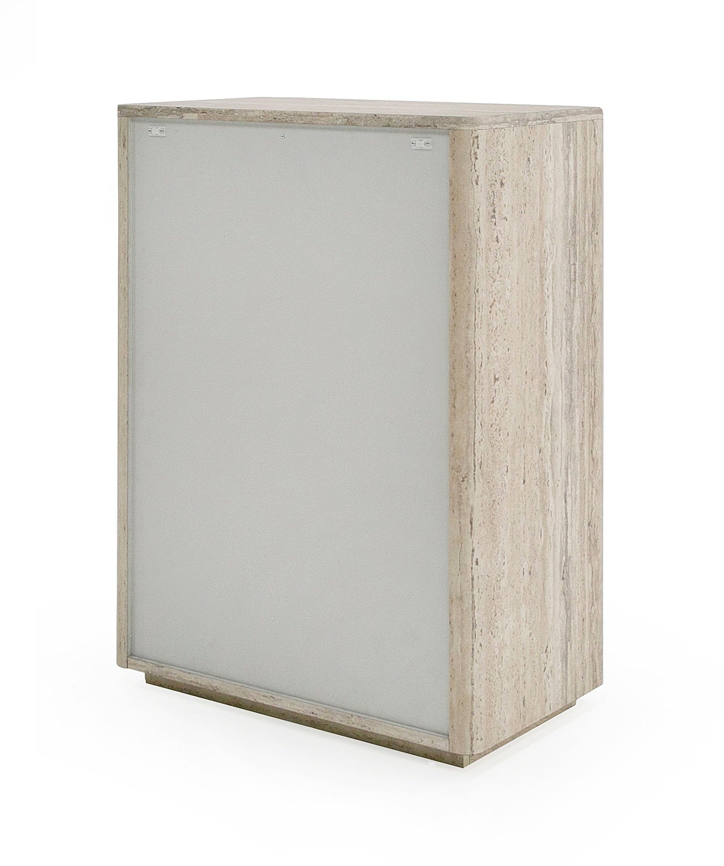 The Roma Chest comes from our new Roma Bedroom collection! This vertical chest features four drawers with soft/self closing drawers and elegant golden metal handles. The surface of the piece is a faux travertine laminate finish all over. The Roma Chest combines excellent quality material and suburb design that makes it a stunner in any bedroom space. The Roma collection also includes a dresser, mirror and nightstand as well as matching living, dining and office furniture!