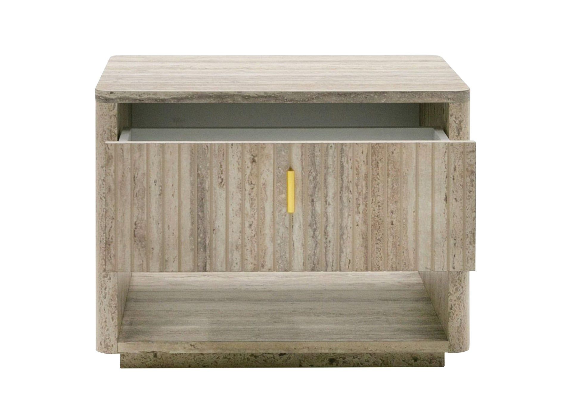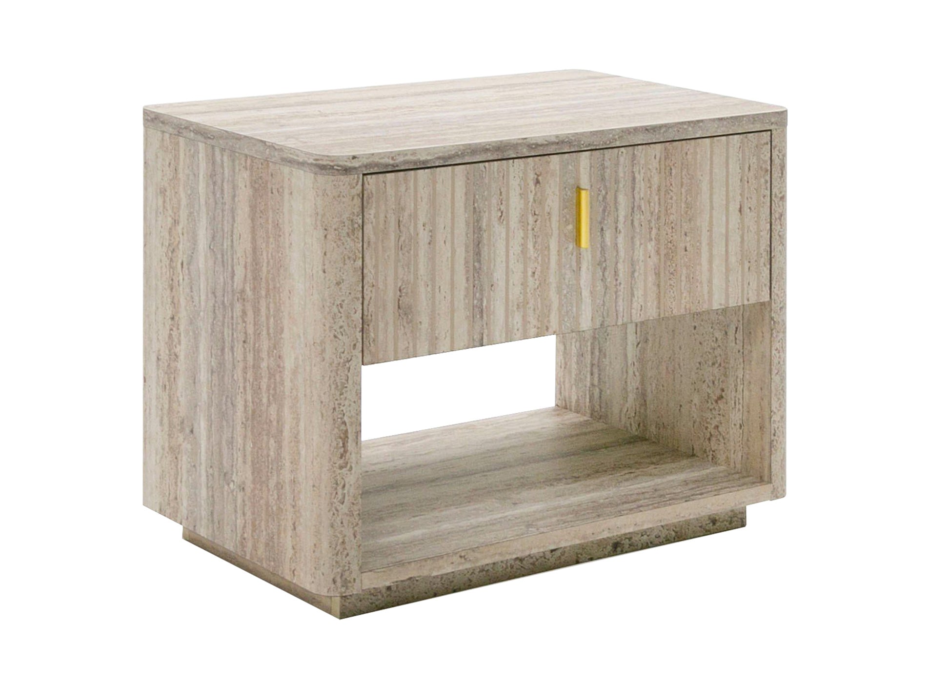 The Roma Nightstand comes from our new Roma Bedroom collection! This nightstand features a single drawer with soft/self-closing drawer, elegant golden metal handle and a lower open shelf for the option of additional storage. The surface of the piece is a faux travertine finish all over. The Roma Nightstand combines excellent quality material and suburb design that makes it a stunner in any bedroom space. The Roma collection also includes a chest, mirror and dresser as well as matching living, dining and office furniture!