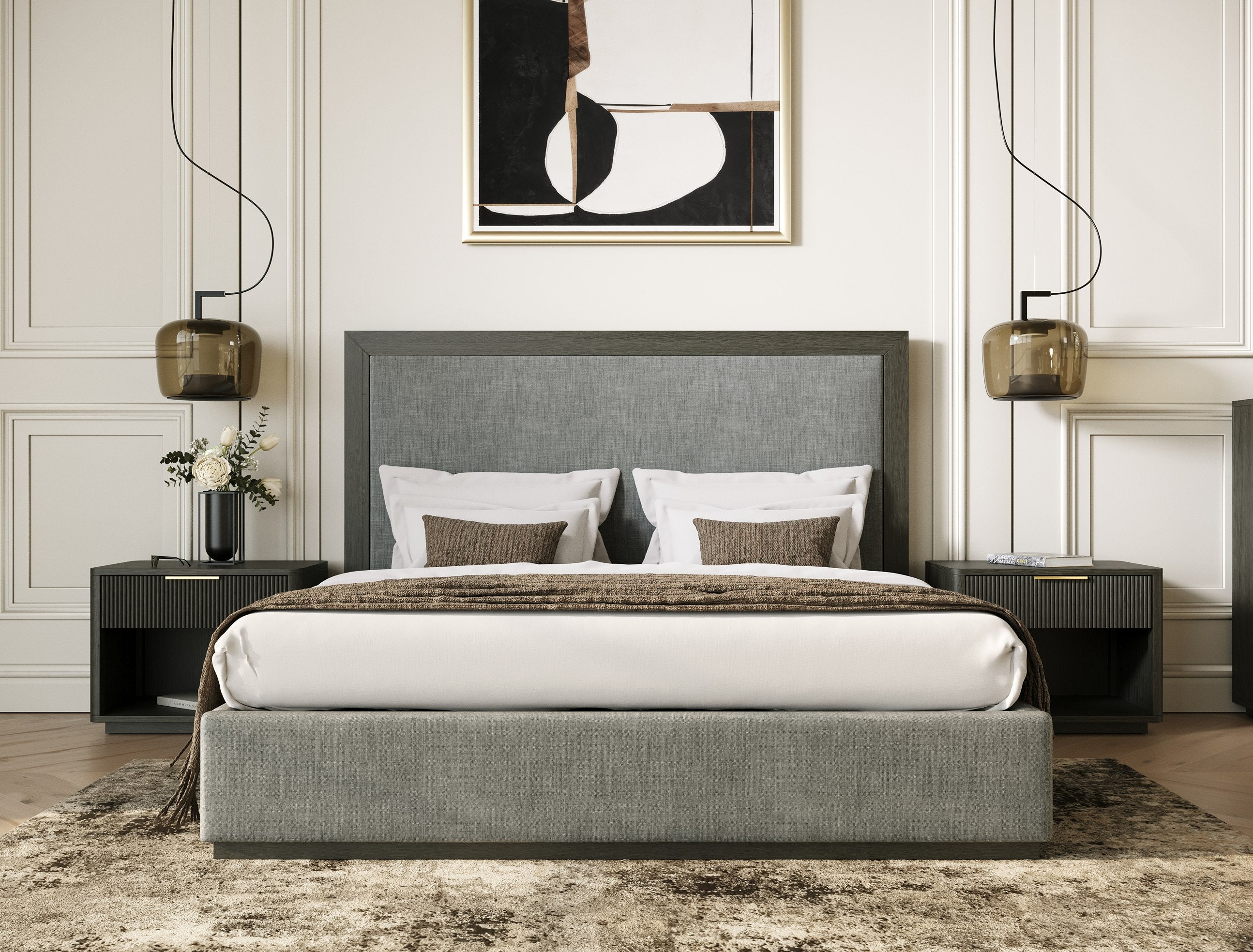 The Nova Domus Santa Barbara bed exudes modern elegance with its sleek grey fabric upholstery and sophisticated grey wash structure. The oversized, upholstered headboard provides a striking focal point, while the clean lines and minimalist design enhance contemporary aesthetics. Its neutral tones seamlessly blend into various decor themes, making it a versatile choice for any bedroom. The bed s sleek base adds to its streamlined look, creating a serene and inviting atmosphere for relaxation and rest.