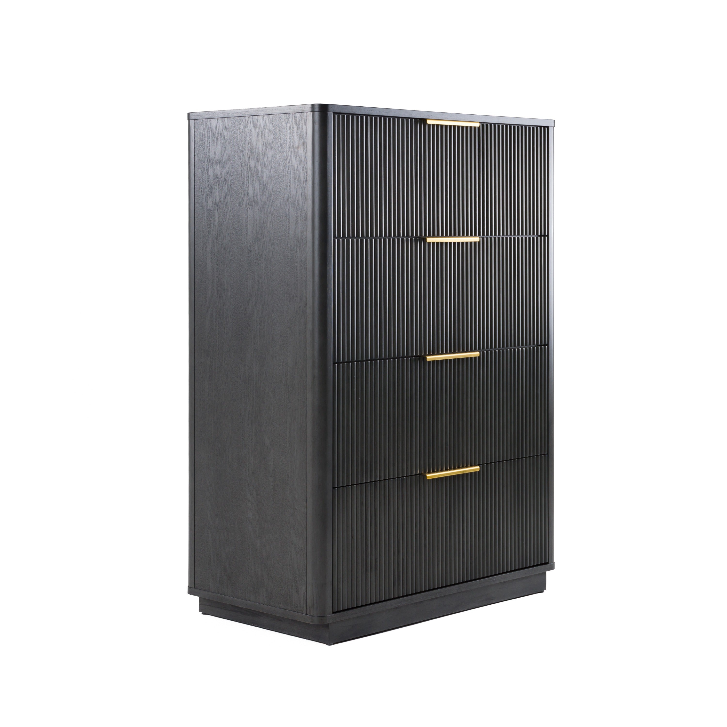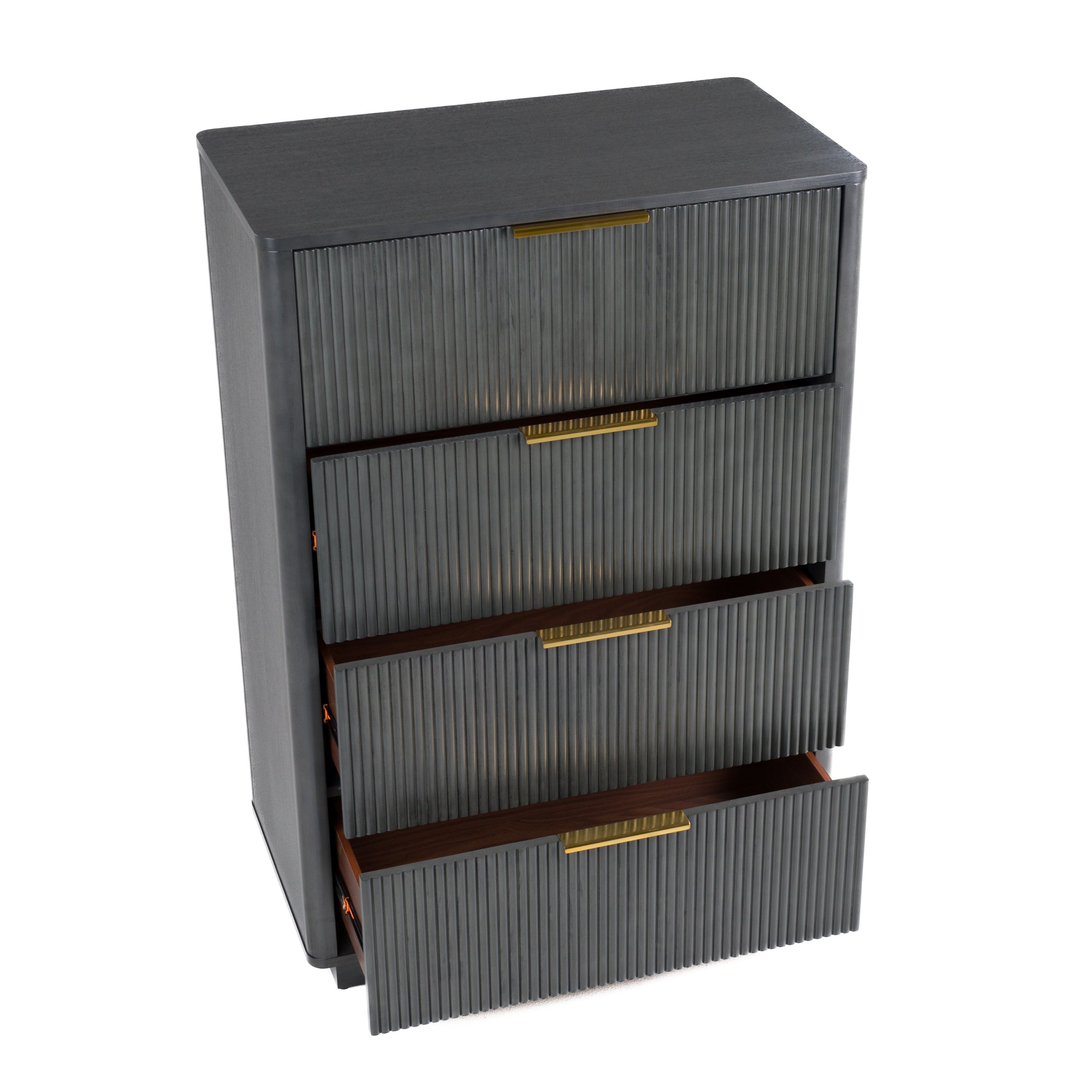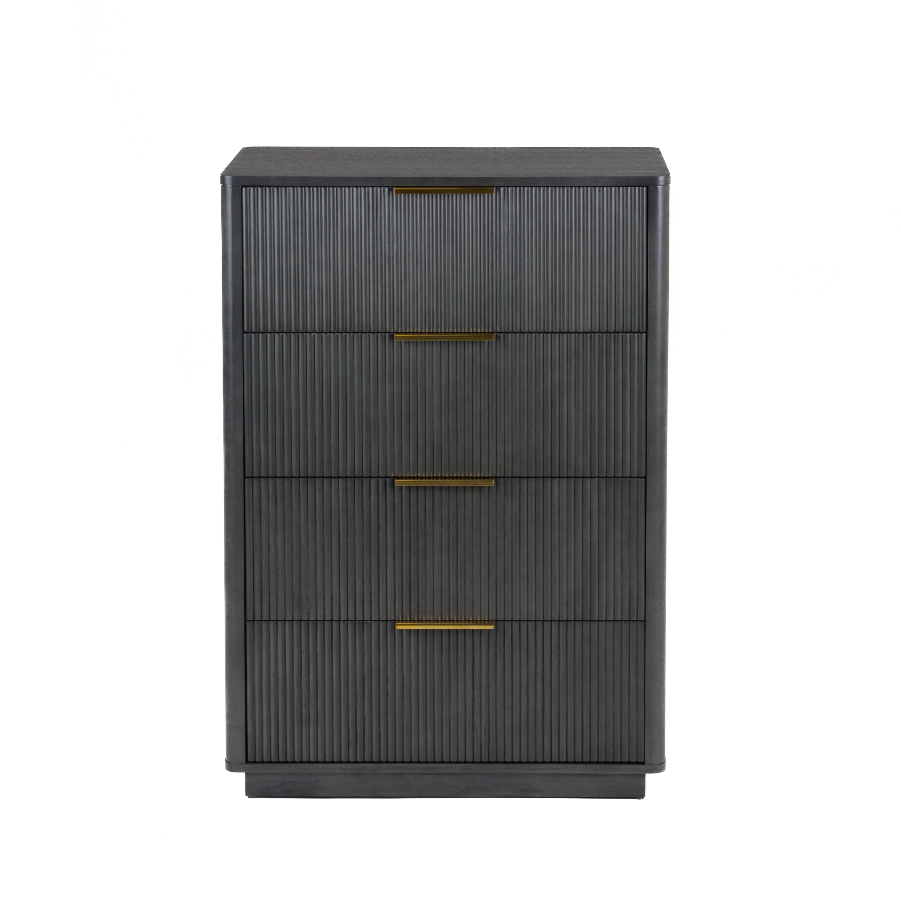 The Nova Domus Santa Monica Modern Grey Wash Chest combines contemporary elegance with functional design. Finished in a sleek grey wash, its textured, ribbed facade adds depth and visual interest, while the brass handles offer a touch of sophistication. This chest features four spacious drawers, perfect for organizing clothing or accessories, seamlessly blending style and practicality. Its minimalist silhouette makes it a versatile addition to any modern space, enhancing both aesthetics and utility.