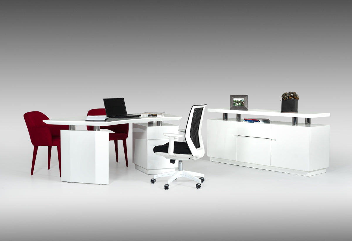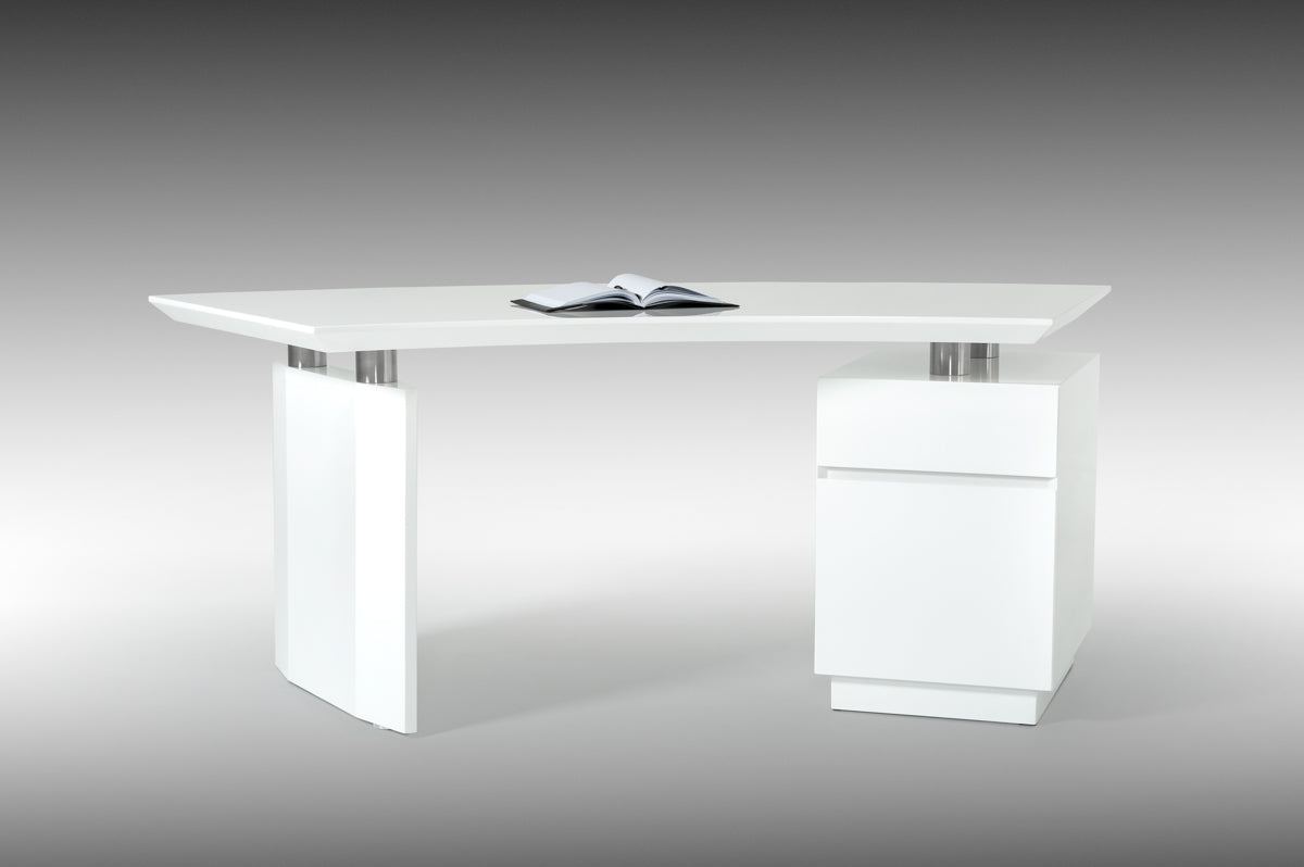 The Modrest Stanford Modern White Office Desk features an impressive crescent-shaped top in white high gloss finish. Offering that much-needed office organization are two drawers with stainless steel accents and a cabinet with a dimension of W55" x D20" x H24". This modern office desk has a dimension of W59" x D24" x H30" and requires some assembly.