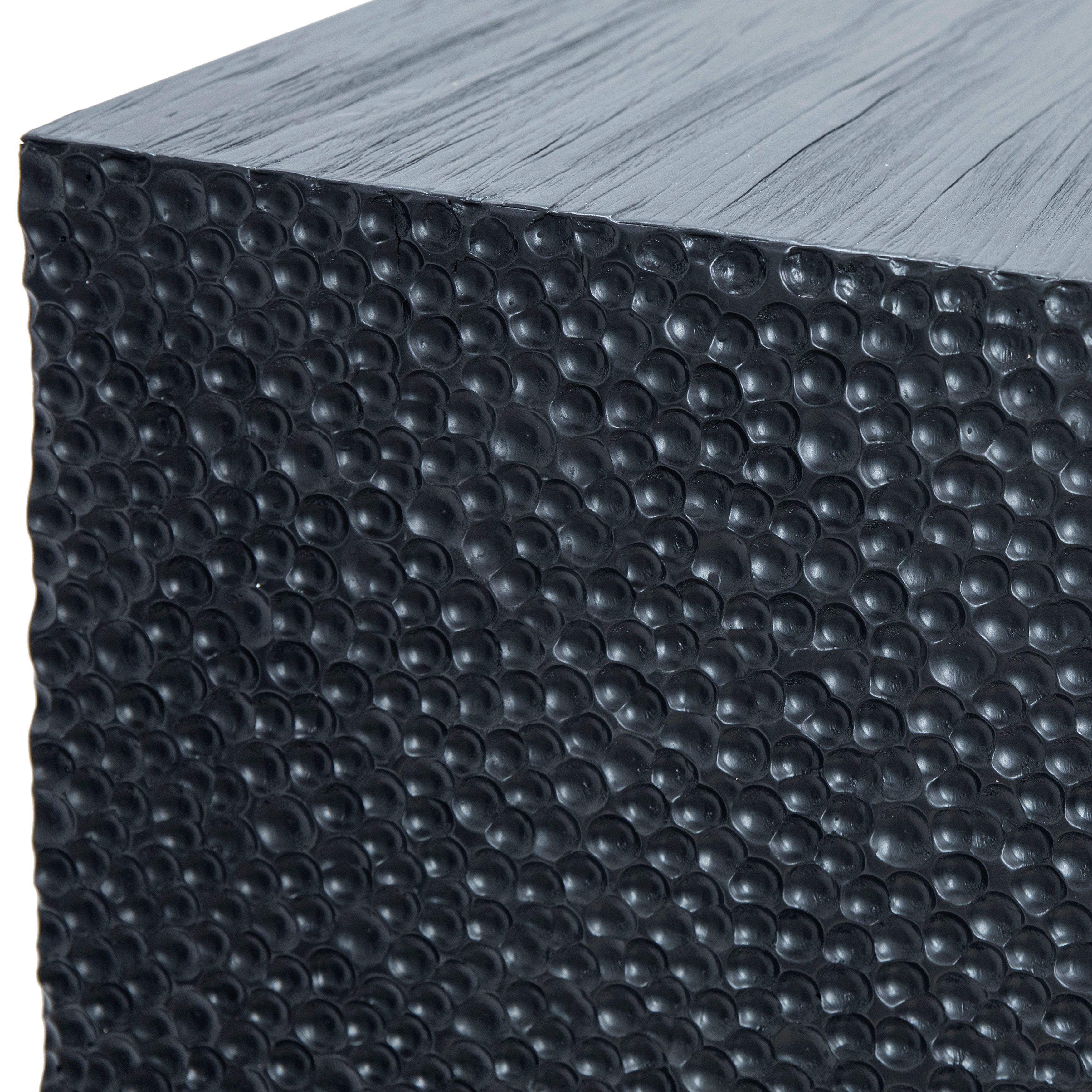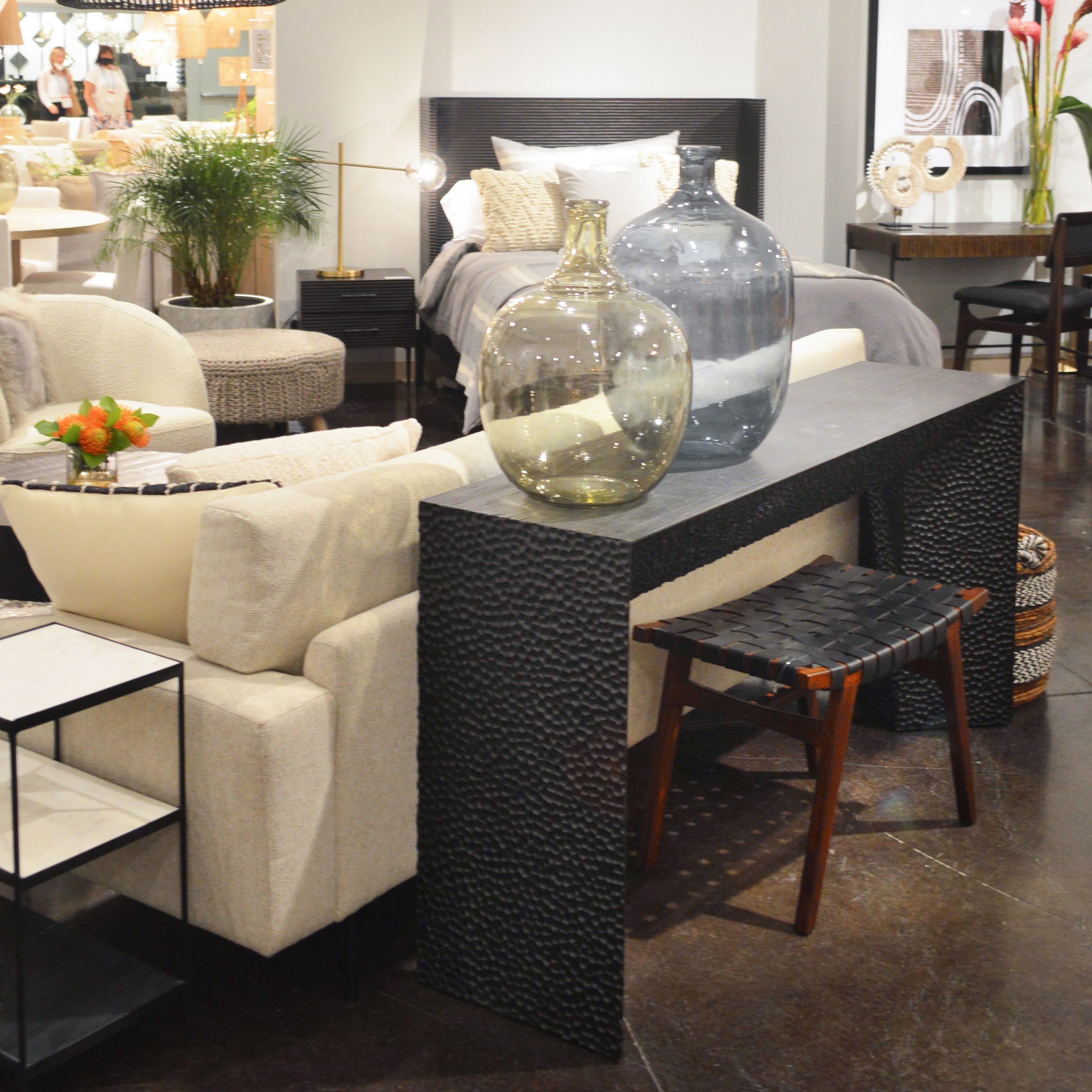 Beachy breezes are joined with contemporary style in this charming console table. Featuring a unique beveled texture pattern around all sides that begs to be touched. Measuring 65 in length, this simple silhouette is made from pine wood in a rich, black sealed finish.