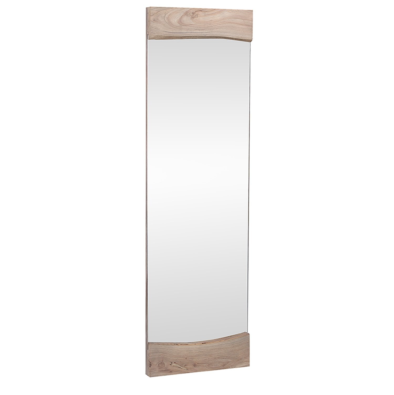 Bring light and texture to your space with this contemporary floor mirror. Highlighting the unique, organic beauty of the reclaimed wood in a light warm wash finish. Assembled with a live-edge detail, measuring 71" tall and 22". The color and character of the wood grain, natural cracks, and knots may vary, adding a distinctive character to each piece.